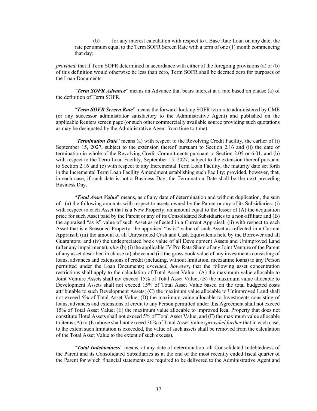 37 (b) for any interest calculation with respect to a Base Rate Loan on any date, the rate per annum equal to the Term SOFR Screen Rate with a term of one (1) month commencing that day; provided, that if Term SOFR determined in accordance with either of the foregoing provisions (a) or (b) of this definition would otherwise be less than zero, Term SOFR shall be deemed zero for purposes of the Loan Documents. “Term SOFR Advance” means an Advance that bears interest at a rate based on clause (a) of the definition of Term SOFR. “Term SOFR Screen Rate” means the forward-looking SOFR term rate administered by CME (or any successor administrator satisfactory to the Administrative Agent) and published on the applicable Reuters screen page (or such other commercially available source providing such quotations as may be designated by the Administrative Agent from time to time). “Termination Date” means (a) with respect to the Revolving Credit Facility, the earlier of (i) September 15, 2027, subject to the extension thereof pursuant to Section 2.16 and (ii) the date of termination in whole of the Revolving Credit Commitments pursuant to Section 2.05 or 6.01, and (b) with respect to the Term Loan Facility, September 15, 2027, subject to the extension thereof pursuant to Section 2.16 and (c) with respect to any Incremental Term Loan Facility, the maturity date set forth in the Incremental Term Loan Facility Amendment establishing such Facility; provided, however, that, in each case, if such date is not a Business Day, the Termination Date shall be the next preceding Business Day. “Total Asset Value” means, as of any date of determination and without duplication, the sum of: (a) the following amounts with respect to assets owned by the Parent or any of its Subsidiaries: (i) with respect to each Asset that is a New Property, an amount equal to the lesser of (A) the acquisition price for such Asset paid by the Parent or any of its Consolidated Subsidiaries to a non-affiliate and (B) the appraised “as is” value of such Asset as reflected in a Current Appraisal; (ii) with respect to each Asset that is a Seasoned Property, the appraised “as is” value of such Asset as reflected in a Current Appraisal; (iii) the amount of all Unrestricted Cash and Cash Equivalents held by the Borrower and all Guarantors; and (iv) the undepreciated book value of all Development Assets and Unimproved Land (after any impairments); plus (b) (i) the applicable JV Pro Rata Share of any Joint Venture of the Parent of any asset described in clause (a) above and (ii) the gross book value of any investments consisting of loans, advances and extensions of credit (including, without limitation, mezzanine loans) to any Person permitted under the Loan Documents; provided, however, that the following asset concentration restrictions shall apply to the calculation of Total Asset Value: (A) the maximum value allocable to Joint Venture Assets shall not exceed 15% of Total Asset Value; (B) the maximum value allocable to Development Assets shall not exceed 15% of Total Asset Value based on the total budgeted costs attributable to such Development Assets; (C) the maximum value allocable to Unimproved Land shall not exceed 5% of Total Asset Value; (D) the maximum value allocable to Investments consisting of loans, advances and extensions of credit to any Person permitted under this Agreement shall not exceed 15% of Total Asset Value; (E) the maximum value allocable to improved Real Property that does not constitute Hotel Assets shall not exceed 5% of Total Asset Value; and (F) the maximum value allocable to items (A) to (E) above shall not exceed 30% of Total Asset Value (provided further that in each case, to the extent such limitation is exceeded, the value of such assets shall be removed from the calculation of the Total Asset Value to the extent of such excess). “Total Indebtedness” means, at any date of determination, all Consolidated Indebtedness of the Parent and its Consolidated Subsidiaries as at the end of the most recently ended fiscal quarter of the Parent for which financial statements are required to be delivered to the Administrative Agent and