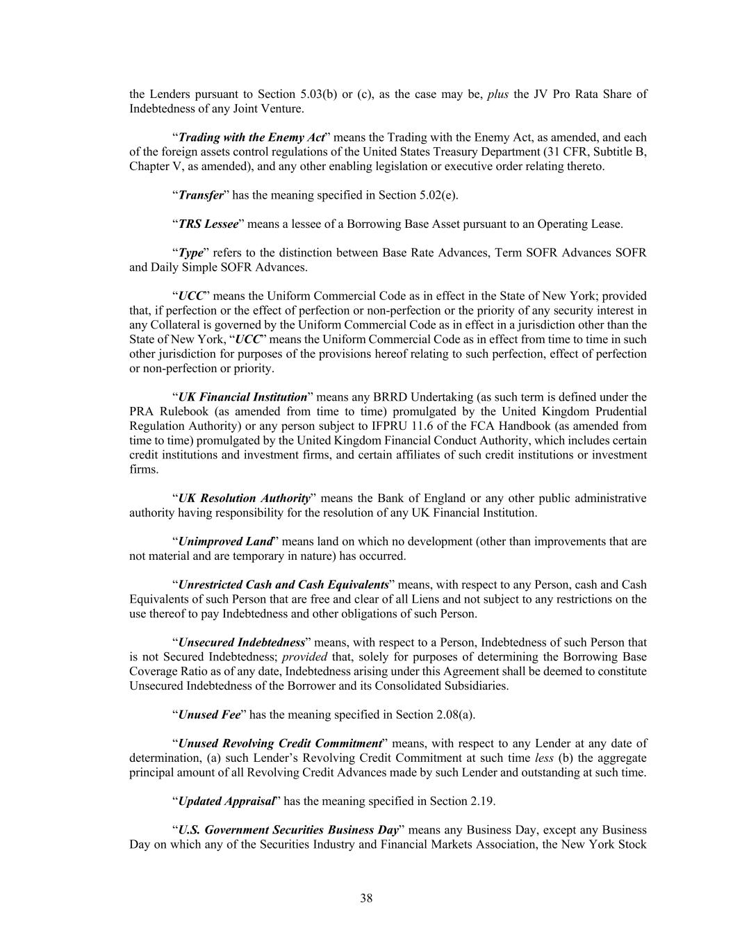 38 the Lenders pursuant to Section 5.03(b) or (c), as the case may be, plus the JV Pro Rata Share of Indebtedness of any Joint Venture. “Trading with the Enemy Act” means the Trading with the Enemy Act, as amended, and each of the foreign assets control regulations of the United States Treasury Department (31 CFR, Subtitle B, Chapter V, as amended), and any other enabling legislation or executive order relating thereto. “Transfer” has the meaning specified in Section 5.02(e). “TRS Lessee” means a lessee of a Borrowing Base Asset pursuant to an Operating Lease. “Type” refers to the distinction between Base Rate Advances, Term SOFR Advances SOFR and Daily Simple SOFR Advances. “UCC” means the Uniform Commercial Code as in effect in the State of New York; provided that, if perfection or the effect of perfection or non-perfection or the priority of any security interest in any Collateral is governed by the Uniform Commercial Code as in effect in a jurisdiction other than the State of New York, “UCC” means the Uniform Commercial Code as in effect from time to time in such other jurisdiction for purposes of the provisions hereof relating to such perfection, effect of perfection or non-perfection or priority. “UK Financial Institution” means any BRRD Undertaking (as such term is defined under the PRA Rulebook (as amended from time to time) promulgated by the United Kingdom Prudential Regulation Authority) or any person subject to IFPRU 11.6 of the FCA Handbook (as amended from time to time) promulgated by the United Kingdom Financial Conduct Authority, which includes certain credit institutions and investment firms, and certain affiliates of such credit institutions or investment firms. “UK Resolution Authority” means the Bank of England or any other public administrative authority having responsibility for the resolution of any UK Financial Institution. “Unimproved Land” means land on which no development (other than improvements that are not material and are temporary in nature) has occurred. “Unrestricted Cash and Cash Equivalents” means, with respect to any Person, cash and Cash Equivalents of such Person that are free and clear of all Liens and not subject to any restrictions on the use thereof to pay Indebtedness and other obligations of such Person. “Unsecured Indebtedness” means, with respect to a Person, Indebtedness of such Person that is not Secured Indebtedness; provided that, solely for purposes of determining the Borrowing Base Coverage Ratio as of any date, Indebtedness arising under this Agreement shall be deemed to constitute Unsecured Indebtedness of the Borrower and its Consolidated Subsidiaries. “Unused Fee” has the meaning specified in Section 2.08(a). “Unused Revolving Credit Commitment” means, with respect to any Lender at any date of determination, (a) such Lender’s Revolving Credit Commitment at such time less (b) the aggregate principal amount of all Revolving Credit Advances made by such Lender and outstanding at such time. “Updated Appraisal” has the meaning specified in Section 2.19. “U.S. Government Securities Business Day” means any Business Day, except any Business Day on which any of the Securities Industry and Financial Markets Association, the New York Stock