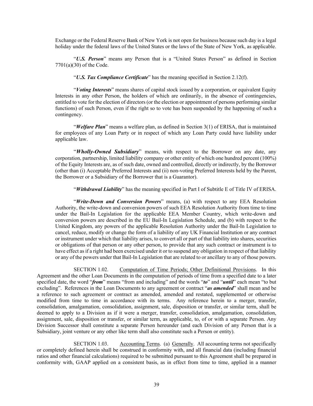 39 Exchange or the Federal Reserve Bank of New York is not open for business because such day is a legal holiday under the federal laws of the United States or the laws of the State of New York, as applicable. “U.S. Person” means any Person that is a “United States Person” as defined in Section 7701(a)(30) of the Code. “U.S. Tax Compliance Certificate” has the meaning specified in Section 2.12(f). “Voting Interests” means shares of capital stock issued by a corporation, or equivalent Equity Interests in any other Person, the holders of which are ordinarily, in the absence of contingencies, entitled to vote for the election of directors (or the election or appointment of persons performing similar functions) of such Person, even if the right so to vote has been suspended by the happening of such a contingency. “Welfare Plan” means a welfare plan, as defined in Section 3(1) of ERISA, that is maintained for employees of any Loan Party or in respect of which any Loan Party could have liability under applicable law. “Wholly-Owned Subsidiary” means, with respect to the Borrower on any date, any corporation, partnership, limited liability company or other entity of which one hundred percent (100%) of the Equity Interests are, as of such date, owned and controlled, directly or indirectly, by the Borrower (other than (i) Acceptable Preferred Interests and (ii) non-voting Preferred Interests held by the Parent, the Borrower or a Subsidiary of the Borrower that is a Guarantor). “Withdrawal Liability” has the meaning specified in Part I of Subtitle E of Title IV of ERISA. “Write-Down and Conversion Powers” means, (a) with respect to any EEA Resolution Authority, the write-down and conversion powers of such EEA Resolution Authority from time to time under the Bail-In Legislation for the applicable EEA Member Country, which write-down and conversion powers are described in the EU Bail-In Legislation Schedule, and (b) with respect to the United Kingdom, any powers of the applicable Resolution Authority under the Bail-In Legislation to cancel, reduce, modify or change the form of a liability of any UK Financial Institution or any contract or instrument under which that liability arises, to convert all or part of that liability into shares, securities or obligations of that person or any other person, to provide that any such contract or instrument is to have effect as if a right had been exercised under it or to suspend any obligation in respect of that liability or any of the powers under that Bail-In Legislation that are related to or ancillary to any of those powers. SECTION 1.02. Computation of Time Periods; Other Definitional Provisions. In this Agreement and the other Loan Documents in the computation of periods of time from a specified date to a later specified date, the word “from” means “from and including” and the words “to” and “until” each mean “to but excluding”. References in the Loan Documents to any agreement or contract “as amended” shall mean and be a reference to such agreement or contract as amended, amended and restated, supplemented or otherwise modified from time to time in accordance with its terms. Any reference herein to a merger, transfer, consolidation, amalgamation, consolidation, assignment, sale, disposition or transfer, or similar term, shall be deemed to apply to a Division as if it were a merger, transfer, consolidation, amalgamation, consolidation, assignment, sale, disposition or transfer, or similar term, as applicable, to, of or with a separate Person. Any Division Successor shall constitute a separate Person hereunder (and each Division of any Person that is a Subsidiary, joint venture or any other like term shall also constitute such a Person or entity). SECTION 1.03. Accounting Terms. (a) Generally. All accounting terms not specifically or completely defined herein shall be construed in conformity with, and all financial data (including financial ratios and other financial calculations) required to be submitted pursuant to this Agreement shall be prepared in conformity with, GAAP applied on a consistent basis, as in effect from time to time, applied in a manner