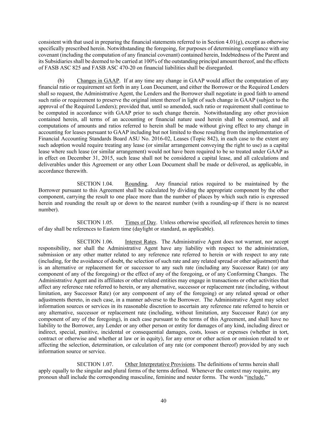 40 consistent with that used in preparing the financial statements referred to in Section 4.01(g), except as otherwise specifically prescribed herein. Notwithstanding the foregoing, for purposes of determining compliance with any covenant (including the computation of any financial covenant) contained herein, Indebtedness of the Parent and its Subsidiaries shall be deemed to be carried at 100% of the outstanding principal amount thereof, and the effects of FASB ASC 825 and FASB ASC 470-20 on financial liabilities shall be disregarded. (b) Changes in GAAP. If at any time any change in GAAP would affect the computation of any financial ratio or requirement set forth in any Loan Document, and either the Borrower or the Required Lenders shall so request, the Administrative Agent, the Lenders and the Borrower shall negotiate in good faith to amend such ratio or requirement to preserve the original intent thereof in light of such change in GAAP (subject to the approval of the Required Lenders); provided that, until so amended, such ratio or requirement shall continue to be computed in accordance with GAAP prior to such change therein. Notwithstanding any other provision contained herein, all terms of an accounting or financial nature used herein shall be construed, and all computations of amounts and ratios referred to herein shall be made without giving effect to any change in accounting for leases pursuant to GAAP including but not limited to those resulting from the implementation of Financial Accounting Standards Board ASU No. 2016-02, Leases (Topic 842), in each case to the extent any such adoption would require treating any lease (or similar arrangement conveying the right to use) as a capital lease where such lease (or similar arrangement) would not have been required to be so treated under GAAP as in effect on December 31, 2015, such lease shall not be considered a capital lease, and all calculations and deliverables under this Agreement or any other Loan Document shall be made or delivered, as applicable, in accordance therewith. SECTION 1.04. Rounding. Any financial ratios required to be maintained by the Borrower pursuant to this Agreement shall be calculated by dividing the appropriate component by the other component, carrying the result to one place more than the number of places by which such ratio is expressed herein and rounding the result up or down to the nearest number (with a rounding-up if there is no nearest number). SECTION 1.05. Times of Day. Unless otherwise specified, all references herein to times of day shall be references to Eastern time (daylight or standard, as applicable). SECTION 1.06. Interest Rates. The Administrative Agent does not warrant, nor accept responsibility, nor shall the Administrative Agent have any liability with respect to the administration, submission or any other matter related to any reference rate referred to herein or with respect to any rate (including, for the avoidance of doubt, the selection of such rate and any related spread or other adjustment) that is an alternative or replacement for or successor to any such rate (including any Successor Rate) (or any component of any of the foregoing) or the effect of any of the foregoing, or of any Conforming Changes. The Administrative Agent and its affiliates or other related entities may engage in transactions or other activities that affect any reference rate referred to herein, or any alternative, successor or replacement rate (including, without limitation, any Successor Rate) (or any component of any of the foregoing) or any related spread or other adjustments thereto, in each case, in a manner adverse to the Borrower. The Administrative Agent may select information sources or services in its reasonable discretion to ascertain any reference rate referred to herein or any alternative, successor or replacement rate (including, without limitation, any Successor Rate) (or any component of any of the foregoing), in each case pursuant to the terms of this Agreement, and shall have no liability to the Borrower, any Lender or any other person or entity for damages of any kind, including direct or indirect, special, punitive, incidental or consequential damages, costs, losses or expenses (whether in tort, contract or otherwise and whether at law or in equity), for any error or other action or omission related to or affecting the selection, determination, or calculation of any rate (or component thereof) provided by any such information source or service. SECTION 1.07. Other Interpretative Provisions. The definitions of terms herein shall apply equally to the singular and plural forms of the terms defined. Whenever the context may require, any pronoun shall include the corresponding masculine, feminine and neuter forms. The words “include,”
