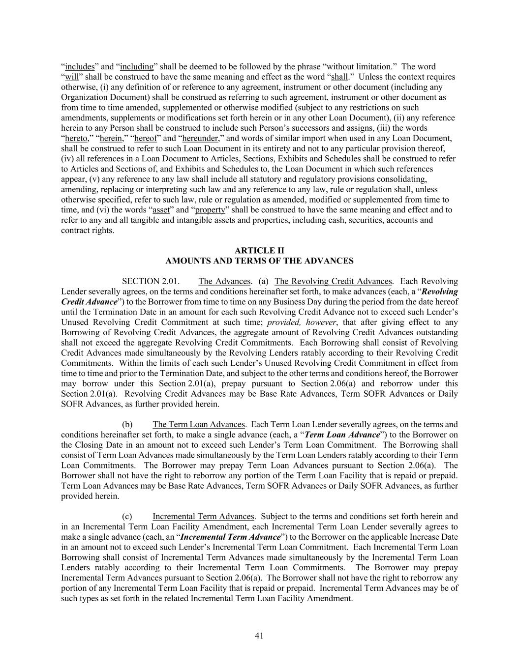 41 “includes” and “including” shall be deemed to be followed by the phrase “without limitation.” The word “will” shall be construed to have the same meaning and effect as the word “shall.” Unless the context requires otherwise, (i) any definition of or reference to any agreement, instrument or other document (including any Organization Document) shall be construed as referring to such agreement, instrument or other document as from time to time amended, supplemented or otherwise modified (subject to any restrictions on such amendments, supplements or modifications set forth herein or in any other Loan Document), (ii) any reference herein to any Person shall be construed to include such Person’s successors and assigns, (iii) the words “hereto,” “herein,” “hereof” and “hereunder,” and words of similar import when used in any Loan Document, shall be construed to refer to such Loan Document in its entirety and not to any particular provision thereof, (iv) all references in a Loan Document to Articles, Sections, Exhibits and Schedules shall be construed to refer to Articles and Sections of, and Exhibits and Schedules to, the Loan Document in which such references appear, (v) any reference to any law shall include all statutory and regulatory provisions consolidating, amending, replacing or interpreting such law and any reference to any law, rule or regulation shall, unless otherwise specified, refer to such law, rule or regulation as amended, modified or supplemented from time to time, and (vi) the words “asset” and “property” shall be construed to have the same meaning and effect and to refer to any and all tangible and intangible assets and properties, including cash, securities, accounts and contract rights. ARTICLE II AMOUNTS AND TERMS OF THE ADVANCES SECTION 2.01. The Advances. (a) The Revolving Credit Advances. Each Revolving Lender severally agrees, on the terms and conditions hereinafter set forth, to make advances (each, a “Revolving Credit Advance”) to the Borrower from time to time on any Business Day during the period from the date hereof until the Termination Date in an amount for each such Revolving Credit Advance not to exceed such Lender’s Unused Revolving Credit Commitment at such time; provided, however, that after giving effect to any Borrowing of Revolving Credit Advances, the aggregate amount of Revolving Credit Advances outstanding shall not exceed the aggregate Revolving Credit Commitments. Each Borrowing shall consist of Revolving Credit Advances made simultaneously by the Revolving Lenders ratably according to their Revolving Credit Commitments. Within the limits of each such Lender’s Unused Revolving Credit Commitment in effect from time to time and prior to the Termination Date, and subject to the other terms and conditions hereof, the Borrower may borrow under this Section 2.01(a), prepay pursuant to Section 2.06(a) and reborrow under this Section 2.01(a). Revolving Credit Advances may be Base Rate Advances, Term SOFR Advances or Daily SOFR Advances, as further provided herein. (b) The Term Loan Advances. Each Term Loan Lender severally agrees, on the terms and conditions hereinafter set forth, to make a single advance (each, a “Term Loan Advance”) to the Borrower on the Closing Date in an amount not to exceed such Lender’s Term Loan Commitment. The Borrowing shall consist of Term Loan Advances made simultaneously by the Term Loan Lenders ratably according to their Term Loan Commitments. The Borrower may prepay Term Loan Advances pursuant to Section 2.06(a). The Borrower shall not have the right to reborrow any portion of the Term Loan Facility that is repaid or prepaid. Term Loan Advances may be Base Rate Advances, Term SOFR Advances or Daily SOFR Advances, as further provided herein. (c) Incremental Term Advances. Subject to the terms and conditions set forth herein and in an Incremental Term Loan Facility Amendment, each Incremental Term Loan Lender severally agrees to make a single advance (each, an “Incremental Term Advance”) to the Borrower on the applicable Increase Date in an amount not to exceed such Lender’s Incremental Term Loan Commitment. Each Incremental Term Loan Borrowing shall consist of Incremental Term Advances made simultaneously by the Incremental Term Loan Lenders ratably according to their Incremental Term Loan Commitments. The Borrower may prepay Incremental Term Advances pursuant to Section 2.06(a). The Borrower shall not have the right to reborrow any portion of any Incremental Term Loan Facility that is repaid or prepaid. Incremental Term Advances may be of such types as set forth in the related Incremental Term Loan Facility Amendment.