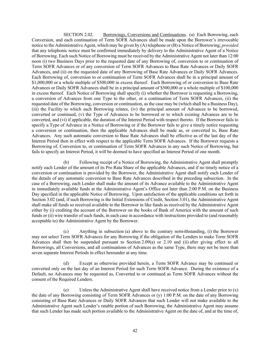 42 SECTION 2.02. Borrowings, Conversions and Continuations. (a) Each Borrowing, each Conversion, and each continuation of Term SOFR Advances shall be made upon the Borrower’s irrevocable notice to the Administrative Agent, which may be given by (A) telephone or (B) a Notice of Borrowing; provided that any telephonic notice must be confirmed immediately by delivery to the Administrative Agent of a Notice of Borrowing. Each such Notice of Borrowing must be received by the Administrative Agent not later than 12:00 noon (i) two Business Days prior to the requested date of any Borrowing of, conversion to or continuation of Term SOFR Advances or of any conversion of Term SOFR Advances to Base Rate Advances or Daily SOFR Advances, and (ii) on the requested date of any Borrowing of Base Rate Advances or Daily SOFR Advances. Each Borrowing of, conversion to or continuation of Term SOFR Advances shall be in a principal amount of $1,000,000 or a whole multiple of $500,000 in excess thereof. Each Borrowing of or conversion to Base Rate Advances or Daily SOFR Advances shall be in a principal amount of $500,000 or a whole multiple of $100,000 in excess thereof. Each Notice of Borrowing shall specify (i) whether the Borrower is requesting a Borrowing, a conversion of Advances from one Type to the other, or a continuation of Term SOFR Advances, (ii) the requested date of the Borrowing, conversion or continuation, as the case may be (which shall be a Business Day), (iii) the Facility to which such Borrowing relates, (iv) the principal amount of Advances to be borrowed, converted or continued, (v) the Type of Advances to be borrowed or to which existing Advances are to be converted, and (vi) if applicable, the duration of the Interest Period with respect thereto. If the Borrower fails to specify a Type of Advance in a Notice of Borrowing or if the Borrower fails to give a timely notice requesting a conversion or continuation, then the applicable Advances shall be made as, or converted to, Base Rate Advances. Any such automatic conversion to Base Rate Advances shall be effective as of the last day of the Interest Period then in effect with respect to the applicable Term SOFR Advances. If the Borrower requests a Borrowing of, Conversion to, or continuation of Term SOFR Advances in any such Notice of Borrowing, but fails to specify an Interest Period, it will be deemed to have specified an Interest Period of one month. (b) Following receipt of a Notice of Borrowing, the Administrative Agent shall promptly notify each Lender of the amount of its Pro Rata Share of the applicable Advances, and if no timely notice of a conversion or continuation is provided by the Borrower, the Administrative Agent shall notify each Lender of the details of any automatic conversion to Base Rate Advances described in the preceding subsection. In the case of a Borrowing, each Lender shall make the amount of its Advance available to the Administrative Agent in immediately available funds at the Administrative Agent’s Office not later than 2:00 P.M. on the Business Day specified in the applicable Notice of Borrowing. Upon satisfaction of the applicable conditions set forth in Section 3.02 (and, if such Borrowing is the Initial Extensions of Credit, Section 3.01), the Administrative Agent shall make all funds so received available to the Borrower in like funds as received by the Administrative Agent either by (i) crediting the account of the Borrower on the books of Bank of America with the amount of such funds or (ii) wire transfer of such funds, in each case in accordance with instructions provided to (and reasonably acceptable to) the Administrative Agent by the Borrower. (c) Anything in subsection (a) above to the contrary notwithstanding, (i) the Borrower may not select Term SOFR Advances for any Borrowing if the obligation of the Lenders to make Term SOFR Advances shall then be suspended pursuant to Section 2.09(a) or 2.10 and (ii) after giving effect to all Borrowings, all Conversions, and all continuations of Advances as the same Type, there may not be more than seven separate Interest Periods in effect hereunder at any time. (d) Except as otherwise provided herein, a Term SOFR Advance may be continued or converted only on the last day of an Interest Period for such Term SOFR Advance. During the existence of a Default, no Advances may be requested as, Converted to or continued as Term SOFR Advances without the consent of the Required Lenders. (e) Unless the Administrative Agent shall have received notice from a Lender prior to (x) the date of any Borrowing consisting of Term SOFR Advances or (y) 1:00 P.M. on the date of any Borrowing consisting of Base Rate Advances or Daily SOFR Advances that such Lender will not make available to the Administrative Agent such Lender’s ratable portion of such Borrowing, the Administrative Agent may assume that such Lender has made such portion available to the Administrative Agent on the date of, and at the time of,