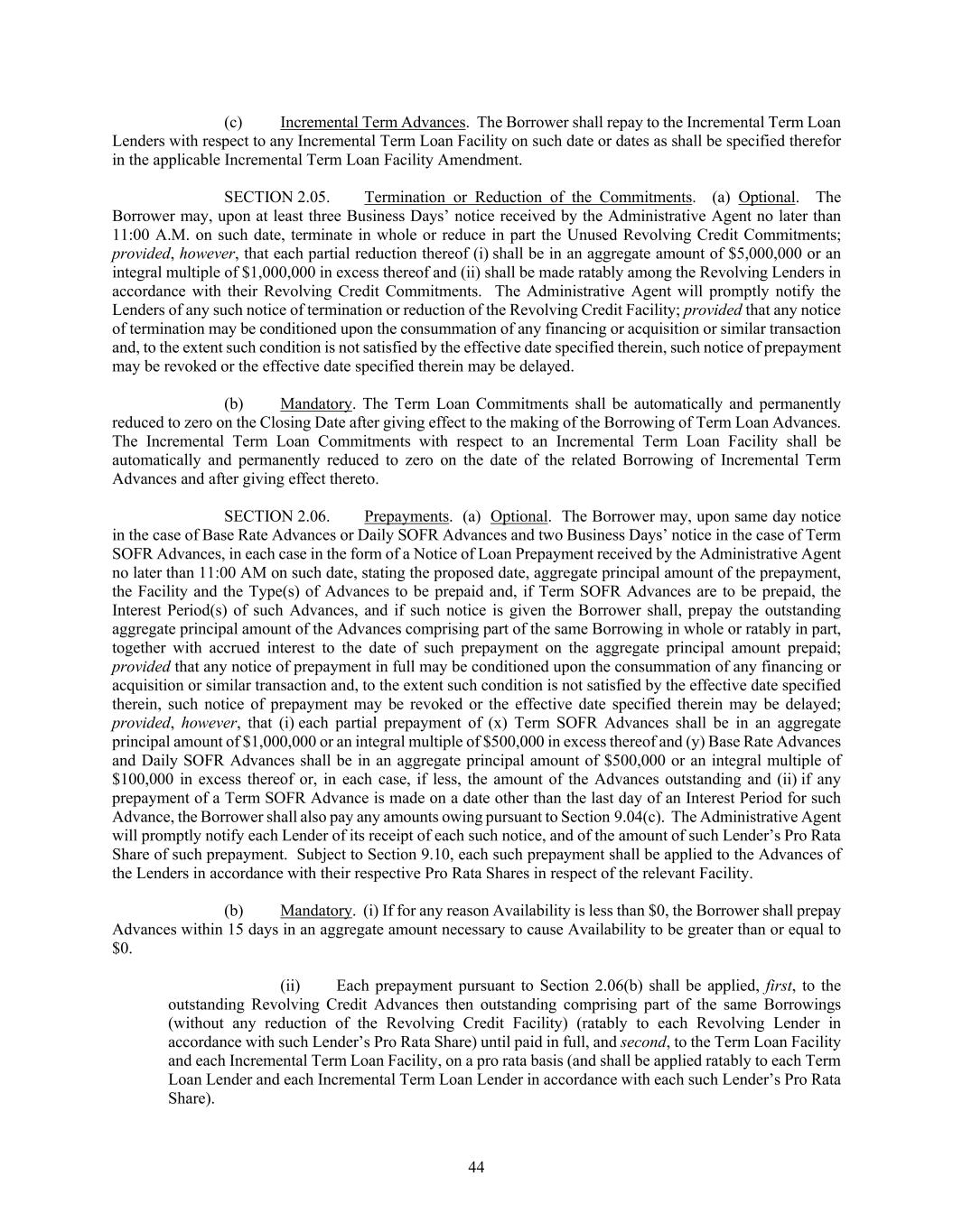 44 (c) Incremental Term Advances. The Borrower shall repay to the Incremental Term Loan Lenders with respect to any Incremental Term Loan Facility on such date or dates as shall be specified therefor in the applicable Incremental Term Loan Facility Amendment. SECTION 2.05. Termination or Reduction of the Commitments. (a) Optional. The Borrower may, upon at least three Business Days’ notice received by the Administrative Agent no later than 11:00 A.M. on such date, terminate in whole or reduce in part the Unused Revolving Credit Commitments; provided, however, that each partial reduction thereof (i) shall be in an aggregate amount of $5,000,000 or an integral multiple of $1,000,000 in excess thereof and (ii) shall be made ratably among the Revolving Lenders in accordance with their Revolving Credit Commitments. The Administrative Agent will promptly notify the Lenders of any such notice of termination or reduction of the Revolving Credit Facility; provided that any notice of termination may be conditioned upon the consummation of any financing or acquisition or similar transaction and, to the extent such condition is not satisfied by the effective date specified therein, such notice of prepayment may be revoked or the effective date specified therein may be delayed. (b) Mandatory. The Term Loan Commitments shall be automatically and permanently reduced to zero on the Closing Date after giving effect to the making of the Borrowing of Term Loan Advances. The Incremental Term Loan Commitments with respect to an Incremental Term Loan Facility shall be automatically and permanently reduced to zero on the date of the related Borrowing of Incremental Term Advances and after giving effect thereto. SECTION 2.06. Prepayments. (a) Optional. The Borrower may, upon same day notice in the case of Base Rate Advances or Daily SOFR Advances and two Business Days’ notice in the case of Term SOFR Advances, in each case in the form of a Notice of Loan Prepayment received by the Administrative Agent no later than 11:00 AM on such date, stating the proposed date, aggregate principal amount of the prepayment, the Facility and the Type(s) of Advances to be prepaid and, if Term SOFR Advances are to be prepaid, the Interest Period(s) of such Advances, and if such notice is given the Borrower shall, prepay the outstanding aggregate principal amount of the Advances comprising part of the same Borrowing in whole or ratably in part, together with accrued interest to the date of such prepayment on the aggregate principal amount prepaid; provided that any notice of prepayment in full may be conditioned upon the consummation of any financing or acquisition or similar transaction and, to the extent such condition is not satisfied by the effective date specified therein, such notice of prepayment may be revoked or the effective date specified therein may be delayed; provided, however, that (i) each partial prepayment of (x) Term SOFR Advances shall be in an aggregate principal amount of $1,000,000 or an integral multiple of $500,000 in excess thereof and (y) Base Rate Advances and Daily SOFR Advances shall be in an aggregate principal amount of $500,000 or an integral multiple of $100,000 in excess thereof or, in each case, if less, the amount of the Advances outstanding and (ii) if any prepayment of a Term SOFR Advance is made on a date other than the last day of an Interest Period for such Advance, the Borrower shall also pay any amounts owing pursuant to Section 9.04(c). The Administrative Agent will promptly notify each Lender of its receipt of each such notice, and of the amount of such Lender’s Pro Rata Share of such prepayment. Subject to Section 9.10, each such prepayment shall be applied to the Advances of the Lenders in accordance with their respective Pro Rata Shares in respect of the relevant Facility. (b) Mandatory. (i) If for any reason Availability is less than $0, the Borrower shall prepay Advances within 15 days in an aggregate amount necessary to cause Availability to be greater than or equal to $0. (ii) Each prepayment pursuant to Section 2.06(b) shall be applied, first, to the outstanding Revolving Credit Advances then outstanding comprising part of the same Borrowings (without any reduction of the Revolving Credit Facility) (ratably to each Revolving Lender in accordance with such Lender’s Pro Rata Share) until paid in full, and second, to the Term Loan Facility and each Incremental Term Loan Facility, on a pro rata basis (and shall be applied ratably to each Term Loan Lender and each Incremental Term Loan Lender in accordance with each such Lender’s Pro Rata Share).
