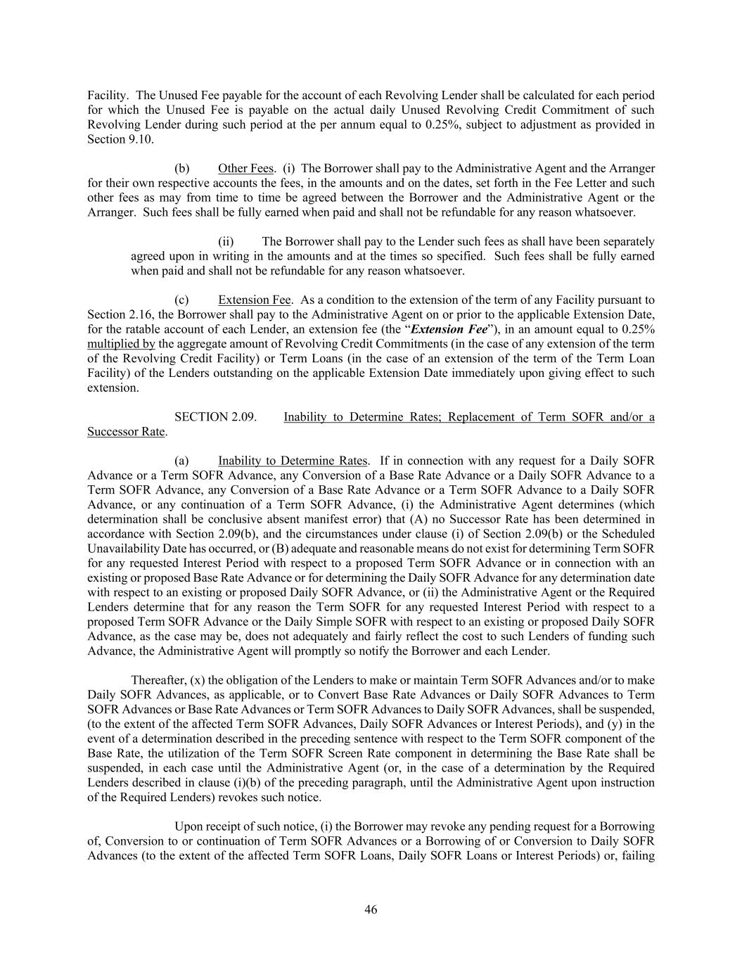 46 Facility. The Unused Fee payable for the account of each Revolving Lender shall be calculated for each period for which the Unused Fee is payable on the actual daily Unused Revolving Credit Commitment of such Revolving Lender during such period at the per annum equal to 0.25%, subject to adjustment as provided in Section 9.10. (b) Other Fees. (i) The Borrower shall pay to the Administrative Agent and the Arranger for their own respective accounts the fees, in the amounts and on the dates, set forth in the Fee Letter and such other fees as may from time to time be agreed between the Borrower and the Administrative Agent or the Arranger. Such fees shall be fully earned when paid and shall not be refundable for any reason whatsoever. (ii) The Borrower shall pay to the Lender such fees as shall have been separately agreed upon in writing in the amounts and at the times so specified. Such fees shall be fully earned when paid and shall not be refundable for any reason whatsoever. (c) Extension Fee. As a condition to the extension of the term of any Facility pursuant to Section 2.16, the Borrower shall pay to the Administrative Agent on or prior to the applicable Extension Date, for the ratable account of each Lender, an extension fee (the “Extension Fee”), in an amount equal to 0.25% multiplied by the aggregate amount of Revolving Credit Commitments (in the case of any extension of the term of the Revolving Credit Facility) or Term Loans (in the case of an extension of the term of the Term Loan Facility) of the Lenders outstanding on the applicable Extension Date immediately upon giving effect to such extension. SECTION 2.09. Inability to Determine Rates; Replacement of Term SOFR and/or a Successor Rate. (a) Inability to Determine Rates. If in connection with any request for a Daily SOFR Advance or a Term SOFR Advance, any Conversion of a Base Rate Advance or a Daily SOFR Advance to a Term SOFR Advance, any Conversion of a Base Rate Advance or a Term SOFR Advance to a Daily SOFR Advance, or any continuation of a Term SOFR Advance, (i) the Administrative Agent determines (which determination shall be conclusive absent manifest error) that (A) no Successor Rate has been determined in accordance with Section 2.09(b), and the circumstances under clause (i) of Section 2.09(b) or the Scheduled Unavailability Date has occurred, or (B) adequate and reasonable means do not exist for determining Term SOFR for any requested Interest Period with respect to a proposed Term SOFR Advance or in connection with an existing or proposed Base Rate Advance or for determining the Daily SOFR Advance for any determination date with respect to an existing or proposed Daily SOFR Advance, or (ii) the Administrative Agent or the Required Lenders determine that for any reason the Term SOFR for any requested Interest Period with respect to a proposed Term SOFR Advance or the Daily Simple SOFR with respect to an existing or proposed Daily SOFR Advance, as the case may be, does not adequately and fairly reflect the cost to such Lenders of funding such Advance, the Administrative Agent will promptly so notify the Borrower and each Lender. Thereafter, (x) the obligation of the Lenders to make or maintain Term SOFR Advances and/or to make Daily SOFR Advances, as applicable, or to Convert Base Rate Advances or Daily SOFR Advances to Term SOFR Advances or Base Rate Advances or Term SOFR Advances to Daily SOFR Advances, shall be suspended, (to the extent of the affected Term SOFR Advances, Daily SOFR Advances or Interest Periods), and (y) in the event of a determination described in the preceding sentence with respect to the Term SOFR component of the Base Rate, the utilization of the Term SOFR Screen Rate component in determining the Base Rate shall be suspended, in each case until the Administrative Agent (or, in the case of a determination by the Required Lenders described in clause (i)(b) of the preceding paragraph, until the Administrative Agent upon instruction of the Required Lenders) revokes such notice. Upon receipt of such notice, (i) the Borrower may revoke any pending request for a Borrowing of, Conversion to or continuation of Term SOFR Advances or a Borrowing of or Conversion to Daily SOFR Advances (to the extent of the affected Term SOFR Loans, Daily SOFR Loans or Interest Periods) or, failing