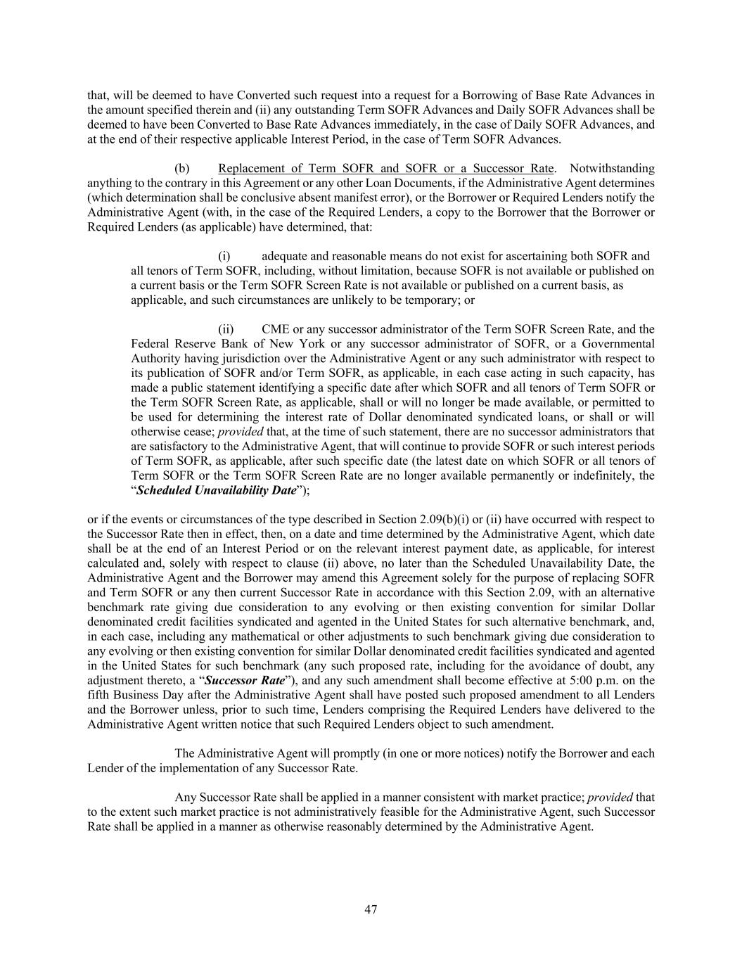 47 that, will be deemed to have Converted such request into a request for a Borrowing of Base Rate Advances in the amount specified therein and (ii) any outstanding Term SOFR Advances and Daily SOFR Advances shall be deemed to have been Converted to Base Rate Advances immediately, in the case of Daily SOFR Advances, and at the end of their respective applicable Interest Period, in the case of Term SOFR Advances. (b) Replacement of Term SOFR and SOFR or a Successor Rate. Notwithstanding anything to the contrary in this Agreement or any other Loan Documents, if the Administrative Agent determines (which determination shall be conclusive absent manifest error), or the Borrower or Required Lenders notify the Administrative Agent (with, in the case of the Required Lenders, a copy to the Borrower that the Borrower or Required Lenders (as applicable) have determined, that: (i) adequate and reasonable means do not exist for ascertaining both SOFR and all tenors of Term SOFR, including, without limitation, because SOFR is not available or published on a current basis or the Term SOFR Screen Rate is not available or published on a current basis, as applicable, and such circumstances are unlikely to be temporary; or (ii) CME or any successor administrator of the Term SOFR Screen Rate, and the Federal Reserve Bank of New York or any successor administrator of SOFR, or a Governmental Authority having jurisdiction over the Administrative Agent or any such administrator with respect to its publication of SOFR and/or Term SOFR, as applicable, in each case acting in such capacity, has made a public statement identifying a specific date after which SOFR and all tenors of Term SOFR or the Term SOFR Screen Rate, as applicable, shall or will no longer be made available, or permitted to be used for determining the interest rate of Dollar denominated syndicated loans, or shall or will otherwise cease; provided that, at the time of such statement, there are no successor administrators that are satisfactory to the Administrative Agent, that will continue to provide SOFR or such interest periods of Term SOFR, as applicable, after such specific date (the latest date on which SOFR or all tenors of Term SOFR or the Term SOFR Screen Rate are no longer available permanently or indefinitely, the “Scheduled Unavailability Date”); or if the events or circumstances of the type described in Section 2.09(b)(i) or (ii) have occurred with respect to the Successor Rate then in effect, then, on a date and time determined by the Administrative Agent, which date shall be at the end of an Interest Period or on the relevant interest payment date, as applicable, for interest calculated and, solely with respect to clause (ii) above, no later than the Scheduled Unavailability Date, the Administrative Agent and the Borrower may amend this Agreement solely for the purpose of replacing SOFR and Term SOFR or any then current Successor Rate in accordance with this Section 2.09, with an alternative benchmark rate giving due consideration to any evolving or then existing convention for similar Dollar denominated credit facilities syndicated and agented in the United States for such alternative benchmark, and, in each case, including any mathematical or other adjustments to such benchmark giving due consideration to any evolving or then existing convention for similar Dollar denominated credit facilities syndicated and agented in the United States for such benchmark (any such proposed rate, including for the avoidance of doubt, any adjustment thereto, a “Successor Rate”), and any such amendment shall become effective at 5:00 p.m. on the fifth Business Day after the Administrative Agent shall have posted such proposed amendment to all Lenders and the Borrower unless, prior to such time, Lenders comprising the Required Lenders have delivered to the Administrative Agent written notice that such Required Lenders object to such amendment. The Administrative Agent will promptly (in one or more notices) notify the Borrower and each Lender of the implementation of any Successor Rate. Any Successor Rate shall be applied in a manner consistent with market practice; provided that to the extent such market practice is not administratively feasible for the Administrative Agent, such Successor Rate shall be applied in a manner as otherwise reasonably determined by the Administrative Agent.