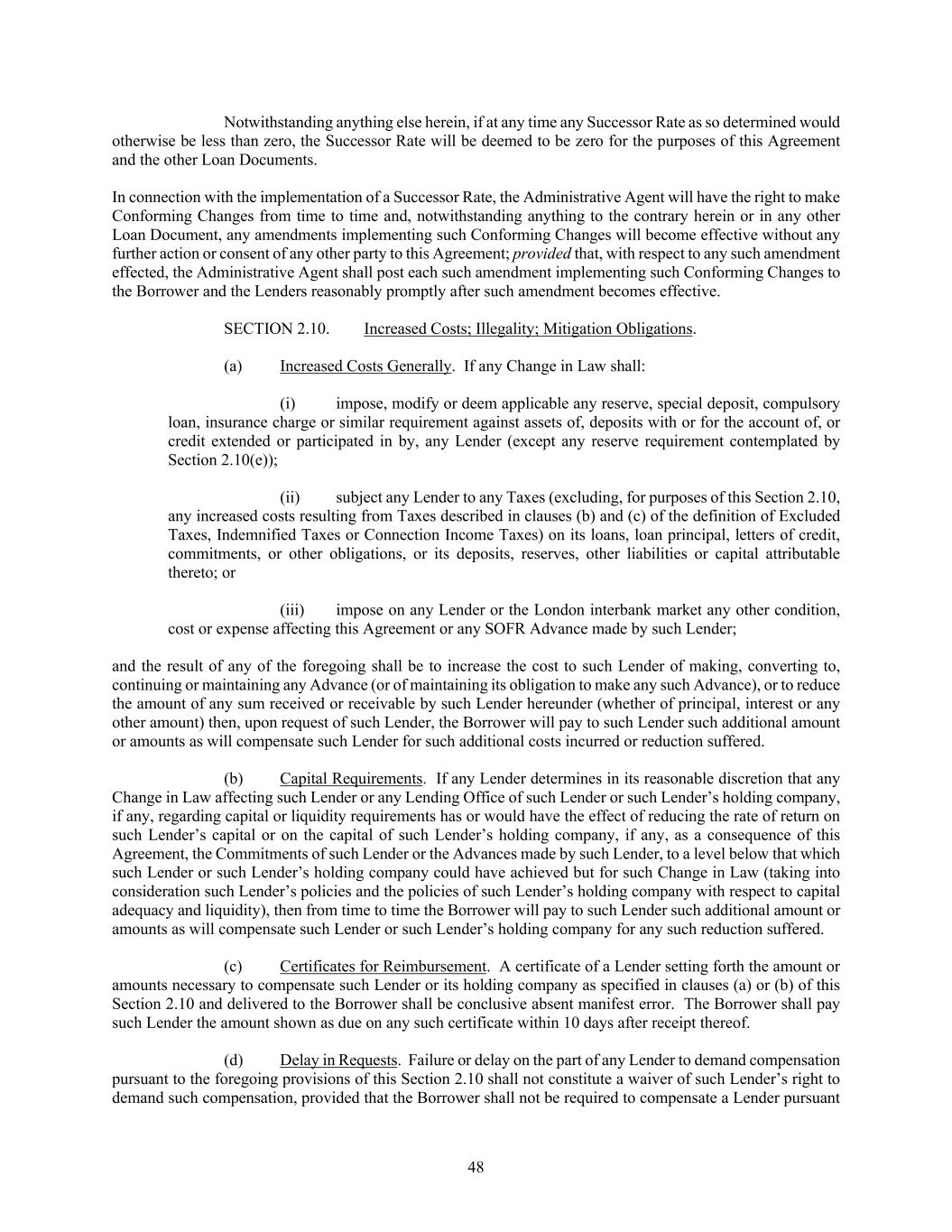 48 Notwithstanding anything else herein, if at any time any Successor Rate as so determined would otherwise be less than zero, the Successor Rate will be deemed to be zero for the purposes of this Agreement and the other Loan Documents. In connection with the implementation of a Successor Rate, the Administrative Agent will have the right to make Conforming Changes from time to time and, notwithstanding anything to the contrary herein or in any other Loan Document, any amendments implementing such Conforming Changes will become effective without any further action or consent of any other party to this Agreement; provided that, with respect to any such amendment effected, the Administrative Agent shall post each such amendment implementing such Conforming Changes to the Borrower and the Lenders reasonably promptly after such amendment becomes effective. SECTION 2.10. Increased Costs; Illegality; Mitigation Obligations. (a) Increased Costs Generally. If any Change in Law shall: (i) impose, modify or deem applicable any reserve, special deposit, compulsory loan, insurance charge or similar requirement against assets of, deposits with or for the account of, or credit extended or participated in by, any Lender (except any reserve requirement contemplated by Section 2.10(e)); (ii) subject any Lender to any Taxes (excluding, for purposes of this Section 2.10, any increased costs resulting from Taxes described in clauses (b) and (c) of the definition of Excluded Taxes, Indemnified Taxes or Connection Income Taxes) on its loans, loan principal, letters of credit, commitments, or other obligations, or its deposits, reserves, other liabilities or capital attributable thereto; or (iii) impose on any Lender or the London interbank market any other condition, cost or expense affecting this Agreement or any SOFR Advance made by such Lender; and the result of any of the foregoing shall be to increase the cost to such Lender of making, converting to, continuing or maintaining any Advance (or of maintaining its obligation to make any such Advance), or to reduce the amount of any sum received or receivable by such Lender hereunder (whether of principal, interest or any other amount) then, upon request of such Lender, the Borrower will pay to such Lender such additional amount or amounts as will compensate such Lender for such additional costs incurred or reduction suffered. (b) Capital Requirements. If any Lender determines in its reasonable discretion that any Change in Law affecting such Lender or any Lending Office of such Lender or such Lender’s holding company, if any, regarding capital or liquidity requirements has or would have the effect of reducing the rate of return on such Lender’s capital or on the capital of such Lender’s holding company, if any, as a consequence of this Agreement, the Commitments of such Lender or the Advances made by such Lender, to a level below that which such Lender or such Lender’s holding company could have achieved but for such Change in Law (taking into consideration such Lender’s policies and the policies of such Lender’s holding company with respect to capital adequacy and liquidity), then from time to time the Borrower will pay to such Lender such additional amount or amounts as will compensate such Lender or such Lender’s holding company for any such reduction suffered. (c) Certificates for Reimbursement. A certificate of a Lender setting forth the amount or amounts necessary to compensate such Lender or its holding company as specified in clauses (a) or (b) of this Section 2.10 and delivered to the Borrower shall be conclusive absent manifest error. The Borrower shall pay such Lender the amount shown as due on any such certificate within 10 days after receipt thereof. (d) Delay in Requests. Failure or delay on the part of any Lender to demand compensation pursuant to the foregoing provisions of this Section 2.10 shall not constitute a waiver of such Lender’s right to demand such compensation, provided that the Borrower shall not be required to compensate a Lender pursuant