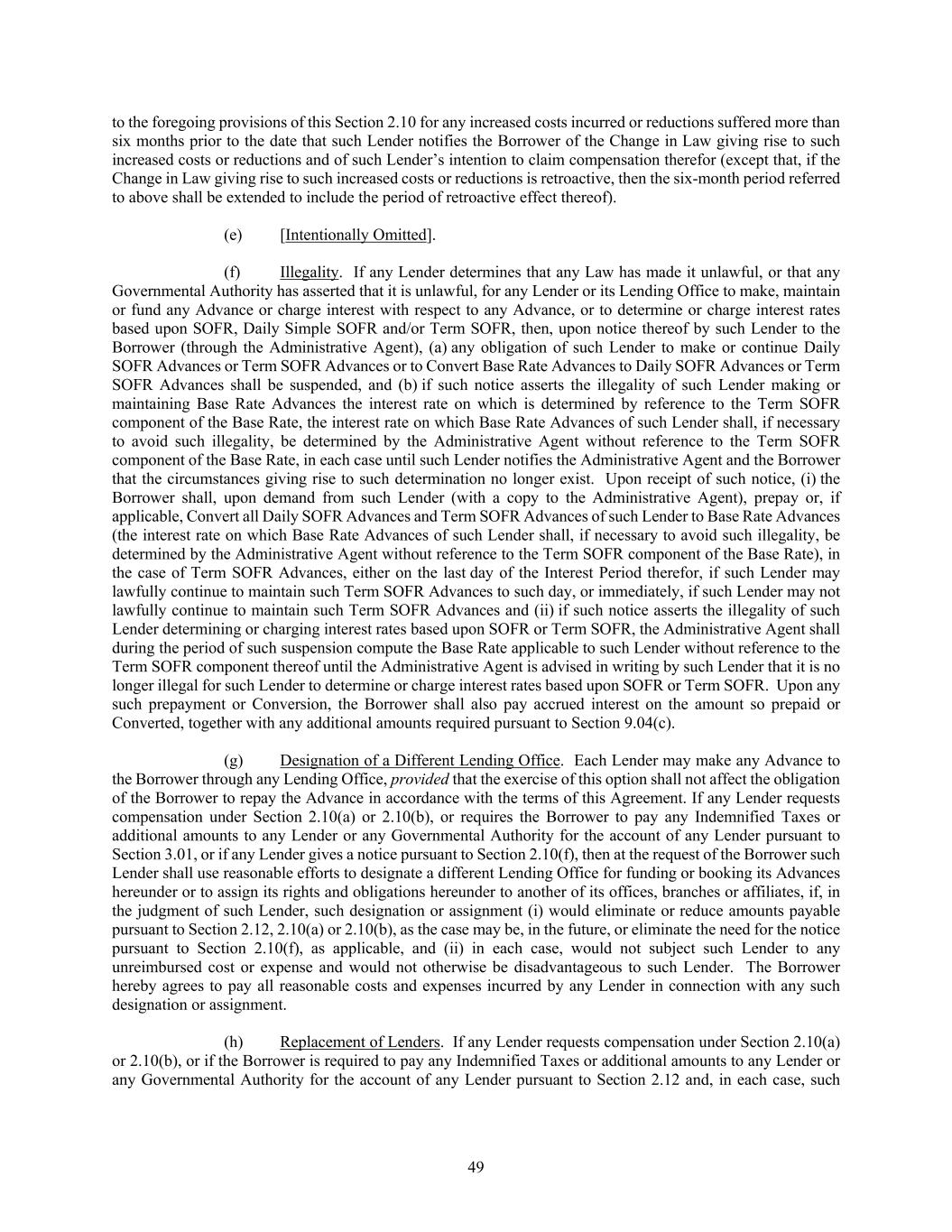49 to the foregoing provisions of this Section 2.10 for any increased costs incurred or reductions suffered more than six months prior to the date that such Lender notifies the Borrower of the Change in Law giving rise to such increased costs or reductions and of such Lender’s intention to claim compensation therefor (except that, if the Change in Law giving rise to such increased costs or reductions is retroactive, then the six-month period referred to above shall be extended to include the period of retroactive effect thereof). (e) [Intentionally Omitted]. (f) Illegality. If any Lender determines that any Law has made it unlawful, or that any Governmental Authority has asserted that it is unlawful, for any Lender or its Lending Office to make, maintain or fund any Advance or charge interest with respect to any Advance, or to determine or charge interest rates based upon SOFR, Daily Simple SOFR and/or Term SOFR, then, upon notice thereof by such Lender to the Borrower (through the Administrative Agent), (a) any obligation of such Lender to make or continue Daily SOFR Advances or Term SOFR Advances or to Convert Base Rate Advances to Daily SOFR Advances or Term SOFR Advances shall be suspended, and (b) if such notice asserts the illegality of such Lender making or maintaining Base Rate Advances the interest rate on which is determined by reference to the Term SOFR component of the Base Rate, the interest rate on which Base Rate Advances of such Lender shall, if necessary to avoid such illegality, be determined by the Administrative Agent without reference to the Term SOFR component of the Base Rate, in each case until such Lender notifies the Administrative Agent and the Borrower that the circumstances giving rise to such determination no longer exist. Upon receipt of such notice, (i) the Borrower shall, upon demand from such Lender (with a copy to the Administrative Agent), prepay or, if applicable, Convert all Daily SOFR Advances and Term SOFR Advances of such Lender to Base Rate Advances (the interest rate on which Base Rate Advances of such Lender shall, if necessary to avoid such illegality, be determined by the Administrative Agent without reference to the Term SOFR component of the Base Rate), in the case of Term SOFR Advances, either on the last day of the Interest Period therefor, if such Lender may lawfully continue to maintain such Term SOFR Advances to such day, or immediately, if such Lender may not lawfully continue to maintain such Term SOFR Advances and (ii) if such notice asserts the illegality of such Lender determining or charging interest rates based upon SOFR or Term SOFR, the Administrative Agent shall during the period of such suspension compute the Base Rate applicable to such Lender without reference to the Term SOFR component thereof until the Administrative Agent is advised in writing by such Lender that it is no longer illegal for such Lender to determine or charge interest rates based upon SOFR or Term SOFR. Upon any such prepayment or Conversion, the Borrower shall also pay accrued interest on the amount so prepaid or Converted, together with any additional amounts required pursuant to Section 9.04(c). (g) Designation of a Different Lending Office. Each Lender may make any Advance to the Borrower through any Lending Office, provided that the exercise of this option shall not affect the obligation of the Borrower to repay the Advance in accordance with the terms of this Agreement. If any Lender requests compensation under Section 2.10(a) or 2.10(b), or requires the Borrower to pay any Indemnified Taxes or additional amounts to any Lender or any Governmental Authority for the account of any Lender pursuant to Section 3.01, or if any Lender gives a notice pursuant to Section 2.10(f), then at the request of the Borrower such Lender shall use reasonable efforts to designate a different Lending Office for funding or booking its Advances hereunder or to assign its rights and obligations hereunder to another of its offices, branches or affiliates, if, in the judgment of such Lender, such designation or assignment (i) would eliminate or reduce amounts payable pursuant to Section 2.12, 2.10(a) or 2.10(b), as the case may be, in the future, or eliminate the need for the notice pursuant to Section 2.10(f), as applicable, and (ii) in each case, would not subject such Lender to any unreimbursed cost or expense and would not otherwise be disadvantageous to such Lender. The Borrower hereby agrees to pay all reasonable costs and expenses incurred by any Lender in connection with any such designation or assignment. (h) Replacement of Lenders. If any Lender requests compensation under Section 2.10(a) or 2.10(b), or if the Borrower is required to pay any Indemnified Taxes or additional amounts to any Lender or any Governmental Authority for the account of any Lender pursuant to Section 2.12 and, in each case, such