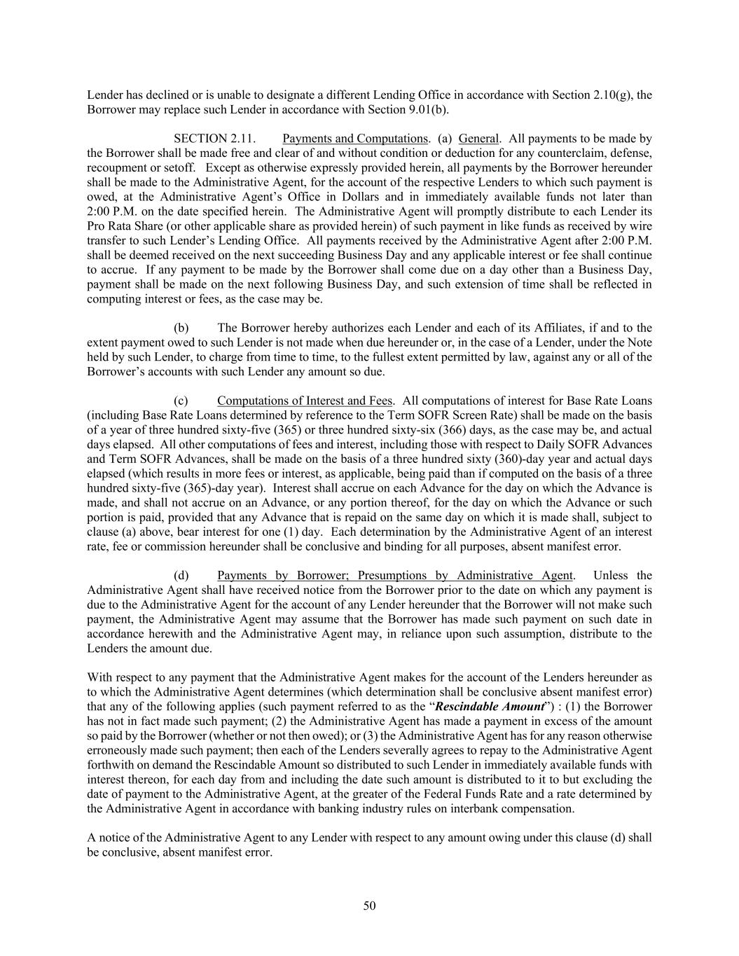 50 Lender has declined or is unable to designate a different Lending Office in accordance with Section 2.10(g), the Borrower may replace such Lender in accordance with Section 9.01(b). SECTION 2.11. Payments and Computations. (a) General. All payments to be made by the Borrower shall be made free and clear of and without condition or deduction for any counterclaim, defense, recoupment or setoff. Except as otherwise expressly provided herein, all payments by the Borrower hereunder shall be made to the Administrative Agent, for the account of the respective Lenders to which such payment is owed, at the Administrative Agent’s Office in Dollars and in immediately available funds not later than 2:00 P.M. on the date specified herein. The Administrative Agent will promptly distribute to each Lender its Pro Rata Share (or other applicable share as provided herein) of such payment in like funds as received by wire transfer to such Lender’s Lending Office. All payments received by the Administrative Agent after 2:00 P.M. shall be deemed received on the next succeeding Business Day and any applicable interest or fee shall continue to accrue. If any payment to be made by the Borrower shall come due on a day other than a Business Day, payment shall be made on the next following Business Day, and such extension of time shall be reflected in computing interest or fees, as the case may be. (b) The Borrower hereby authorizes each Lender and each of its Affiliates, if and to the extent payment owed to such Lender is not made when due hereunder or, in the case of a Lender, under the Note held by such Lender, to charge from time to time, to the fullest extent permitted by law, against any or all of the Borrower’s accounts with such Lender any amount so due. (c) Computations of Interest and Fees. All computations of interest for Base Rate Loans (including Base Rate Loans determined by reference to the Term SOFR Screen Rate) shall be made on the basis of a year of three hundred sixty-five (365) or three hundred sixty-six (366) days, as the case may be, and actual days elapsed. All other computations of fees and interest, including those with respect to Daily SOFR Advances and Term SOFR Advances, shall be made on the basis of a three hundred sixty (360)-day year and actual days elapsed (which results in more fees or interest, as applicable, being paid than if computed on the basis of a three hundred sixty-five (365)-day year). Interest shall accrue on each Advance for the day on which the Advance is made, and shall not accrue on an Advance, or any portion thereof, for the day on which the Advance or such portion is paid, provided that any Advance that is repaid on the same day on which it is made shall, subject to clause (a) above, bear interest for one (1) day. Each determination by the Administrative Agent of an interest rate, fee or commission hereunder shall be conclusive and binding for all purposes, absent manifest error. (d) Payments by Borrower; Presumptions by Administrative Agent. Unless the Administrative Agent shall have received notice from the Borrower prior to the date on which any payment is due to the Administrative Agent for the account of any Lender hereunder that the Borrower will not make such payment, the Administrative Agent may assume that the Borrower has made such payment on such date in accordance herewith and the Administrative Agent may, in reliance upon such assumption, distribute to the Lenders the amount due. With respect to any payment that the Administrative Agent makes for the account of the Lenders hereunder as to which the Administrative Agent determines (which determination shall be conclusive absent manifest error) that any of the following applies (such payment referred to as the “Rescindable Amount”) : (1) the Borrower has not in fact made such payment; (2) the Administrative Agent has made a payment in excess of the amount so paid by the Borrower (whether or not then owed); or (3) the Administrative Agent has for any reason otherwise erroneously made such payment; then each of the Lenders severally agrees to repay to the Administrative Agent forthwith on demand the Rescindable Amount so distributed to such Lender in immediately available funds with interest thereon, for each day from and including the date such amount is distributed to it to but excluding the date of payment to the Administrative Agent, at the greater of the Federal Funds Rate and a rate determined by the Administrative Agent in accordance with banking industry rules on interbank compensation. A notice of the Administrative Agent to any Lender with respect to any amount owing under this clause (d) shall be conclusive, absent manifest error.