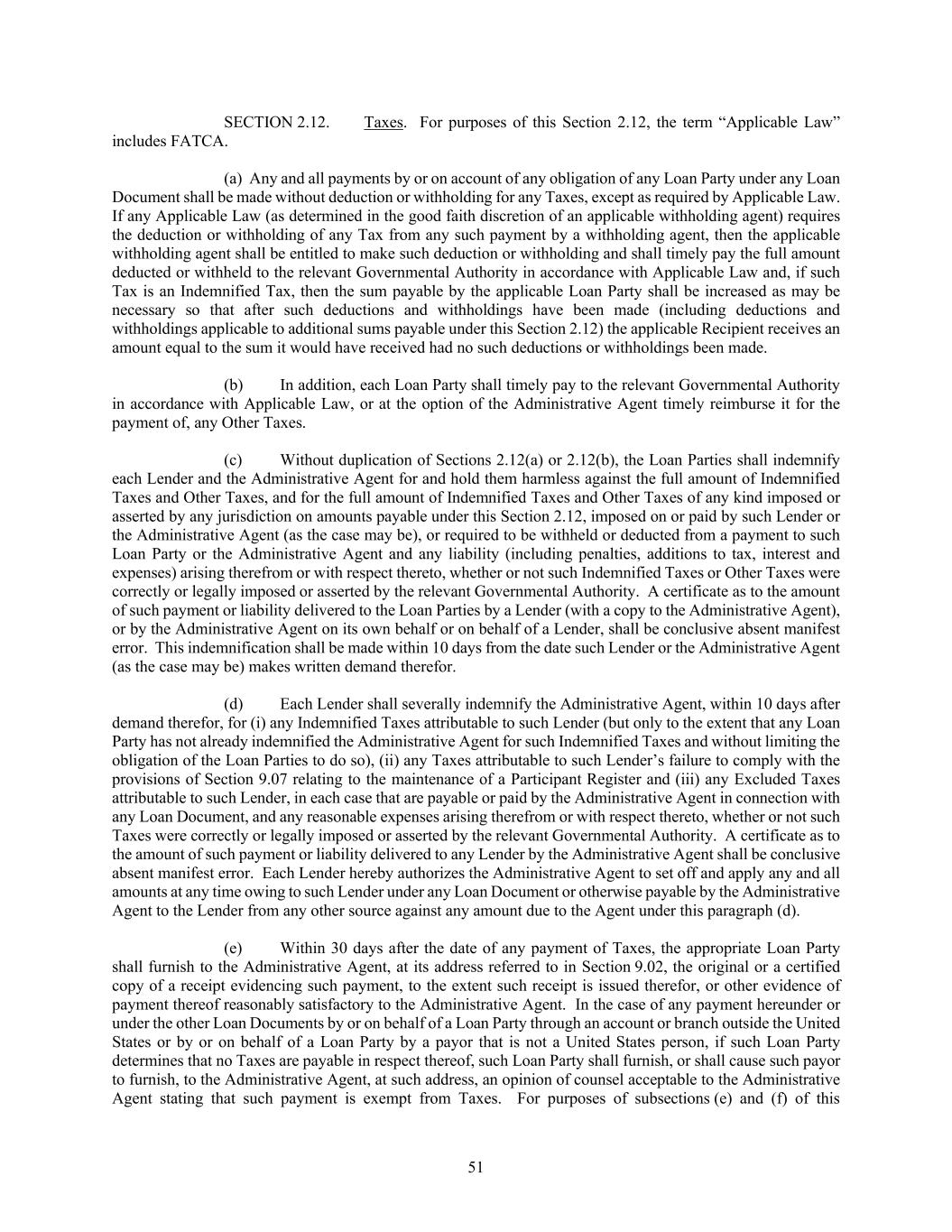 51 SECTION 2.12. Taxes. For purposes of this Section 2.12, the term “Applicable Law” includes FATCA. (a) Any and all payments by or on account of any obligation of any Loan Party under any Loan Document shall be made without deduction or withholding for any Taxes, except as required by Applicable Law. If any Applicable Law (as determined in the good faith discretion of an applicable withholding agent) requires the deduction or withholding of any Tax from any such payment by a withholding agent, then the applicable withholding agent shall be entitled to make such deduction or withholding and shall timely pay the full amount deducted or withheld to the relevant Governmental Authority in accordance with Applicable Law and, if such Tax is an Indemnified Tax, then the sum payable by the applicable Loan Party shall be increased as may be necessary so that after such deductions and withholdings have been made (including deductions and withholdings applicable to additional sums payable under this Section 2.12) the applicable Recipient receives an amount equal to the sum it would have received had no such deductions or withholdings been made. (b) In addition, each Loan Party shall timely pay to the relevant Governmental Authority in accordance with Applicable Law, or at the option of the Administrative Agent timely reimburse it for the payment of, any Other Taxes. (c) Without duplication of Sections 2.12(a) or 2.12(b), the Loan Parties shall indemnify each Lender and the Administrative Agent for and hold them harmless against the full amount of Indemnified Taxes and Other Taxes, and for the full amount of Indemnified Taxes and Other Taxes of any kind imposed or asserted by any jurisdiction on amounts payable under this Section 2.12, imposed on or paid by such Lender or the Administrative Agent (as the case may be), or required to be withheld or deducted from a payment to such Loan Party or the Administrative Agent and any liability (including penalties, additions to tax, interest and expenses) arising therefrom or with respect thereto, whether or not such Indemnified Taxes or Other Taxes were correctly or legally imposed or asserted by the relevant Governmental Authority. A certificate as to the amount of such payment or liability delivered to the Loan Parties by a Lender (with a copy to the Administrative Agent), or by the Administrative Agent on its own behalf or on behalf of a Lender, shall be conclusive absent manifest error. This indemnification shall be made within 10 days from the date such Lender or the Administrative Agent (as the case may be) makes written demand therefor. (d) Each Lender shall severally indemnify the Administrative Agent, within 10 days after demand therefor, for (i) any Indemnified Taxes attributable to such Lender (but only to the extent that any Loan Party has not already indemnified the Administrative Agent for such Indemnified Taxes and without limiting the obligation of the Loan Parties to do so), (ii) any Taxes attributable to such Lender’s failure to comply with the provisions of Section 9.07 relating to the maintenance of a Participant Register and (iii) any Excluded Taxes attributable to such Lender, in each case that are payable or paid by the Administrative Agent in connection with any Loan Document, and any reasonable expenses arising therefrom or with respect thereto, whether or not such Taxes were correctly or legally imposed or asserted by the relevant Governmental Authority. A certificate as to the amount of such payment or liability delivered to any Lender by the Administrative Agent shall be conclusive absent manifest error. Each Lender hereby authorizes the Administrative Agent to set off and apply any and all amounts at any time owing to such Lender under any Loan Document or otherwise payable by the Administrative Agent to the Lender from any other source against any amount due to the Agent under this paragraph (d). (e) Within 30 days after the date of any payment of Taxes, the appropriate Loan Party shall furnish to the Administrative Agent, at its address referred to in Section 9.02, the original or a certified copy of a receipt evidencing such payment, to the extent such receipt is issued therefor, or other evidence of payment thereof reasonably satisfactory to the Administrative Agent. In the case of any payment hereunder or under the other Loan Documents by or on behalf of a Loan Party through an account or branch outside the United States or by or on behalf of a Loan Party by a payor that is not a United States person, if such Loan Party determines that no Taxes are payable in respect thereof, such Loan Party shall furnish, or shall cause such payor to furnish, to the Administrative Agent, at such address, an opinion of counsel acceptable to the Administrative Agent stating that such payment is exempt from Taxes. For purposes of subsections (e) and (f) of this