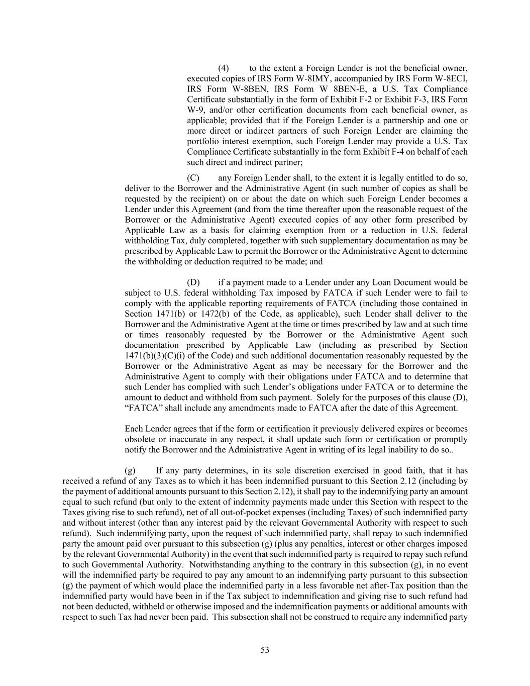 53 (4) to the extent a Foreign Lender is not the beneficial owner, executed copies of IRS Form W-8IMY, accompanied by IRS Form W-8ECI, IRS Form W-8BEN, IRS Form W 8BEN-E, a U.S. Tax Compliance Certificate substantially in the form of Exhibit F-2 or Exhibit F-3, IRS Form W-9, and/or other certification documents from each beneficial owner, as applicable; provided that if the Foreign Lender is a partnership and one or more direct or indirect partners of such Foreign Lender are claiming the portfolio interest exemption, such Foreign Lender may provide a U.S. Tax Compliance Certificate substantially in the form Exhibit F-4 on behalf of each such direct and indirect partner; (C) any Foreign Lender shall, to the extent it is legally entitled to do so, deliver to the Borrower and the Administrative Agent (in such number of copies as shall be requested by the recipient) on or about the date on which such Foreign Lender becomes a Lender under this Agreement (and from the time thereafter upon the reasonable request of the Borrower or the Administrative Agent) executed copies of any other form prescribed by Applicable Law as a basis for claiming exemption from or a reduction in U.S. federal withholding Tax, duly completed, together with such supplementary documentation as may be prescribed by Applicable Law to permit the Borrower or the Administrative Agent to determine the withholding or deduction required to be made; and (D) if a payment made to a Lender under any Loan Document would be subject to U.S. federal withholding Tax imposed by FATCA if such Lender were to fail to comply with the applicable reporting requirements of FATCA (including those contained in Section 1471(b) or 1472(b) of the Code, as applicable), such Lender shall deliver to the Borrower and the Administrative Agent at the time or times prescribed by law and at such time or times reasonably requested by the Borrower or the Administrative Agent such documentation prescribed by Applicable Law (including as prescribed by Section 1471(b)(3)(C)(i) of the Code) and such additional documentation reasonably requested by the Borrower or the Administrative Agent as may be necessary for the Borrower and the Administrative Agent to comply with their obligations under FATCA and to determine that such Lender has complied with such Lender’s obligations under FATCA or to determine the amount to deduct and withhold from such payment. Solely for the purposes of this clause (D), “FATCA” shall include any amendments made to FATCA after the date of this Agreement. Each Lender agrees that if the form or certification it previously delivered expires or becomes obsolete or inaccurate in any respect, it shall update such form or certification or promptly notify the Borrower and the Administrative Agent in writing of its legal inability to do so.. (g) If any party determines, in its sole discretion exercised in good faith, that it has received a refund of any Taxes as to which it has been indemnified pursuant to this Section 2.12 (including by the payment of additional amounts pursuant to this Section 2.12), it shall pay to the indemnifying party an amount equal to such refund (but only to the extent of indemnity payments made under this Section with respect to the Taxes giving rise to such refund), net of all out-of-pocket expenses (including Taxes) of such indemnified party and without interest (other than any interest paid by the relevant Governmental Authority with respect to such refund). Such indemnifying party, upon the request of such indemnified party, shall repay to such indemnified party the amount paid over pursuant to this subsection (g) (plus any penalties, interest or other charges imposed by the relevant Governmental Authority) in the event that such indemnified party is required to repay such refund to such Governmental Authority. Notwithstanding anything to the contrary in this subsection (g), in no event will the indemnified party be required to pay any amount to an indemnifying party pursuant to this subsection (g) the payment of which would place the indemnified party in a less favorable net after-Tax position than the indemnified party would have been in if the Tax subject to indemnification and giving rise to such refund had not been deducted, withheld or otherwise imposed and the indemnification payments or additional amounts with respect to such Tax had never been paid. This subsection shall not be construed to require any indemnified party