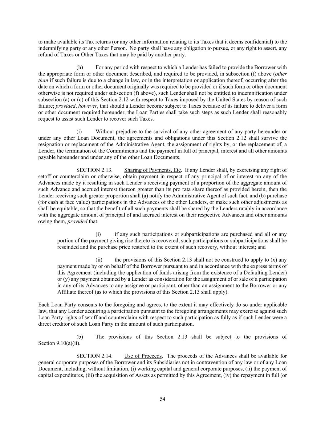 54 to make available its Tax returns (or any other information relating to its Taxes that it deems confidential) to the indemnifying party or any other Person. No party shall have any obligation to pursue, or any right to assert, any refund of Taxes or Other Taxes that may be paid by another party. (h) For any period with respect to which a Lender has failed to provide the Borrower with the appropriate form or other document described, and required to be provided, in subsection (f) above (other than if such failure is due to a change in law, or in the interpretation or application thereof, occurring after the date on which a form or other document originally was required to be provided or if such form or other document otherwise is not required under subsection (f) above), such Lender shall not be entitled to indemnification under subsection (a) or (c) of this Section 2.12 with respect to Taxes imposed by the United States by reason of such failure; provided, however, that should a Lender become subject to Taxes because of its failure to deliver a form or other document required hereunder, the Loan Parties shall take such steps as such Lender shall reasonably request to assist such Lender to recover such Taxes. (i) Without prejudice to the survival of any other agreement of any party hereunder or under any other Loan Document, the agreements and obligations under this Section 2.12 shall survive the resignation or replacement of the Administrative Agent, the assignment of rights by, or the replacement of, a Lender, the termination of the Commitments and the payment in full of principal, interest and all other amounts payable hereunder and under any of the other Loan Documents. SECTION 2.13. Sharing of Payments, Etc. If any Lender shall, by exercising any right of setoff or counterclaim or otherwise, obtain payment in respect of any principal of or interest on any of the Advances made by it resulting in such Lender’s receiving payment of a proportion of the aggregate amount of such Advance and accrued interest thereon greater than its pro rata share thereof as provided herein, then the Lender receiving such greater proportion shall (a) notify the Administrative Agent of such fact, and (b) purchase (for cash at face value) participations in the Advances of the other Lenders, or make such other adjustments as shall be equitable, so that the benefit of all such payments shall be shared by the Lenders ratably in accordance with the aggregate amount of principal of and accrued interest on their respective Advances and other amounts owing them, provided that: (i) if any such participations or subparticipations are purchased and all or any portion of the payment giving rise thereto is recovered, such participations or subparticipations shall be rescinded and the purchase price restored to the extent of such recovery, without interest; and (ii) the provisions of this Section 2.13 shall not be construed to apply to (x) any payment made by or on behalf of the Borrower pursuant to and in accordance with the express terms of this Agreement (including the application of funds arising from the existence of a Defaulting Lender) or (y) any payment obtained by a Lender as consideration for the assignment of or sale of a participation in any of its Advances to any assignee or participant, other than an assignment to the Borrower or any Affiliate thereof (as to which the provisions of this Section 2.13 shall apply). Each Loan Party consents to the foregoing and agrees, to the extent it may effectively do so under applicable law, that any Lender acquiring a participation pursuant to the foregoing arrangements may exercise against such Loan Party rights of setoff and counterclaim with respect to such participation as fully as if such Lender were a direct creditor of such Loan Party in the amount of such participation. (b) The provisions of this Section 2.13 shall be subject to the provisions of Section 9.10(a)(ii). SECTION 2.14. Use of Proceeds. The proceeds of the Advances shall be available for general corporate purposes of the Borrower and its Subsidiaries not in contravention of any law or of any Loan Document, including, without limitation, (i) working capital and general corporate purposes, (ii) the payment of capital expenditures, (iii) the acquisition of Assets as permitted by this Agreement, (iv) the repayment in full (or