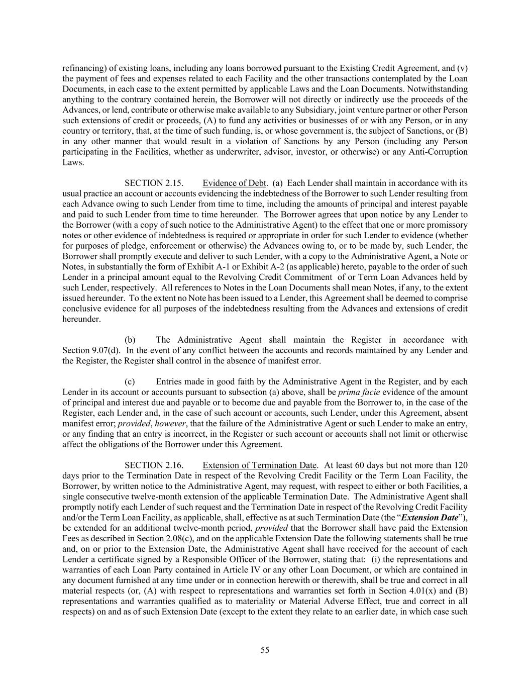 55 refinancing) of existing loans, including any loans borrowed pursuant to the Existing Credit Agreement, and (v) the payment of fees and expenses related to each Facility and the other transactions contemplated by the Loan Documents, in each case to the extent permitted by applicable Laws and the Loan Documents. Notwithstanding anything to the contrary contained herein, the Borrower will not directly or indirectly use the proceeds of the Advances, or lend, contribute or otherwise make available to any Subsidiary, joint venture partner or other Person such extensions of credit or proceeds, (A) to fund any activities or businesses of or with any Person, or in any country or territory, that, at the time of such funding, is, or whose government is, the subject of Sanctions, or (B) in any other manner that would result in a violation of Sanctions by any Person (including any Person participating in the Facilities, whether as underwriter, advisor, investor, or otherwise) or any Anti-Corruption Laws. SECTION 2.15. Evidence of Debt. (a) Each Lender shall maintain in accordance with its usual practice an account or accounts evidencing the indebtedness of the Borrower to such Lender resulting from each Advance owing to such Lender from time to time, including the amounts of principal and interest payable and paid to such Lender from time to time hereunder. The Borrower agrees that upon notice by any Lender to the Borrower (with a copy of such notice to the Administrative Agent) to the effect that one or more promissory notes or other evidence of indebtedness is required or appropriate in order for such Lender to evidence (whether for purposes of pledge, enforcement or otherwise) the Advances owing to, or to be made by, such Lender, the Borrower shall promptly execute and deliver to such Lender, with a copy to the Administrative Agent, a Note or Notes, in substantially the form of Exhibit A-1 or Exhibit A-2 (as applicable) hereto, payable to the order of such Lender in a principal amount equal to the Revolving Credit Commitment of or Term Loan Advances held by such Lender, respectively. All references to Notes in the Loan Documents shall mean Notes, if any, to the extent issued hereunder. To the extent no Note has been issued to a Lender, this Agreement shall be deemed to comprise conclusive evidence for all purposes of the indebtedness resulting from the Advances and extensions of credit hereunder. (b) The Administrative Agent shall maintain the Register in accordance with Section 9.07(d). In the event of any conflict between the accounts and records maintained by any Lender and the Register, the Register shall control in the absence of manifest error. (c) Entries made in good faith by the Administrative Agent in the Register, and by each Lender in its account or accounts pursuant to subsection (a) above, shall be prima facie evidence of the amount of principal and interest due and payable or to become due and payable from the Borrower to, in the case of the Register, each Lender and, in the case of such account or accounts, such Lender, under this Agreement, absent manifest error; provided, however, that the failure of the Administrative Agent or such Lender to make an entry, or any finding that an entry is incorrect, in the Register or such account or accounts shall not limit or otherwise affect the obligations of the Borrower under this Agreement. SECTION 2.16. Extension of Termination Date. At least 60 days but not more than 120 days prior to the Termination Date in respect of the Revolving Credit Facility or the Term Loan Facility, the Borrower, by written notice to the Administrative Agent, may request, with respect to either or both Facilities, a single consecutive twelve-month extension of the applicable Termination Date. The Administrative Agent shall promptly notify each Lender of such request and the Termination Date in respect of the Revolving Credit Facility and/or the Term Loan Facility, as applicable, shall, effective as at such Termination Date (the “Extension Date”), be extended for an additional twelve-month period, provided that the Borrower shall have paid the Extension Fees as described in Section 2.08(c), and on the applicable Extension Date the following statements shall be true and, on or prior to the Extension Date, the Administrative Agent shall have received for the account of each Lender a certificate signed by a Responsible Officer of the Borrower, stating that: (i) the representations and warranties of each Loan Party contained in Article IV or any other Loan Document, or which are contained in any document furnished at any time under or in connection herewith or therewith, shall be true and correct in all material respects (or, (A) with respect to representations and warranties set forth in Section 4.01(x) and (B) representations and warranties qualified as to materiality or Material Adverse Effect, true and correct in all respects) on and as of such Extension Date (except to the extent they relate to an earlier date, in which case such