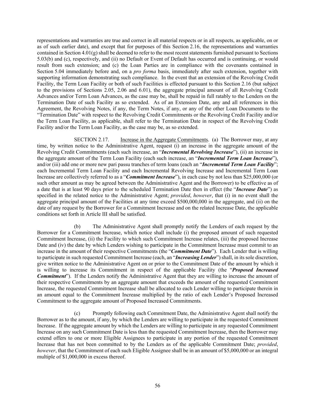 56 representations and warranties are true and correct in all material respects or in all respects, as applicable, on or as of such earlier date), and except that for purposes of this Section 2.16, the representations and warranties contained in Section 4.01(g) shall be deemed to refer to the most recent statements furnished pursuant to Sections 5.03(b) and (c), respectively, and (ii) no Default or Event of Default has occurred and is continuing, or would result from such extension; and (c) the Loan Parties are in compliance with the covenants contained in Section 5.04 immediately before and, on a pro forma basis, immediately after such extension, together with supporting information demonstrating such compliance. In the event that an extension of the Revolving Credit Facility, the Term Loan Facility or both of such Facilities is effected pursuant to this Section 2.16 (but subject to the provisions of Sections 2.05, 2.06 and 6.01), the aggregate principal amount of all Revolving Credit Advances and/or Term Loan Advances, as the case may be, shall be repaid in full ratably to the Lenders on the Termination Date of such Facility as so extended. As of an Extension Date, any and all references in this Agreement, the Revolving Notes, if any, the Term Notes, if any, or any of the other Loan Documents to the “Termination Date” with respect to the Revolving Credit Commitments or the Revolving Credit Facility and/or the Term Loan Facility, as applicable, shall refer to the Termination Date in respect of the Revolving Credit Facility and/or the Term Loan Facility, as the case may be, as so extended. SECTION 2.17. Increase in the Aggregate Commitments. (a) The Borrower may, at any time, by written notice to the Administrative Agent, request (i) an increase in the aggregate amount of the Revolving Credit Commitments (each such increase, an “Incremental Revolving Increase”), (ii) an increase in the aggregate amount of the Term Loan Facility (each such increase, an “Incremental Term Loan Increase”), and/or (iii) add one or more new pari passu tranches of term loans (each an “Incremental Term Loan Facility”; each Incremental Term Loan Facility and each Incremental Revolving Increase and Incremental Term Loan Increase are collectively referred to as a “Commitment Increase”), in each case by not less than $25,000,000 (or such other amount as may be agreed between the Administrative Agent and the Borrower) to be effective as of a date that is at least 90 days prior to the scheduled Termination Date then in effect (the “Increase Date”) as specified in the related notice to the Administrative Agent; provided, however, that (i) in no event shall the aggregate principal amount of the Facilities at any time exceed $500,000,000 in the aggregate, and (ii) on the date of any request by the Borrower for a Commitment Increase and on the related Increase Date, the applicable conditions set forth in Article III shall be satisfied. (b) The Administrative Agent shall promptly notify the Lenders of each request by the Borrower for a Commitment Increase, which notice shall include (i) the proposed amount of such requested Commitment Increase, (ii) the Facility to which such Commitment Increase relates, (iii) the proposed Increase Date and (iv) the date by which Lenders wishing to participate in the Commitment Increase must commit to an increase in the amount of their respective Commitments (the “Commitment Date”). Each Lender that is willing to participate in such requested Commitment Increase (each, an “Increasing Lender”) shall, in its sole discretion, give written notice to the Administrative Agent on or prior to the Commitment Date of the amount by which it is willing to increase its Commitment in respect of the applicable Facility (the “Proposed Increased Commitment”). If the Lenders notify the Administrative Agent that they are willing to increase the amount of their respective Commitments by an aggregate amount that exceeds the amount of the requested Commitment Increase, the requested Commitment Increase shall be allocated to each Lender willing to participate therein in an amount equal to the Commitment Increase multiplied by the ratio of each Lender’s Proposed Increased Commitment to the aggregate amount of Proposed Increased Commitments. (c) Promptly following each Commitment Date, the Administrative Agent shall notify the Borrower as to the amount, if any, by which the Lenders are willing to participate in the requested Commitment Increase. If the aggregate amount by which the Lenders are willing to participate in any requested Commitment Increase on any such Commitment Date is less than the requested Commitment Increase, then the Borrower may extend offers to one or more Eligible Assignees to participate in any portion of the requested Commitment Increase that has not been committed to by the Lenders as of the applicable Commitment Date; provided, however, that the Commitment of each such Eligible Assignee shall be in an amount of $5,000,000 or an integral multiple of $1,000,000 in excess thereof.