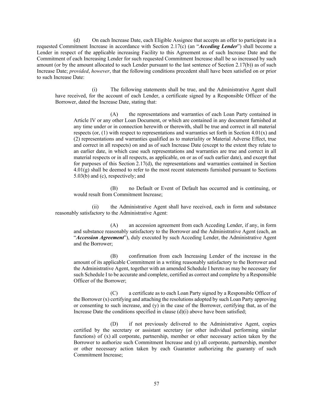 57 (d) On each Increase Date, each Eligible Assignee that accepts an offer to participate in a requested Commitment Increase in accordance with Section 2.17(c) (an “Acceding Lender”) shall become a Lender in respect of the applicable increasing Facility to this Agreement as of such Increase Date and the Commitment of each Increasing Lender for such requested Commitment Increase shall be so increased by such amount (or by the amount allocated to such Lender pursuant to the last sentence of Section 2.17(b)) as of such Increase Date; provided, however, that the following conditions precedent shall have been satisfied on or prior to such Increase Date: (i) The following statements shall be true, and the Administrative Agent shall have received, for the account of each Lender, a certificate signed by a Responsible Officer of the Borrower, dated the Increase Date, stating that: (A) the representations and warranties of each Loan Party contained in Article IV or any other Loan Document, or which are contained in any document furnished at any time under or in connection herewith or therewith, shall be true and correct in all material respects (or, (1) with respect to representations and warranties set forth in Section 4.01(x) and (2) representations and warranties qualified as to materiality or Material Adverse Effect, true and correct in all respects) on and as of such Increase Date (except to the extent they relate to an earlier date, in which case such representations and warranties are true and correct in all material respects or in all respects, as applicable, on or as of such earlier date), and except that for purposes of this Section 2.17(d), the representations and warranties contained in Section 4.01(g) shall be deemed to refer to the most recent statements furnished pursuant to Sections 5.03(b) and (c), respectively; and (B) no Default or Event of Default has occurred and is continuing, or would result from Commitment Increase; (ii) the Administrative Agent shall have received, each in form and substance reasonably satisfactory to the Administrative Agent: (A) an accession agreement from each Acceding Lender, if any, in form and substance reasonably satisfactory to the Borrower and the Administrative Agent (each, an “Accession Agreement”), duly executed by such Acceding Lender, the Administrative Agent and the Borrower; (B) confirmation from each Increasing Lender of the increase in the amount of its applicable Commitment in a writing reasonably satisfactory to the Borrower and the Administrative Agent, together with an amended Schedule I hereto as may be necessary for such Schedule I to be accurate and complete, certified as correct and complete by a Responsible Officer of the Borrower; (C) a certificate as to each Loan Party signed by a Responsible Officer of the Borrower (x) certifying and attaching the resolutions adopted by such Loan Party approving or consenting to such increase, and (y) in the case of the Borrower, certifying that, as of the Increase Date the conditions specified in clause (d)(i) above have been satisfied; (D) if not previously delivered to the Administrative Agent, copies certified by the secretary or assistant secretary (or other individual performing similar functions) of (x) all corporate, partnership, member or other necessary action taken by the Borrower to authorize such Commitment Increase and (y) all corporate, partnership, member or other necessary action taken by each Guarantor authorizing the guaranty of such Commitment Increase;