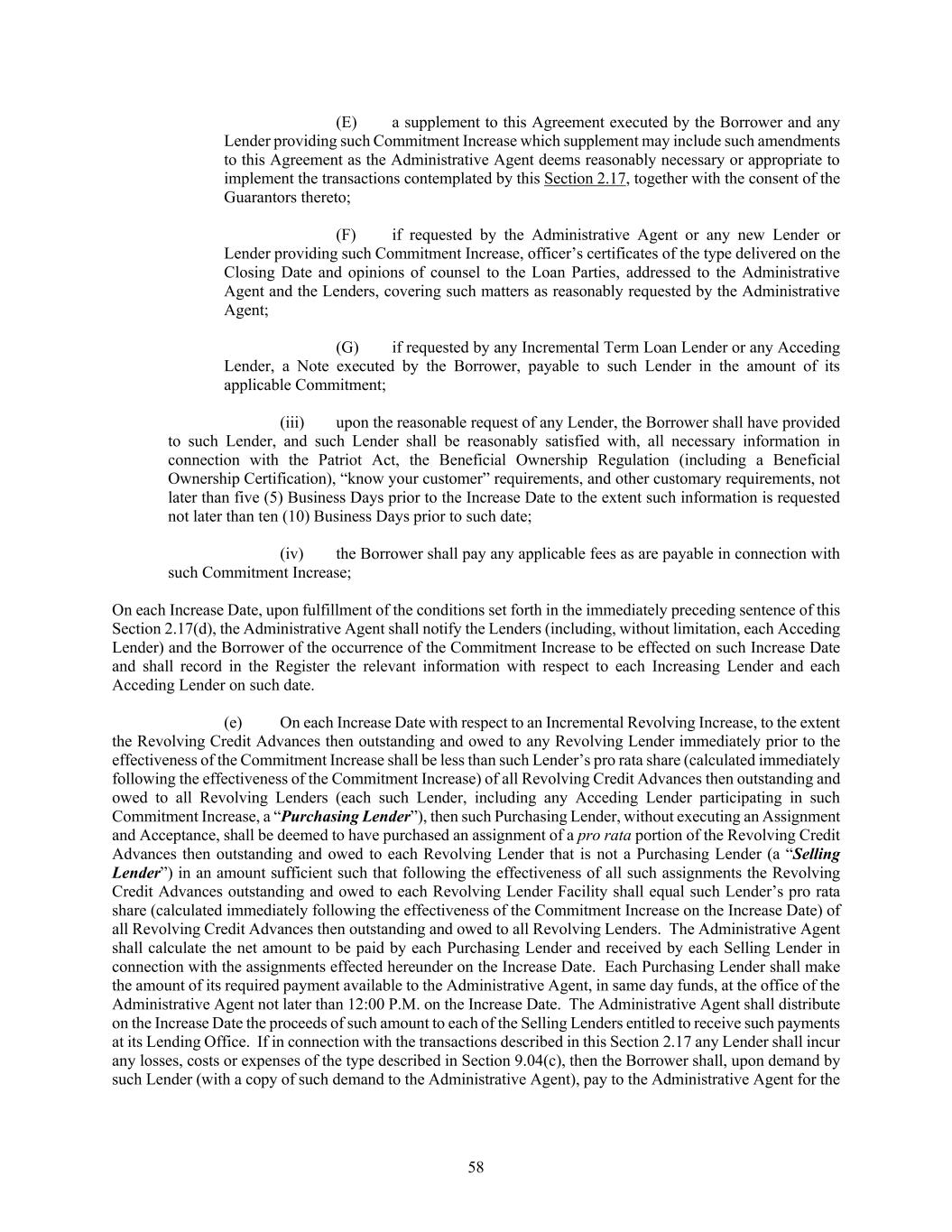 58 (E) a supplement to this Agreement executed by the Borrower and any Lender providing such Commitment Increase which supplement may include such amendments to this Agreement as the Administrative Agent deems reasonably necessary or appropriate to implement the transactions contemplated by this Section 2.17, together with the consent of the Guarantors thereto; (F) if requested by the Administrative Agent or any new Lender or Lender providing such Commitment Increase, officer’s certificates of the type delivered on the Closing Date and opinions of counsel to the Loan Parties, addressed to the Administrative Agent and the Lenders, covering such matters as reasonably requested by the Administrative Agent; (G) if requested by any Incremental Term Loan Lender or any Acceding Lender, a Note executed by the Borrower, payable to such Lender in the amount of its applicable Commitment; (iii) upon the reasonable request of any Lender, the Borrower shall have provided to such Lender, and such Lender shall be reasonably satisfied with, all necessary information in connection with the Patriot Act, the Beneficial Ownership Regulation (including a Beneficial Ownership Certification), “know your customer” requirements, and other customary requirements, not later than five (5) Business Days prior to the Increase Date to the extent such information is requested not later than ten (10) Business Days prior to such date; (iv) the Borrower shall pay any applicable fees as are payable in connection with such Commitment Increase; On each Increase Date, upon fulfillment of the conditions set forth in the immediately preceding sentence of this Section 2.17(d), the Administrative Agent shall notify the Lenders (including, without limitation, each Acceding Lender) and the Borrower of the occurrence of the Commitment Increase to be effected on such Increase Date and shall record in the Register the relevant information with respect to each Increasing Lender and each Acceding Lender on such date. (e) On each Increase Date with respect to an Incremental Revolving Increase, to the extent the Revolving Credit Advances then outstanding and owed to any Revolving Lender immediately prior to the effectiveness of the Commitment Increase shall be less than such Lender’s pro rata share (calculated immediately following the effectiveness of the Commitment Increase) of all Revolving Credit Advances then outstanding and owed to all Revolving Lenders (each such Lender, including any Acceding Lender participating in such Commitment Increase, a “Purchasing Lender”), then such Purchasing Lender, without executing an Assignment and Acceptance, shall be deemed to have purchased an assignment of a pro rata portion of the Revolving Credit Advances then outstanding and owed to each Revolving Lender that is not a Purchasing Lender (a “Selling Lender”) in an amount sufficient such that following the effectiveness of all such assignments the Revolving Credit Advances outstanding and owed to each Revolving Lender Facility shall equal such Lender’s pro rata share (calculated immediately following the effectiveness of the Commitment Increase on the Increase Date) of all Revolving Credit Advances then outstanding and owed to all Revolving Lenders. The Administrative Agent shall calculate the net amount to be paid by each Purchasing Lender and received by each Selling Lender in connection with the assignments effected hereunder on the Increase Date. Each Purchasing Lender shall make the amount of its required payment available to the Administrative Agent, in same day funds, at the office of the Administrative Agent not later than 12:00 P.M. on the Increase Date. The Administrative Agent shall distribute on the Increase Date the proceeds of such amount to each of the Selling Lenders entitled to receive such payments at its Lending Office. If in connection with the transactions described in this Section 2.17 any Lender shall incur any losses, costs or expenses of the type described in Section 9.04(c), then the Borrower shall, upon demand by such Lender (with a copy of such demand to the Administrative Agent), pay to the Administrative Agent for the
