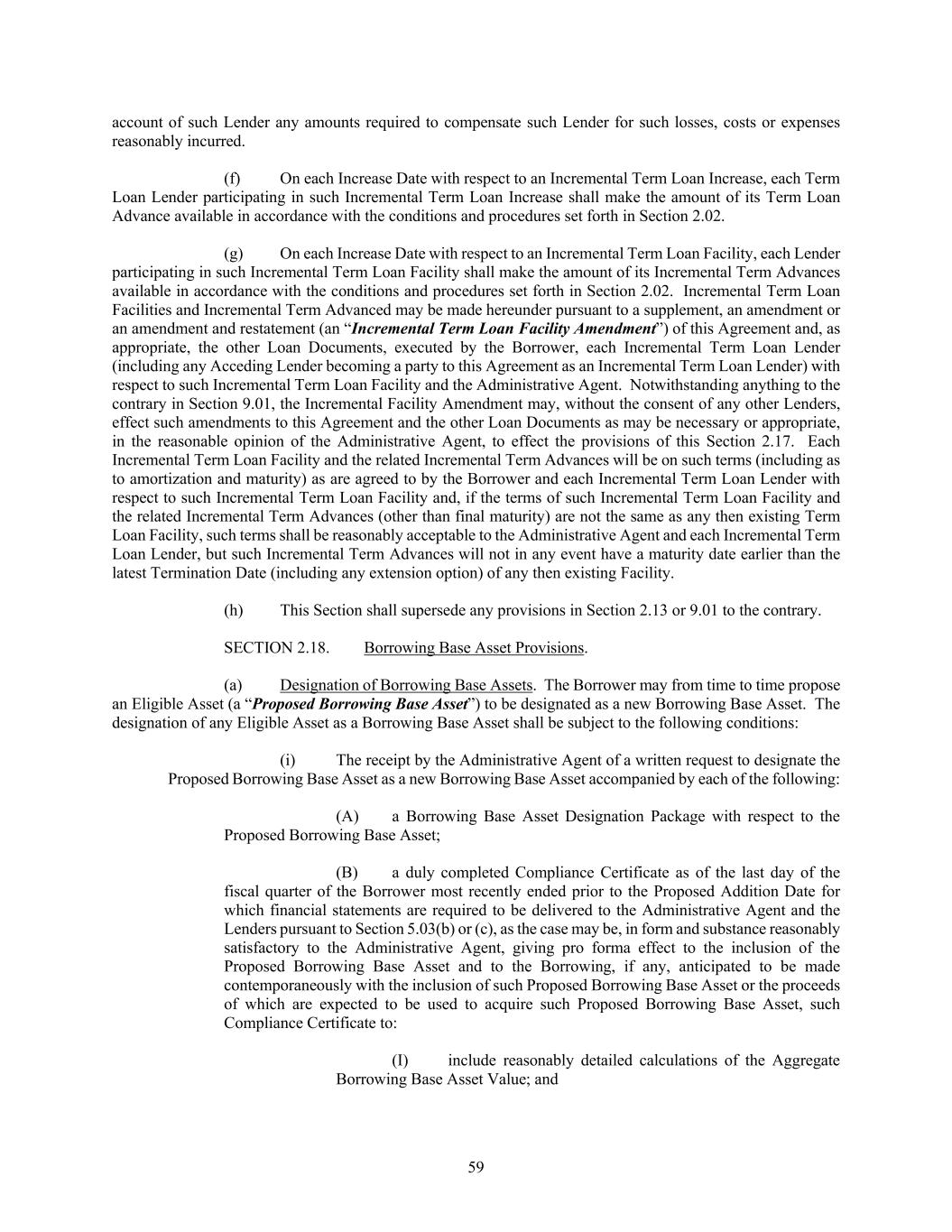 59 account of such Lender any amounts required to compensate such Lender for such losses, costs or expenses reasonably incurred. (f) On each Increase Date with respect to an Incremental Term Loan Increase, each Term Loan Lender participating in such Incremental Term Loan Increase shall make the amount of its Term Loan Advance available in accordance with the conditions and procedures set forth in Section 2.02. (g) On each Increase Date with respect to an Incremental Term Loan Facility, each Lender participating in such Incremental Term Loan Facility shall make the amount of its Incremental Term Advances available in accordance with the conditions and procedures set forth in Section 2.02. Incremental Term Loan Facilities and Incremental Term Advanced may be made hereunder pursuant to a supplement, an amendment or an amendment and restatement (an “Incremental Term Loan Facility Amendment”) of this Agreement and, as appropriate, the other Loan Documents, executed by the Borrower, each Incremental Term Loan Lender (including any Acceding Lender becoming a party to this Agreement as an Incremental Term Loan Lender) with respect to such Incremental Term Loan Facility and the Administrative Agent. Notwithstanding anything to the contrary in Section 9.01, the Incremental Facility Amendment may, without the consent of any other Lenders, effect such amendments to this Agreement and the other Loan Documents as may be necessary or appropriate, in the reasonable opinion of the Administrative Agent, to effect the provisions of this Section 2.17. Each Incremental Term Loan Facility and the related Incremental Term Advances will be on such terms (including as to amortization and maturity) as are agreed to by the Borrower and each Incremental Term Loan Lender with respect to such Incremental Term Loan Facility and, if the terms of such Incremental Term Loan Facility and the related Incremental Term Advances (other than final maturity) are not the same as any then existing Term Loan Facility, such terms shall be reasonably acceptable to the Administrative Agent and each Incremental Term Loan Lender, but such Incremental Term Advances will not in any event have a maturity date earlier than the latest Termination Date (including any extension option) of any then existing Facility. (h) This Section shall supersede any provisions in Section 2.13 or 9.01 to the contrary. SECTION 2.18. Borrowing Base Asset Provisions. (a) Designation of Borrowing Base Assets. The Borrower may from time to time propose an Eligible Asset (a “Proposed Borrowing Base Asset”) to be designated as a new Borrowing Base Asset. The designation of any Eligible Asset as a Borrowing Base Asset shall be subject to the following conditions: (i) The receipt by the Administrative Agent of a written request to designate the Proposed Borrowing Base Asset as a new Borrowing Base Asset accompanied by each of the following: (A) a Borrowing Base Asset Designation Package with respect to the Proposed Borrowing Base Asset; (B) a duly completed Compliance Certificate as of the last day of the fiscal quarter of the Borrower most recently ended prior to the Proposed Addition Date for which financial statements are required to be delivered to the Administrative Agent and the Lenders pursuant to Section 5.03(b) or (c), as the case may be, in form and substance reasonably satisfactory to the Administrative Agent, giving pro forma effect to the inclusion of the Proposed Borrowing Base Asset and to the Borrowing, if any, anticipated to be made contemporaneously with the inclusion of such Proposed Borrowing Base Asset or the proceeds of which are expected to be used to acquire such Proposed Borrowing Base Asset, such Compliance Certificate to: (I) include reasonably detailed calculations of the Aggregate Borrowing Base Asset Value; and