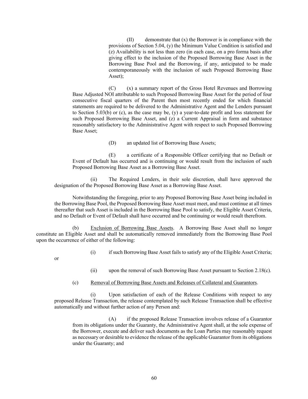 60 (II) demonstrate that (x) the Borrower is in compliance with the provisions of Section 5.04, (y) the Minimum Value Condition is satisfied and (z) Availability is not less than zero (in each case, on a pro forma basis after giving effect to the inclusion of the Proposed Borrowing Base Asset in the Borrowing Base Pool and the Borrowing, if any, anticipated to be made contemporaneously with the inclusion of such Proposed Borrowing Base Asset); (C) (x) a summary report of the Gross Hotel Revenues and Borrowing Base Adjusted NOI attributable to such Proposed Borrowing Base Asset for the period of four consecutive fiscal quarters of the Parent then most recently ended for which financial statements are required to be delivered to the Administrative Agent and the Lenders pursuant to Section 5.03(b) or (c), as the case may be, (y) a year-to-date profit and loss statement for such Proposed Borrowing Base Asset, and (z) a Current Appraisal in form and substance reasonably satisfactory to the Administrative Agent with respect to such Proposed Borrowing Base Asset; (D) an updated list of Borrowing Base Assets; (E) a certificate of a Responsible Officer certifying that no Default or Event of Default has occurred and is continuing or would result from the inclusion of such Proposed Borrowing Base Asset as a Borrowing Base Asset. (ii) The Required Lenders, in their sole discretion, shall have approved the designation of the Proposed Borrowing Base Asset as a Borrowing Base Asset. Notwithstanding the foregoing, prior to any Proposed Borrowing Base Asset being included in the Borrowing Base Pool, the Proposed Borrowing Base Asset must meet, and must continue at all times thereafter that such Asset is included in the Borrowing Base Pool to satisfy, the Eligible Asset Criteria, and no Default or Event of Default shall have occurred and be continuing or would result therefrom. (b) Exclusion of Borrowing Base Assets. A Borrowing Base Asset shall no longer constitute an Eligible Asset and shall be automatically removed immediately from the Borrowing Base Pool upon the occurrence of either of the following: (i) if such Borrowing Base Asset fails to satisfy any of the Eligible Asset Criteria; or (ii) upon the removal of such Borrowing Base Asset pursuant to Section 2.18(c). (c) Removal of Borrowing Base Assets and Releases of Collateral and Guarantors. (i) Upon satisfaction of each of the Release Conditions with respect to any proposed Release Transaction, the release contemplated by such Release Transaction shall be effective automatically and without further action of any Person and: (A) if the proposed Release Transaction involves release of a Guarantor from its obligations under the Guaranty, the Administrative Agent shall, at the sole expense of the Borrower, execute and deliver such documents as the Loan Parties may reasonably request as necessary or desirable to evidence the release of the applicable Guarantor from its obligations under the Guaranty; and