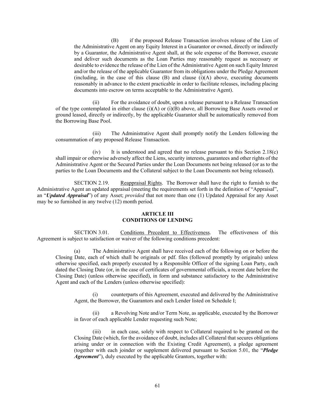 61 (B) if the proposed Release Transaction involves release of the Lien of the Administrative Agent on any Equity Interest in a Guarantor or owned, directly or indirectly by a Guarantor, the Administrative Agent shall, at the sole expense of the Borrower, execute and deliver such documents as the Loan Parties may reasonably request as necessary or desirable to evidence the release of the Lien of the Administrative Agent on such Equity Interest and/or the release of the applicable Guarantor from its obligations under the Pledge Agreement (including, in the case of this clause (B) and clause (i)(A) above, executing documents reasonably in advance to the extent practicable in order to facilitate releases, including placing documents into escrow on terms acceptable to the Administrative Agent). (ii) For the avoidance of doubt, upon a release pursuant to a Release Transaction of the type contemplated in either clause (i)(A) or (i)(B) above, all Borrowing Base Assets owned or ground leased, directly or indirectly, by the applicable Guarantor shall be automatically removed from the Borrowing Base Pool. (iii) The Administrative Agent shall promptly notify the Lenders following the consummation of any proposed Release Transaction. (iv) It is understood and agreed that no release pursuant to this Section 2.18(c) shall impair or otherwise adversely affect the Liens, security interests, guarantees and other rights of the Administrative Agent or the Secured Parties under the Loan Documents not being released (or as to the parties to the Loan Documents and the Collateral subject to the Loan Documents not being released). SECTION 2.19. Reappraisal Rights. The Borrower shall have the right to furnish to the Administrative Agent an updated appraisal (meeting the requirements set forth in the definition of “Appraisal”, an “Updated Appraisal”) of any Asset; provided that not more than one (1) Updated Appraisal for any Asset may be so furnished in any twelve (12) month period. ARTICLE III CONDITIONS OF LENDING SECTION 3.01. Conditions Precedent to Effectiveness. The effectiveness of this Agreement is subject to satisfaction or waiver of the following conditions precedent: (a) The Administrative Agent shall have received each of the following on or before the Closing Date, each of which shall be originals or pdf. files (followed promptly by originals) unless otherwise specified, each properly executed by a Responsible Officer of the signing Loan Party, each dated the Closing Date (or, in the case of certificates of governmental officials, a recent date before the Closing Date) (unless otherwise specified), in form and substance satisfactory to the Administrative Agent and each of the Lenders (unless otherwise specified): (i) counterparts of this Agreement, executed and delivered by the Administrative Agent, the Borrower, the Guarantors and each Lender listed on Schedule I; (ii) a Revolving Note and/or Term Note, as applicable, executed by the Borrower in favor of each applicable Lender requesting such Note; (iii) in each case, solely with respect to Collateral required to be granted on the Closing Date (which, for the avoidance of doubt, includes all Collateral that secures obligations arising under or in connection with the Existing Credit Agreement), a pledge agreement (together with each joinder or supplement delivered pursuant to Section 5.01, the “Pledge Agreement”), duly executed by the applicable Grantors, together with: