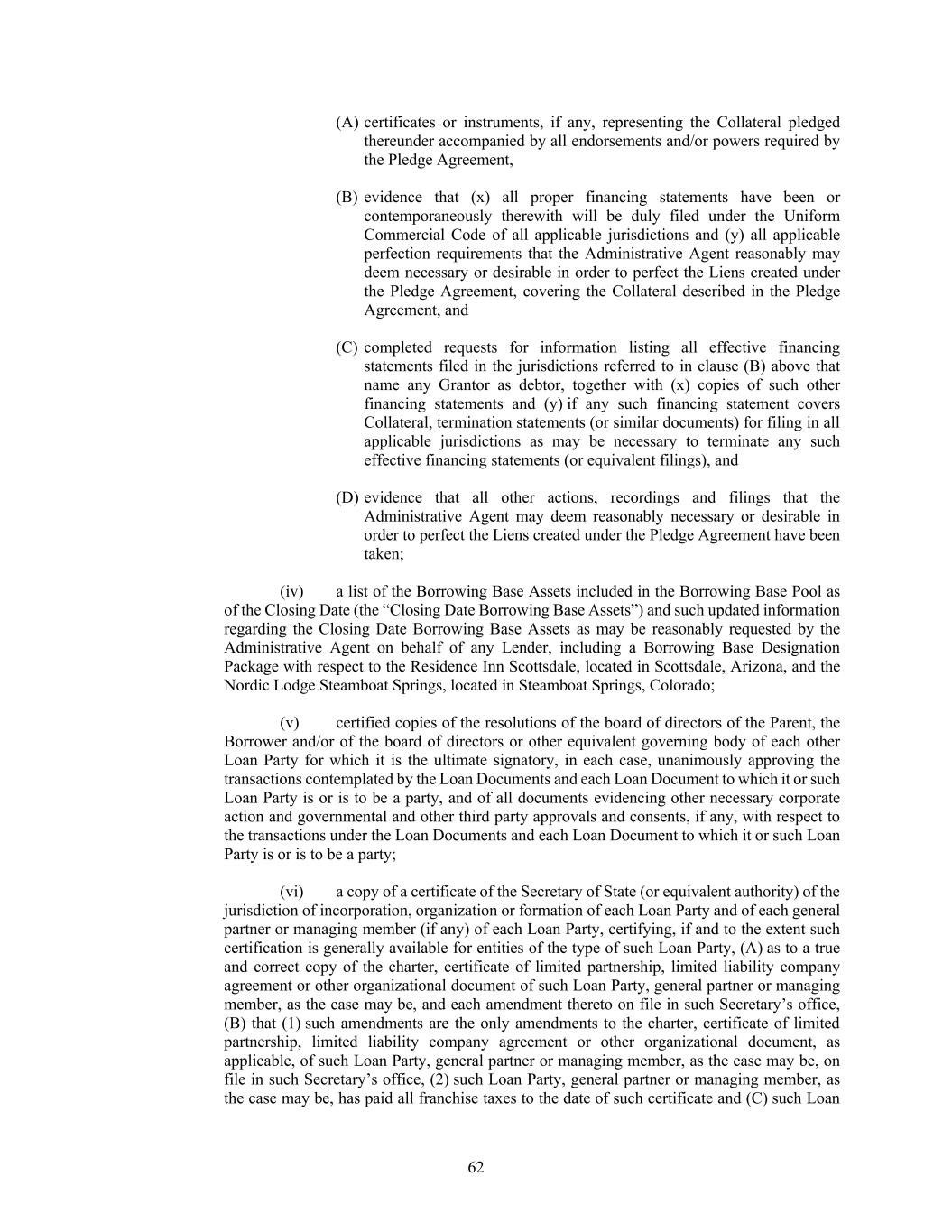 62 (A) certificates or instruments, if any, representing the Collateral pledged thereunder accompanied by all endorsements and/or powers required by the Pledge Agreement, (B) evidence that (x) all proper financing statements have been or contemporaneously therewith will be duly filed under the Uniform Commercial Code of all applicable jurisdictions and (y) all applicable perfection requirements that the Administrative Agent reasonably may deem necessary or desirable in order to perfect the Liens created under the Pledge Agreement, covering the Collateral described in the Pledge Agreement, and (C) completed requests for information listing all effective financing statements filed in the jurisdictions referred to in clause (B) above that name any Grantor as debtor, together with (x) copies of such other financing statements and (y) if any such financing statement covers Collateral, termination statements (or similar documents) for filing in all applicable jurisdictions as may be necessary to terminate any such effective financing statements (or equivalent filings), and (D) evidence that all other actions, recordings and filings that the Administrative Agent may deem reasonably necessary or desirable in order to perfect the Liens created under the Pledge Agreement have been taken; (iv) a list of the Borrowing Base Assets included in the Borrowing Base Pool as of the Closing Date (the “Closing Date Borrowing Base Assets”) and such updated information regarding the Closing Date Borrowing Base Assets as may be reasonably requested by the Administrative Agent on behalf of any Lender, including a Borrowing Base Designation Package with respect to the Residence Inn Scottsdale, located in Scottsdale, Arizona, and the Nordic Lodge Steamboat Springs, located in Steamboat Springs, Colorado; (v) certified copies of the resolutions of the board of directors of the Parent, the Borrower and/or of the board of directors or other equivalent governing body of each other Loan Party for which it is the ultimate signatory, in each case, unanimously approving the transactions contemplated by the Loan Documents and each Loan Document to which it or such Loan Party is or is to be a party, and of all documents evidencing other necessary corporate action and governmental and other third party approvals and consents, if any, with respect to the transactions under the Loan Documents and each Loan Document to which it or such Loan Party is or is to be a party; (vi) a copy of a certificate of the Secretary of State (or equivalent authority) of the jurisdiction of incorporation, organization or formation of each Loan Party and of each general partner or managing member (if any) of each Loan Party, certifying, if and to the extent such certification is generally available for entities of the type of such Loan Party, (A) as to a true and correct copy of the charter, certificate of limited partnership, limited liability company agreement or other organizational document of such Loan Party, general partner or managing member, as the case may be, and each amendment thereto on file in such Secretary’s office, (B) that (1) such amendments are the only amendments to the charter, certificate of limited partnership, limited liability company agreement or other organizational document, as applicable, of such Loan Party, general partner or managing member, as the case may be, on file in such Secretary’s office, (2) such Loan Party, general partner or managing member, as the case may be, has paid all franchise taxes to the date of such certificate and (C) such Loan