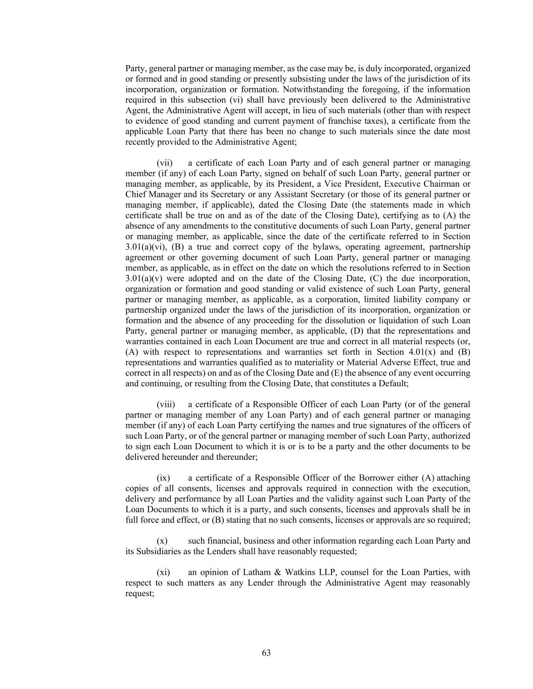 63 Party, general partner or managing member, as the case may be, is duly incorporated, organized or formed and in good standing or presently subsisting under the laws of the jurisdiction of its incorporation, organization or formation. Notwithstanding the foregoing, if the information required in this subsection (vi) shall have previously been delivered to the Administrative Agent, the Administrative Agent will accept, in lieu of such materials (other than with respect to evidence of good standing and current payment of franchise taxes), a certificate from the applicable Loan Party that there has been no change to such materials since the date most recently provided to the Administrative Agent; (vii) a certificate of each Loan Party and of each general partner or managing member (if any) of each Loan Party, signed on behalf of such Loan Party, general partner or managing member, as applicable, by its President, a Vice President, Executive Chairman or Chief Manager and its Secretary or any Assistant Secretary (or those of its general partner or managing member, if applicable), dated the Closing Date (the statements made in which certificate shall be true on and as of the date of the Closing Date), certifying as to (A) the absence of any amendments to the constitutive documents of such Loan Party, general partner or managing member, as applicable, since the date of the certificate referred to in Section 3.01(a)(vi), (B) a true and correct copy of the bylaws, operating agreement, partnership agreement or other governing document of such Loan Party, general partner or managing member, as applicable, as in effect on the date on which the resolutions referred to in Section 3.01(a)(v) were adopted and on the date of the Closing Date, (C) the due incorporation, organization or formation and good standing or valid existence of such Loan Party, general partner or managing member, as applicable, as a corporation, limited liability company or partnership organized under the laws of the jurisdiction of its incorporation, organization or formation and the absence of any proceeding for the dissolution or liquidation of such Loan Party, general partner or managing member, as applicable, (D) that the representations and warranties contained in each Loan Document are true and correct in all material respects (or, (A) with respect to representations and warranties set forth in Section 4.01(x) and (B) representations and warranties qualified as to materiality or Material Adverse Effect, true and correct in all respects) on and as of the Closing Date and (E) the absence of any event occurring and continuing, or resulting from the Closing Date, that constitutes a Default; (viii) a certificate of a Responsible Officer of each Loan Party (or of the general partner or managing member of any Loan Party) and of each general partner or managing member (if any) of each Loan Party certifying the names and true signatures of the officers of such Loan Party, or of the general partner or managing member of such Loan Party, authorized to sign each Loan Document to which it is or is to be a party and the other documents to be delivered hereunder and thereunder; (ix) a certificate of a Responsible Officer of the Borrower either (A) attaching copies of all consents, licenses and approvals required in connection with the execution, delivery and performance by all Loan Parties and the validity against such Loan Party of the Loan Documents to which it is a party, and such consents, licenses and approvals shall be in full force and effect, or (B) stating that no such consents, licenses or approvals are so required; (x) such financial, business and other information regarding each Loan Party and its Subsidiaries as the Lenders shall have reasonably requested; (xi) an opinion of Latham & Watkins LLP, counsel for the Loan Parties, with respect to such matters as any Lender through the Administrative Agent may reasonably request;