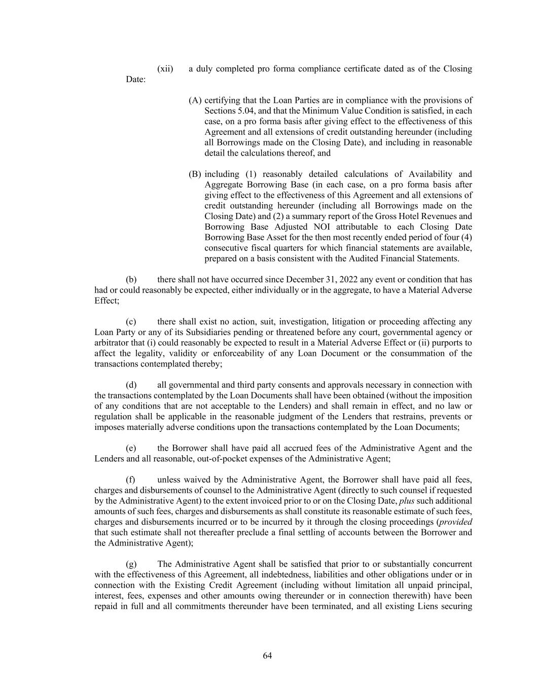 64 (xii) a duly completed pro forma compliance certificate dated as of the Closing Date: (A) certifying that the Loan Parties are in compliance with the provisions of Sections 5.04, and that the Minimum Value Condition is satisfied, in each case, on a pro forma basis after giving effect to the effectiveness of this Agreement and all extensions of credit outstanding hereunder (including all Borrowings made on the Closing Date), and including in reasonable detail the calculations thereof, and (B) including (1) reasonably detailed calculations of Availability and Aggregate Borrowing Base (in each case, on a pro forma basis after giving effect to the effectiveness of this Agreement and all extensions of credit outstanding hereunder (including all Borrowings made on the Closing Date) and (2) a summary report of the Gross Hotel Revenues and Borrowing Base Adjusted NOI attributable to each Closing Date Borrowing Base Asset for the then most recently ended period of four (4) consecutive fiscal quarters for which financial statements are available, prepared on a basis consistent with the Audited Financial Statements. (b) there shall not have occurred since December 31, 2022 any event or condition that has had or could reasonably be expected, either individually or in the aggregate, to have a Material Adverse Effect; (c) there shall exist no action, suit, investigation, litigation or proceeding affecting any Loan Party or any of its Subsidiaries pending or threatened before any court, governmental agency or arbitrator that (i) could reasonably be expected to result in a Material Adverse Effect or (ii) purports to affect the legality, validity or enforceability of any Loan Document or the consummation of the transactions contemplated thereby; (d) all governmental and third party consents and approvals necessary in connection with the transactions contemplated by the Loan Documents shall have been obtained (without the imposition of any conditions that are not acceptable to the Lenders) and shall remain in effect, and no law or regulation shall be applicable in the reasonable judgment of the Lenders that restrains, prevents or imposes materially adverse conditions upon the transactions contemplated by the Loan Documents; (e) the Borrower shall have paid all accrued fees of the Administrative Agent and the Lenders and all reasonable, out-of-pocket expenses of the Administrative Agent; (f) unless waived by the Administrative Agent, the Borrower shall have paid all fees, charges and disbursements of counsel to the Administrative Agent (directly to such counsel if requested by the Administrative Agent) to the extent invoiced prior to or on the Closing Date, plus such additional amounts of such fees, charges and disbursements as shall constitute its reasonable estimate of such fees, charges and disbursements incurred or to be incurred by it through the closing proceedings (provided that such estimate shall not thereafter preclude a final settling of accounts between the Borrower and the Administrative Agent); (g) The Administrative Agent shall be satisfied that prior to or substantially concurrent with the effectiveness of this Agreement, all indebtedness, liabilities and other obligations under or in connection with the Existing Credit Agreement (including without limitation all unpaid principal, interest, fees, expenses and other amounts owing thereunder or in connection therewith) have been repaid in full and all commitments thereunder have been terminated, and all existing Liens securing