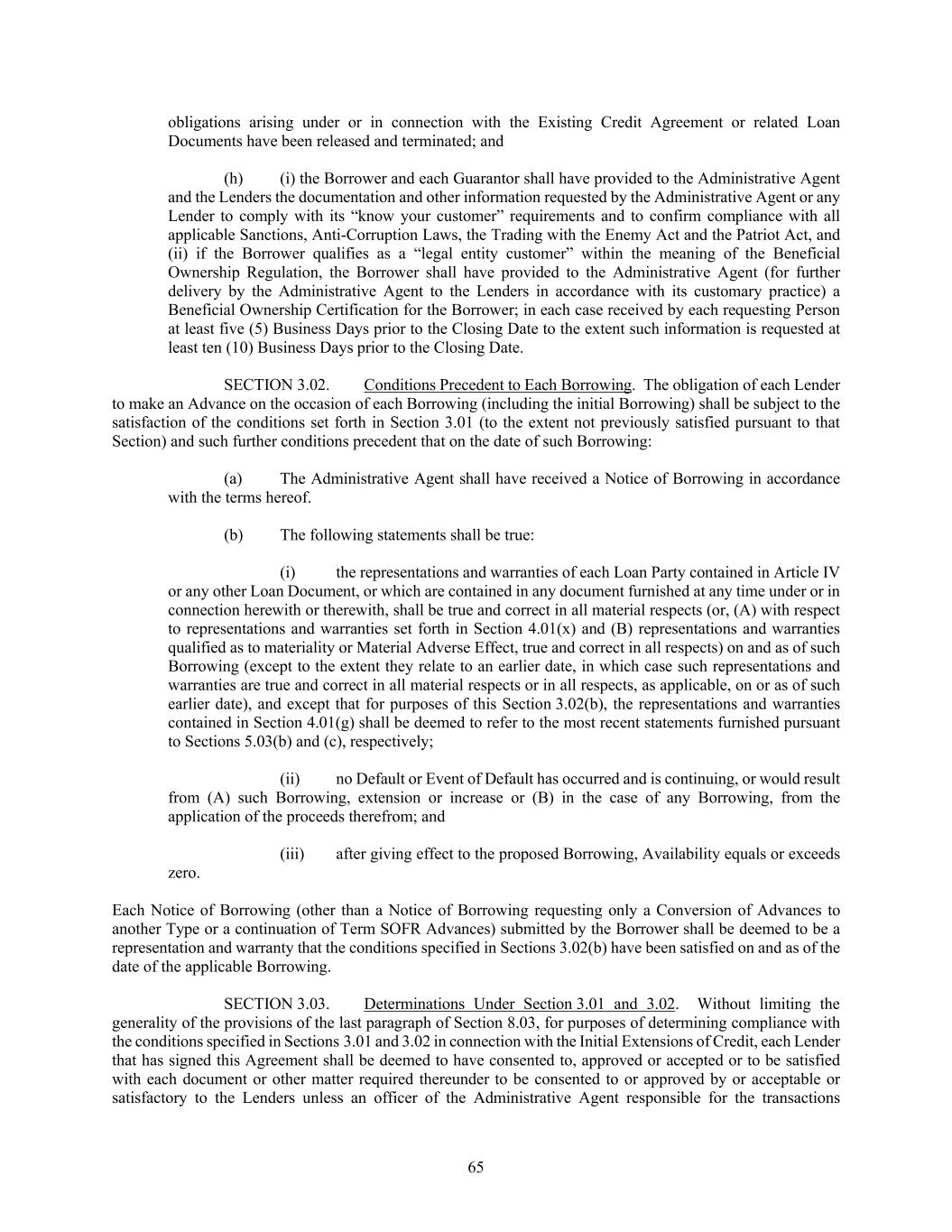 65 obligations arising under or in connection with the Existing Credit Agreement or related Loan Documents have been released and terminated; and (h) (i) the Borrower and each Guarantor shall have provided to the Administrative Agent and the Lenders the documentation and other information requested by the Administrative Agent or any Lender to comply with its “know your customer” requirements and to confirm compliance with all applicable Sanctions, Anti-Corruption Laws, the Trading with the Enemy Act and the Patriot Act, and (ii) if the Borrower qualifies as a “legal entity customer” within the meaning of the Beneficial Ownership Regulation, the Borrower shall have provided to the Administrative Agent (for further delivery by the Administrative Agent to the Lenders in accordance with its customary practice) a Beneficial Ownership Certification for the Borrower; in each case received by each requesting Person at least five (5) Business Days prior to the Closing Date to the extent such information is requested at least ten (10) Business Days prior to the Closing Date. SECTION 3.02. Conditions Precedent to Each Borrowing. The obligation of each Lender to make an Advance on the occasion of each Borrowing (including the initial Borrowing) shall be subject to the satisfaction of the conditions set forth in Section 3.01 (to the extent not previously satisfied pursuant to that Section) and such further conditions precedent that on the date of such Borrowing: (a) The Administrative Agent shall have received a Notice of Borrowing in accordance with the terms hereof. (b) The following statements shall be true: (i) the representations and warranties of each Loan Party contained in Article IV or any other Loan Document, or which are contained in any document furnished at any time under or in connection herewith or therewith, shall be true and correct in all material respects (or, (A) with respect to representations and warranties set forth in Section 4.01(x) and (B) representations and warranties qualified as to materiality or Material Adverse Effect, true and correct in all respects) on and as of such Borrowing (except to the extent they relate to an earlier date, in which case such representations and warranties are true and correct in all material respects or in all respects, as applicable, on or as of such earlier date), and except that for purposes of this Section 3.02(b), the representations and warranties contained in Section 4.01(g) shall be deemed to refer to the most recent statements furnished pursuant to Sections 5.03(b) and (c), respectively; (ii) no Default or Event of Default has occurred and is continuing, or would result from (A) such Borrowing, extension or increase or (B) in the case of any Borrowing, from the application of the proceeds therefrom; and (iii) after giving effect to the proposed Borrowing, Availability equals or exceeds zero. Each Notice of Borrowing (other than a Notice of Borrowing requesting only a Conversion of Advances to another Type or a continuation of Term SOFR Advances) submitted by the Borrower shall be deemed to be a representation and warranty that the conditions specified in Sections 3.02(b) have been satisfied on and as of the date of the applicable Borrowing. SECTION 3.03. Determinations Under Section 3.01 and 3.02. Without limiting the generality of the provisions of the last paragraph of Section 8.03, for purposes of determining compliance with the conditions specified in Sections 3.01 and 3.02 in connection with the Initial Extensions of Credit, each Lender that has signed this Agreement shall be deemed to have consented to, approved or accepted or to be satisfied with each document or other matter required thereunder to be consented to or approved by or acceptable or satisfactory to the Lenders unless an officer of the Administrative Agent responsible for the transactions