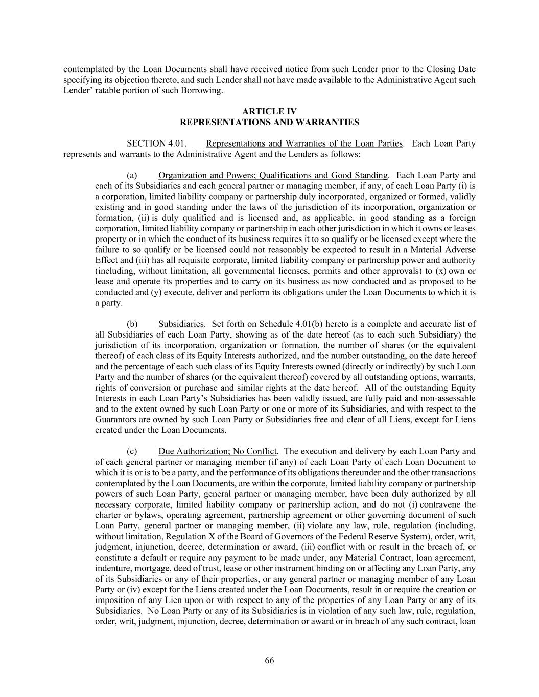 66 contemplated by the Loan Documents shall have received notice from such Lender prior to the Closing Date specifying its objection thereto, and such Lender shall not have made available to the Administrative Agent such Lender’ ratable portion of such Borrowing. ARTICLE IV REPRESENTATIONS AND WARRANTIES SECTION 4.01. Representations and Warranties of the Loan Parties. Each Loan Party represents and warrants to the Administrative Agent and the Lenders as follows: (a) Organization and Powers; Qualifications and Good Standing. Each Loan Party and each of its Subsidiaries and each general partner or managing member, if any, of each Loan Party (i) is a corporation, limited liability company or partnership duly incorporated, organized or formed, validly existing and in good standing under the laws of the jurisdiction of its incorporation, organization or formation, (ii) is duly qualified and is licensed and, as applicable, in good standing as a foreign corporation, limited liability company or partnership in each other jurisdiction in which it owns or leases property or in which the conduct of its business requires it to so qualify or be licensed except where the failure to so qualify or be licensed could not reasonably be expected to result in a Material Adverse Effect and (iii) has all requisite corporate, limited liability company or partnership power and authority (including, without limitation, all governmental licenses, permits and other approvals) to (x) own or lease and operate its properties and to carry on its business as now conducted and as proposed to be conducted and (y) execute, deliver and perform its obligations under the Loan Documents to which it is a party. (b) Subsidiaries. Set forth on Schedule 4.01(b) hereto is a complete and accurate list of all Subsidiaries of each Loan Party, showing as of the date hereof (as to each such Subsidiary) the jurisdiction of its incorporation, organization or formation, the number of shares (or the equivalent thereof) of each class of its Equity Interests authorized, and the number outstanding, on the date hereof and the percentage of each such class of its Equity Interests owned (directly or indirectly) by such Loan Party and the number of shares (or the equivalent thereof) covered by all outstanding options, warrants, rights of conversion or purchase and similar rights at the date hereof. All of the outstanding Equity Interests in each Loan Party’s Subsidiaries has been validly issued, are fully paid and non-assessable and to the extent owned by such Loan Party or one or more of its Subsidiaries, and with respect to the Guarantors are owned by such Loan Party or Subsidiaries free and clear of all Liens, except for Liens created under the Loan Documents. (c) Due Authorization; No Conflict. The execution and delivery by each Loan Party and of each general partner or managing member (if any) of each Loan Party of each Loan Document to which it is or is to be a party, and the performance of its obligations thereunder and the other transactions contemplated by the Loan Documents, are within the corporate, limited liability company or partnership powers of such Loan Party, general partner or managing member, have been duly authorized by all necessary corporate, limited liability company or partnership action, and do not (i) contravene the charter or bylaws, operating agreement, partnership agreement or other governing document of such Loan Party, general partner or managing member, (ii) violate any law, rule, regulation (including, without limitation, Regulation X of the Board of Governors of the Federal Reserve System), order, writ, judgment, injunction, decree, determination or award, (iii) conflict with or result in the breach of, or constitute a default or require any payment to be made under, any Material Contract, loan agreement, indenture, mortgage, deed of trust, lease or other instrument binding on or affecting any Loan Party, any of its Subsidiaries or any of their properties, or any general partner or managing member of any Loan Party or (iv) except for the Liens created under the Loan Documents, result in or require the creation or imposition of any Lien upon or with respect to any of the properties of any Loan Party or any of its Subsidiaries. No Loan Party or any of its Subsidiaries is in violation of any such law, rule, regulation, order, writ, judgment, injunction, decree, determination or award or in breach of any such contract, loan