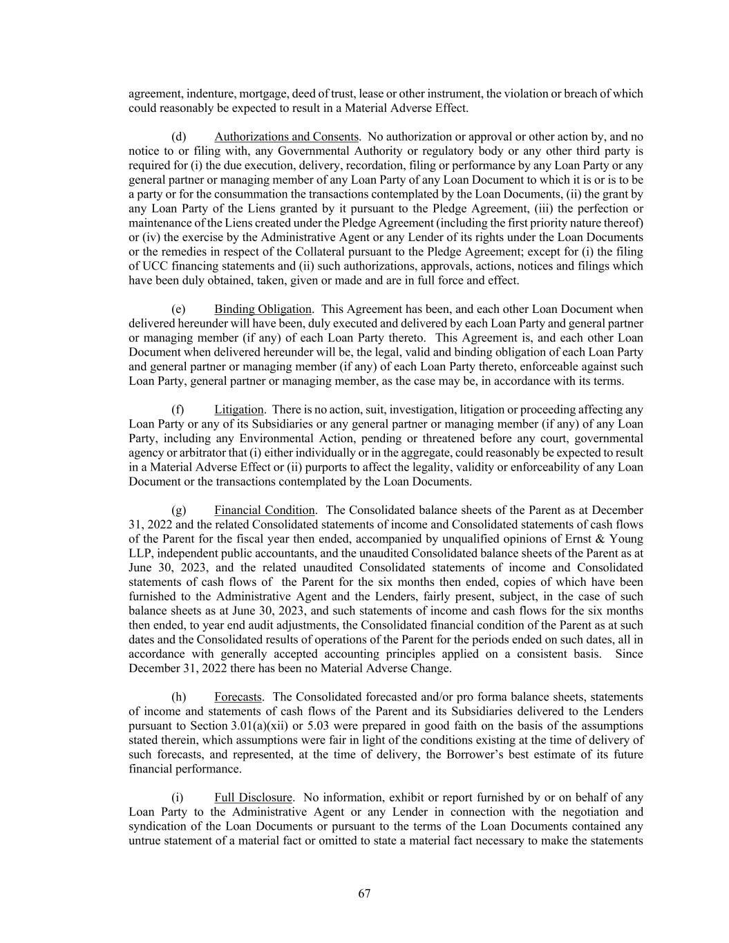 67 agreement, indenture, mortgage, deed of trust, lease or other instrument, the violation or breach of which could reasonably be expected to result in a Material Adverse Effect. (d) Authorizations and Consents. No authorization or approval or other action by, and no notice to or filing with, any Governmental Authority or regulatory body or any other third party is required for (i) the due execution, delivery, recordation, filing or performance by any Loan Party or any general partner or managing member of any Loan Party of any Loan Document to which it is or is to be a party or for the consummation the transactions contemplated by the Loan Documents, (ii) the grant by any Loan Party of the Liens granted by it pursuant to the Pledge Agreement, (iii) the perfection or maintenance of the Liens created under the Pledge Agreement (including the first priority nature thereof) or (iv) the exercise by the Administrative Agent or any Lender of its rights under the Loan Documents or the remedies in respect of the Collateral pursuant to the Pledge Agreement; except for (i) the filing of UCC financing statements and (ii) such authorizations, approvals, actions, notices and filings which have been duly obtained, taken, given or made and are in full force and effect. (e) Binding Obligation. This Agreement has been, and each other Loan Document when delivered hereunder will have been, duly executed and delivered by each Loan Party and general partner or managing member (if any) of each Loan Party thereto. This Agreement is, and each other Loan Document when delivered hereunder will be, the legal, valid and binding obligation of each Loan Party and general partner or managing member (if any) of each Loan Party thereto, enforceable against such Loan Party, general partner or managing member, as the case may be, in accordance with its terms. (f) Litigation. There is no action, suit, investigation, litigation or proceeding affecting any Loan Party or any of its Subsidiaries or any general partner or managing member (if any) of any Loan Party, including any Environmental Action, pending or threatened before any court, governmental agency or arbitrator that (i) either individually or in the aggregate, could reasonably be expected to result in a Material Adverse Effect or (ii) purports to affect the legality, validity or enforceability of any Loan Document or the transactions contemplated by the Loan Documents. (g) Financial Condition. The Consolidated balance sheets of the Parent as at December 31, 2022 and the related Consolidated statements of income and Consolidated statements of cash flows of the Parent for the fiscal year then ended, accompanied by unqualified opinions of Ernst & Young LLP, independent public accountants, and the unaudited Consolidated balance sheets of the Parent as at June 30, 2023, and the related unaudited Consolidated statements of income and Consolidated statements of cash flows of the Parent for the six months then ended, copies of which have been furnished to the Administrative Agent and the Lenders, fairly present, subject, in the case of such balance sheets as at June 30, 2023, and such statements of income and cash flows for the six months then ended, to year end audit adjustments, the Consolidated financial condition of the Parent as at such dates and the Consolidated results of operations of the Parent for the periods ended on such dates, all in accordance with generally accepted accounting principles applied on a consistent basis. Since December 31, 2022 there has been no Material Adverse Change. (h) Forecasts. The Consolidated forecasted and/or pro forma balance sheets, statements of income and statements of cash flows of the Parent and its Subsidiaries delivered to the Lenders pursuant to Section 3.01(a)(xii) or 5.03 were prepared in good faith on the basis of the assumptions stated therein, which assumptions were fair in light of the conditions existing at the time of delivery of such forecasts, and represented, at the time of delivery, the Borrower’s best estimate of its future financial performance. (i) Full Disclosure. No information, exhibit or report furnished by or on behalf of any Loan Party to the Administrative Agent or any Lender in connection with the negotiation and syndication of the Loan Documents or pursuant to the terms of the Loan Documents contained any untrue statement of a material fact or omitted to state a material fact necessary to make the statements