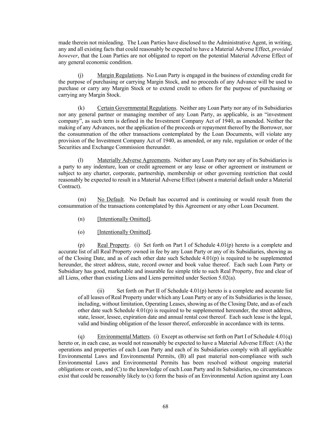 68 made therein not misleading. The Loan Parties have disclosed to the Administrative Agent, in writing, any and all existing facts that could reasonably be expected to have a Material Adverse Effect, provided however, that the Loan Parties are not obligated to report on the potential Material Adverse Effect of any general economic condition. (j) Margin Regulations. No Loan Party is engaged in the business of extending credit for the purpose of purchasing or carrying Margin Stock, and no proceeds of any Advance will be used to purchase or carry any Margin Stock or to extend credit to others for the purpose of purchasing or carrying any Margin Stock. (k) Certain Governmental Regulations. Neither any Loan Party nor any of its Subsidiaries nor any general partner or managing member of any Loan Party, as applicable, is an “investment company”, as such term is defined in the Investment Company Act of 1940, as amended. Neither the making of any Advances, nor the application of the proceeds or repayment thereof by the Borrower, nor the consummation of the other transactions contemplated by the Loan Documents, will violate any provision of the Investment Company Act of 1940, as amended, or any rule, regulation or order of the Securities and Exchange Commission thereunder. (l) Materially Adverse Agreements. Neither any Loan Party nor any of its Subsidiaries is a party to any indenture, loan or credit agreement or any lease or other agreement or instrument or subject to any charter, corporate, partnership, membership or other governing restriction that could reasonably be expected to result in a Material Adverse Effect (absent a material default under a Material Contract). (m) No Default. No Default has occurred and is continuing or would result from the consummation of the transactions contemplated by this Agreement or any other Loan Document. (n) [Intentionally Omitted]. (o) [Intentionally Omitted]. (p) Real Property. (i) Set forth on Part I of Schedule 4.01(p) hereto is a complete and accurate list of all Real Property owned in fee by any Loan Party or any of its Subsidiaries, showing as of the Closing Date, and as of each other date such Schedule 4.01(p) is required to be supplemented hereunder, the street address, state, record owner and book value thereof. Each such Loan Party or Subsidiary has good, marketable and insurable fee simple title to such Real Property, free and clear of all Liens, other than existing Liens and Liens permitted under Section 5.02(a). (ii) Set forth on Part II of Schedule 4.01(p) hereto is a complete and accurate list of all leases of Real Property under which any Loan Party or any of its Subsidiaries is the lessee, including, without limitation, Operating Leases, showing as of the Closing Date, and as of each other date such Schedule 4.01(p) is required to be supplemented hereunder, the street address, state, lessor, lessee, expiration date and annual rental cost thereof. Each such lease is the legal, valid and binding obligation of the lessor thereof, enforceable in accordance with its terms. (q) Environmental Matters. (i) Except as otherwise set forth on Part I of Schedule 4.01(q) hereto or, in each case, as would not reasonably be expected to have a Material Adverse Effect: (A) the operations and properties of each Loan Party and each of its Subsidiaries comply with all applicable Environmental Laws and Environmental Permits, (B) all past material non-compliance with such Environmental Laws and Environmental Permits has been resolved without ongoing material obligations or costs, and (C) to the knowledge of each Loan Party and its Subsidiaries, no circumstances exist that could be reasonably likely to (x) form the basis of an Environmental Action against any Loan