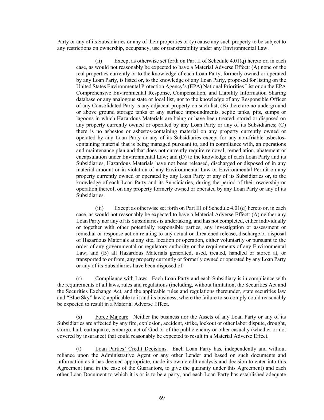 69 Party or any of its Subsidiaries or any of their properties or (y) cause any such property to be subject to any restrictions on ownership, occupancy, use or transferability under any Environmental Law. (ii) Except as otherwise set forth on Part II of Schedule 4.01(q) hereto or, in each case, as would not reasonably be expected to have a Material Adverse Effect: (A) none of the real properties currently or to the knowledge of each Loan Party, formerly owned or operated by any Loan Party, is listed or, to the knowledge of any Loan Party, proposed for listing on the United States Environmental Protection Agency’s (EPA) National Priorities List or on the EPA Comprehensive Environmental Response, Compensation, and Liability Information Sharing database or any analogous state or local list, nor to the knowledge of any Responsible Officer of any Consolidated Party is any adjacent property on such list; (B) there are no underground or above ground storage tanks or any surface impoundments, septic tanks, pits, sumps or lagoons in which Hazardous Materials are being or have been treated, stored or disposed on any property currently owned or operated by any Loan Party or any of its Subsidiaries; (C) there is no asbestos or asbestos-containing material on any property currently owned or operated by any Loan Party or any of its Subsidiaries except for any non-friable asbestos- containing material that is being managed pursuant to, and in compliance with, an operations and maintenance plan and that does not currently require removal, remediation, abatement or encapsulation under Environmental Law; and (D) to the knowledge of each Loan Party and its Subsidiaries, Hazardous Materials have not been released, discharged or disposed of in any material amount or in violation of any Environmental Law or Environmental Permit on any property currently owned or operated by any Loan Party or any of its Subsidiaries or, to the knowledge of each Loan Party and its Subsidiaries, during the period of their ownership or operation thereof, on any property formerly owned or operated by any Loan Party or any of its Subsidiaries. (iii) Except as otherwise set forth on Part III of Schedule 4.01(q) hereto or, in each case, as would not reasonably be expected to have a Material Adverse Effect: (A) neither any Loan Party nor any of its Subsidiaries is undertaking, and has not completed, either individually or together with other potentially responsible parties, any investigation or assessment or remedial or response action relating to any actual or threatened release, discharge or disposal of Hazardous Materials at any site, location or operation, either voluntarily or pursuant to the order of any governmental or regulatory authority or the requirements of any Environmental Law; and (B) all Hazardous Materials generated, used, treated, handled or stored at, or transported to or from, any property currently or formerly owned or operated by any Loan Party or any of its Subsidiaries have been disposed of. (r) Compliance with Laws. Each Loan Party and each Subsidiary is in compliance with the requirements of all laws, rules and regulations (including, without limitation, the Securities Act and the Securities Exchange Act, and the applicable rules and regulations thereunder, state securities law and “Blue Sky” laws) applicable to it and its business, where the failure to so comply could reasonably be expected to result in a Material Adverse Effect. (s) Force Majeure. Neither the business nor the Assets of any Loan Party or any of its Subsidiaries are affected by any fire, explosion, accident, strike, lockout or other labor dispute, drought, storm, hail, earthquake, embargo, act of God or of the public enemy or other casualty (whether or not covered by insurance) that could reasonably be expected to result in a Material Adverse Effect. (t) Loan Parties’ Credit Decisions. Each Loan Party has, independently and without reliance upon the Administrative Agent or any other Lender and based on such documents and information as it has deemed appropriate, made its own credit analysis and decision to enter into this Agreement (and in the case of the Guarantors, to give the guaranty under this Agreement) and each other Loan Document to which it is or is to be a party, and each Loan Party has established adequate