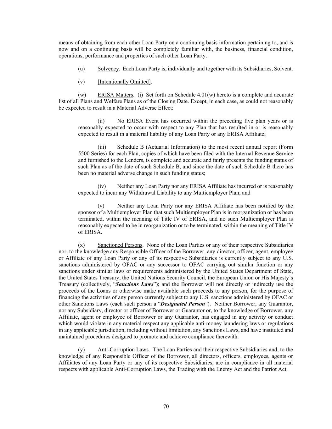 70 means of obtaining from each other Loan Party on a continuing basis information pertaining to, and is now and on a continuing basis will be completely familiar with, the business, financial condition, operations, performance and properties of such other Loan Party. (u) Solvency. Each Loan Party is, individually and together with its Subsidiaries, Solvent. (v) [Intentionally Omitted]. (w) ERISA Matters. (i) Set forth on Schedule 4.01(w) hereto is a complete and accurate list of all Plans and Welfare Plans as of the Closing Date. Except, in each case, as could not reasonably be expected to result in a Material Adverse Effect: (ii) No ERISA Event has occurred within the preceding five plan years or is reasonably expected to occur with respect to any Plan that has resulted in or is reasonably expected to result in a material liability of any Loan Party or any ERISA Affiliate; (iii) Schedule B (Actuarial Information) to the most recent annual report (Form 5500 Series) for each Plan, copies of which have been filed with the Internal Revenue Service and furnished to the Lenders, is complete and accurate and fairly presents the funding status of such Plan as of the date of such Schedule B, and since the date of such Schedule B there has been no material adverse change in such funding status; (iv) Neither any Loan Party nor any ERISA Affiliate has incurred or is reasonably expected to incur any Withdrawal Liability to any Multiemployer Plan; and (v) Neither any Loan Party nor any ERISA Affiliate has been notified by the sponsor of a Multiemployer Plan that such Multiemployer Plan is in reorganization or has been terminated, within the meaning of Title IV of ERISA, and no such Multiemployer Plan is reasonably expected to be in reorganization or to be terminated, within the meaning of Title IV of ERISA. (x) Sanctioned Persons. None of the Loan Parties or any of their respective Subsidiaries nor, to the knowledge any Responsible Officer of the Borrower, any director, officer, agent, employee or Affiliate of any Loan Party or any of its respective Subsidiaries is currently subject to any U.S. sanctions administered by OFAC or any successor to OFAC carrying out similar function or any sanctions under similar laws or requirements administered by the United States Department of State, the United States Treasury, the United Nations Security Council, the European Union or His Majesty’s Treasury (collectively, “Sanctions Laws”); and the Borrower will not directly or indirectly use the proceeds of the Loans or otherwise make available such proceeds to any person, for the purpose of financing the activities of any person currently subject to any U.S. sanctions administered by OFAC or other Sanctions Laws (each such person a “Designated Person”). Neither Borrower, any Guarantor, nor any Subsidiary, director or officer of Borrower or Guarantor or, to the knowledge of Borrower, any Affiliate, agent or employee of Borrower or any Guarantor, has engaged in any activity or conduct which would violate in any material respect any applicable anti-money laundering laws or regulations in any applicable jurisdiction, including without limitation, any Sanctions Laws, and have instituted and maintained procedures designed to promote and achieve compliance therewith. (y) Anti-Corruption Laws. The Loan Parties and their respective Subsidiaries and, to the knowledge of any Responsible Officer of the Borrower, all directors, officers, employees, agents or Affiliates of any Loan Party or any of its respective Subsidiaries, are in compliance in all material respects with applicable Anti-Corruption Laws, the Trading with the Enemy Act and the Patriot Act.