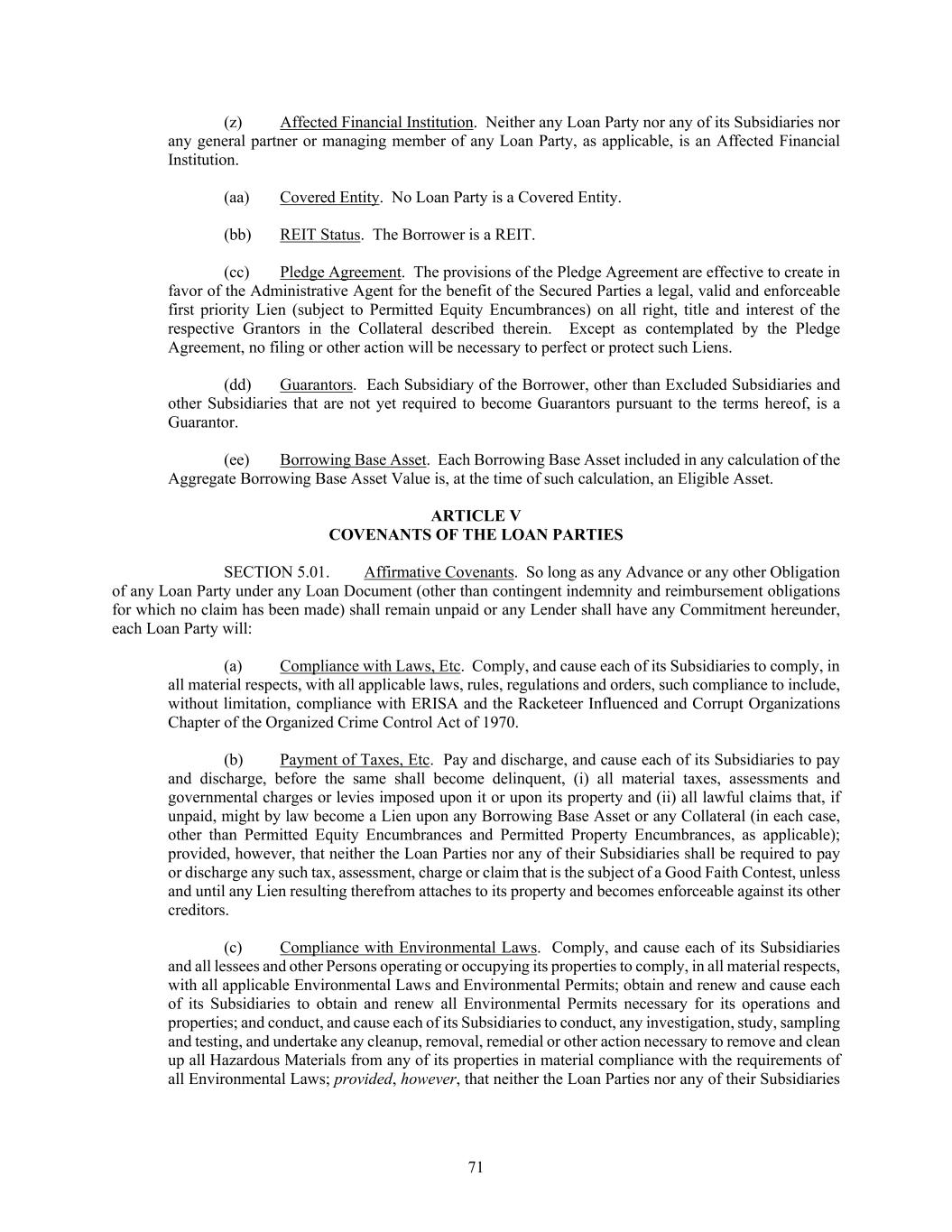 71 (z) Affected Financial Institution. Neither any Loan Party nor any of its Subsidiaries nor any general partner or managing member of any Loan Party, as applicable, is an Affected Financial Institution. (aa) Covered Entity. No Loan Party is a Covered Entity. (bb) REIT Status. The Borrower is a REIT. (cc) Pledge Agreement. The provisions of the Pledge Agreement are effective to create in favor of the Administrative Agent for the benefit of the Secured Parties a legal, valid and enforceable first priority Lien (subject to Permitted Equity Encumbrances) on all right, title and interest of the respective Grantors in the Collateral described therein. Except as contemplated by the Pledge Agreement, no filing or other action will be necessary to perfect or protect such Liens. (dd) Guarantors. Each Subsidiary of the Borrower, other than Excluded Subsidiaries and other Subsidiaries that are not yet required to become Guarantors pursuant to the terms hereof, is a Guarantor. (ee) Borrowing Base Asset. Each Borrowing Base Asset included in any calculation of the Aggregate Borrowing Base Asset Value is, at the time of such calculation, an Eligible Asset. ARTICLE V COVENANTS OF THE LOAN PARTIES SECTION 5.01. Affirmative Covenants. So long as any Advance or any other Obligation of any Loan Party under any Loan Document (other than contingent indemnity and reimbursement obligations for which no claim has been made) shall remain unpaid or any Lender shall have any Commitment hereunder, each Loan Party will: (a) Compliance with Laws, Etc. Comply, and cause each of its Subsidiaries to comply, in all material respects, with all applicable laws, rules, regulations and orders, such compliance to include, without limitation, compliance with ERISA and the Racketeer Influenced and Corrupt Organizations Chapter of the Organized Crime Control Act of 1970. (b) Payment of Taxes, Etc. Pay and discharge, and cause each of its Subsidiaries to pay and discharge, before the same shall become delinquent, (i) all material taxes, assessments and governmental charges or levies imposed upon it or upon its property and (ii) all lawful claims that, if unpaid, might by law become a Lien upon any Borrowing Base Asset or any Collateral (in each case, other than Permitted Equity Encumbrances and Permitted Property Encumbrances, as applicable); provided, however, that neither the Loan Parties nor any of their Subsidiaries shall be required to pay or discharge any such tax, assessment, charge or claim that is the subject of a Good Faith Contest, unless and until any Lien resulting therefrom attaches to its property and becomes enforceable against its other creditors. (c) Compliance with Environmental Laws. Comply, and cause each of its Subsidiaries and all lessees and other Persons operating or occupying its properties to comply, in all material respects, with all applicable Environmental Laws and Environmental Permits; obtain and renew and cause each of its Subsidiaries to obtain and renew all Environmental Permits necessary for its operations and properties; and conduct, and cause each of its Subsidiaries to conduct, any investigation, study, sampling and testing, and undertake any cleanup, removal, remedial or other action necessary to remove and clean up all Hazardous Materials from any of its properties in material compliance with the requirements of all Environmental Laws; provided, however, that neither the Loan Parties nor any of their Subsidiaries