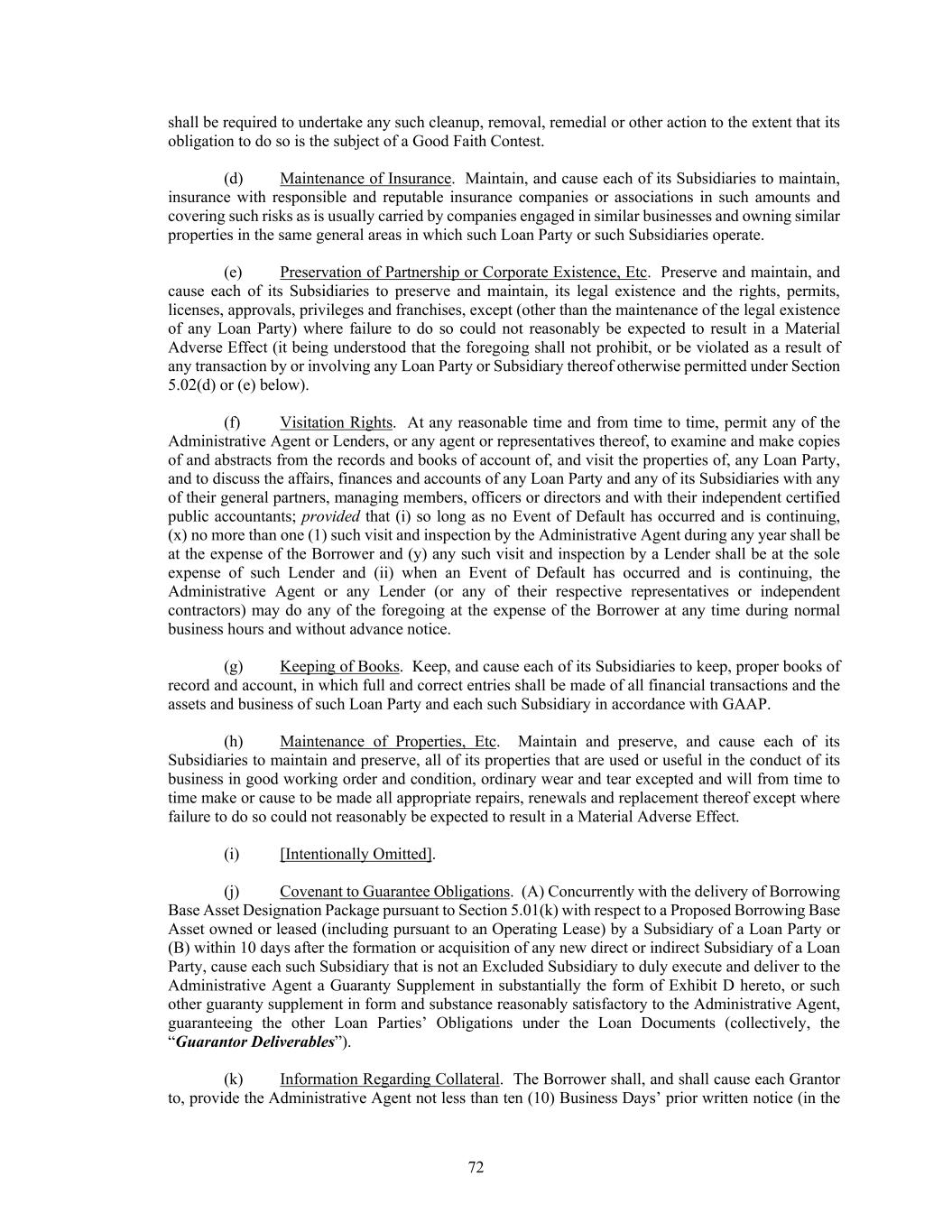 72 shall be required to undertake any such cleanup, removal, remedial or other action to the extent that its obligation to do so is the subject of a Good Faith Contest. (d) Maintenance of Insurance. Maintain, and cause each of its Subsidiaries to maintain, insurance with responsible and reputable insurance companies or associations in such amounts and covering such risks as is usually carried by companies engaged in similar businesses and owning similar properties in the same general areas in which such Loan Party or such Subsidiaries operate. (e) Preservation of Partnership or Corporate Existence, Etc. Preserve and maintain, and cause each of its Subsidiaries to preserve and maintain, its legal existence and the rights, permits, licenses, approvals, privileges and franchises, except (other than the maintenance of the legal existence of any Loan Party) where failure to do so could not reasonably be expected to result in a Material Adverse Effect (it being understood that the foregoing shall not prohibit, or be violated as a result of any transaction by or involving any Loan Party or Subsidiary thereof otherwise permitted under Section 5.02(d) or (e) below). (f) Visitation Rights. At any reasonable time and from time to time, permit any of the Administrative Agent or Lenders, or any agent or representatives thereof, to examine and make copies of and abstracts from the records and books of account of, and visit the properties of, any Loan Party, and to discuss the affairs, finances and accounts of any Loan Party and any of its Subsidiaries with any of their general partners, managing members, officers or directors and with their independent certified public accountants; provided that (i) so long as no Event of Default has occurred and is continuing, (x) no more than one (1) such visit and inspection by the Administrative Agent during any year shall be at the expense of the Borrower and (y) any such visit and inspection by a Lender shall be at the sole expense of such Lender and (ii) when an Event of Default has occurred and is continuing, the Administrative Agent or any Lender (or any of their respective representatives or independent contractors) may do any of the foregoing at the expense of the Borrower at any time during normal business hours and without advance notice. (g) Keeping of Books. Keep, and cause each of its Subsidiaries to keep, proper books of record and account, in which full and correct entries shall be made of all financial transactions and the assets and business of such Loan Party and each such Subsidiary in accordance with GAAP. (h) Maintenance of Properties, Etc. Maintain and preserve, and cause each of its Subsidiaries to maintain and preserve, all of its properties that are used or useful in the conduct of its business in good working order and condition, ordinary wear and tear excepted and will from time to time make or cause to be made all appropriate repairs, renewals and replacement thereof except where failure to do so could not reasonably be expected to result in a Material Adverse Effect. (i) [Intentionally Omitted]. (j) Covenant to Guarantee Obligations. (A) Concurrently with the delivery of Borrowing Base Asset Designation Package pursuant to Section 5.01(k) with respect to a Proposed Borrowing Base Asset owned or leased (including pursuant to an Operating Lease) by a Subsidiary of a Loan Party or (B) within 10 days after the formation or acquisition of any new direct or indirect Subsidiary of a Loan Party, cause each such Subsidiary that is not an Excluded Subsidiary to duly execute and deliver to the Administrative Agent a Guaranty Supplement in substantially the form of Exhibit D hereto, or such other guaranty supplement in form and substance reasonably satisfactory to the Administrative Agent, guaranteeing the other Loan Parties’ Obligations under the Loan Documents (collectively, the “Guarantor Deliverables”). (k) Information Regarding Collateral. The Borrower shall, and shall cause each Grantor to, provide the Administrative Agent not less than ten (10) Business Days’ prior written notice (in the