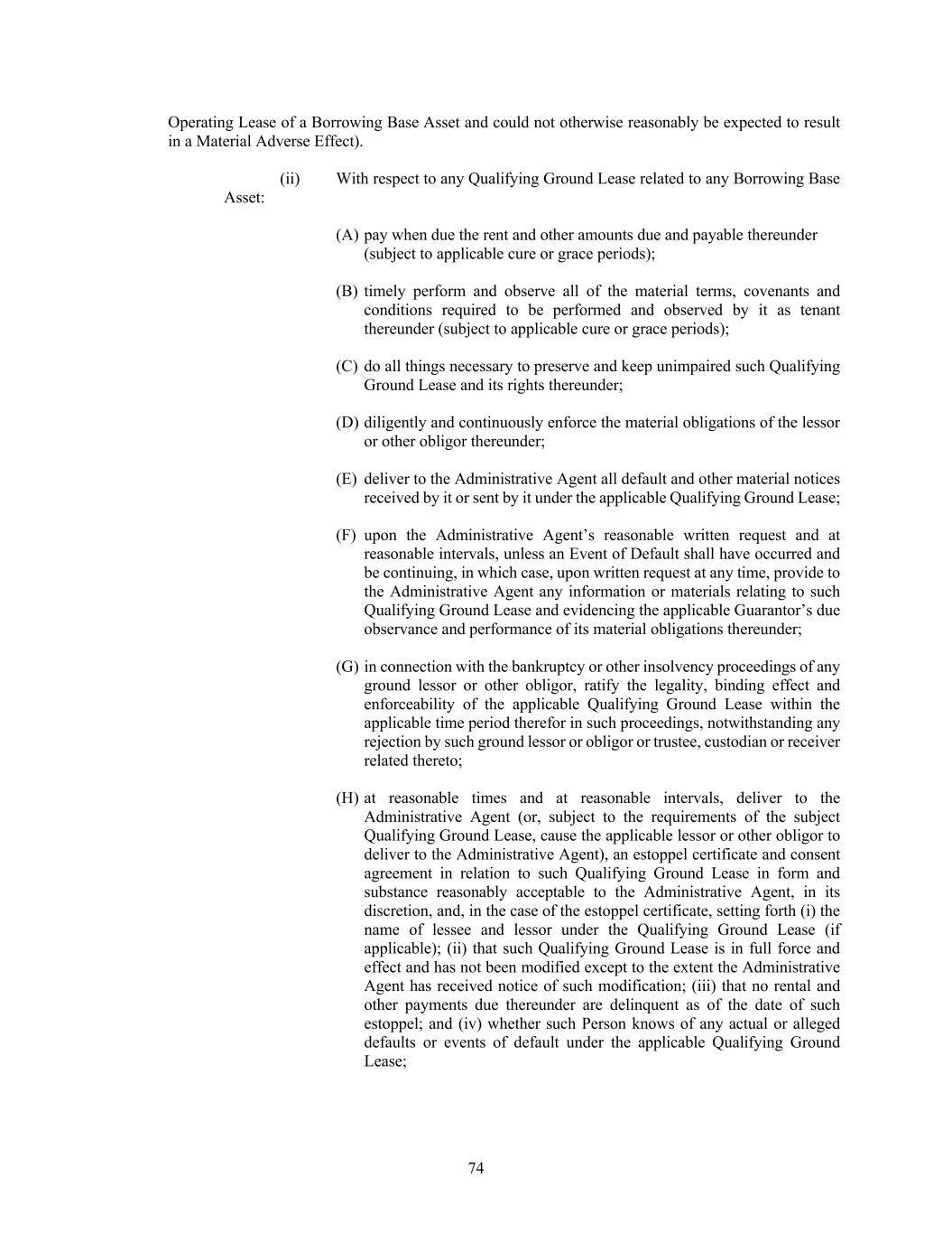 74 Operating Lease of a Borrowing Base Asset and could not otherwise reasonably be expected to result in a Material Adverse Effect). (ii) With respect to any Qualifying Ground Lease related to any Borrowing Base Asset: (A) pay when due the rent and other amounts due and payable thereunder (subject to applicable cure or grace periods); (B) timely perform and observe all of the material terms, covenants and conditions required to be performed and observed by it as tenant thereunder (subject to applicable cure or grace periods); (C) do all things necessary to preserve and keep unimpaired such Qualifying Ground Lease and its rights thereunder; (D) diligently and continuously enforce the material obligations of the lessor or other obligor thereunder; (E) deliver to the Administrative Agent all default and other material notices received by it or sent by it under the applicable Qualifying Ground Lease; (F) upon the Administrative Agent’s reasonable written request and at reasonable intervals, unless an Event of Default shall have occurred and be continuing, in which case, upon written request at any time, provide to the Administrative Agent any information or materials relating to such Qualifying Ground Lease and evidencing the applicable Guarantor’s due observance and performance of its material obligations thereunder; (G) in connection with the bankruptcy or other insolvency proceedings of any ground lessor or other obligor, ratify the legality, binding effect and enforceability of the applicable Qualifying Ground Lease within the applicable time period therefor in such proceedings, notwithstanding any rejection by such ground lessor or obligor or trustee, custodian or receiver related thereto; (H) at reasonable times and at reasonable intervals, deliver to the Administrative Agent (or, subject to the requirements of the subject Qualifying Ground Lease, cause the applicable lessor or other obligor to deliver to the Administrative Agent), an estoppel certificate and consent agreement in relation to such Qualifying Ground Lease in form and substance reasonably acceptable to the Administrative Agent, in its discretion, and, in the case of the estoppel certificate, setting forth (i) the name of lessee and lessor under the Qualifying Ground Lease (if applicable); (ii) that such Qualifying Ground Lease is in full force and effect and has not been modified except to the extent the Administrative Agent has received notice of such modification; (iii) that no rental and other payments due thereunder are delinquent as of the date of such estoppel; and (iv) whether such Person knows of any actual or alleged defaults or events of default under the applicable Qualifying Ground Lease;