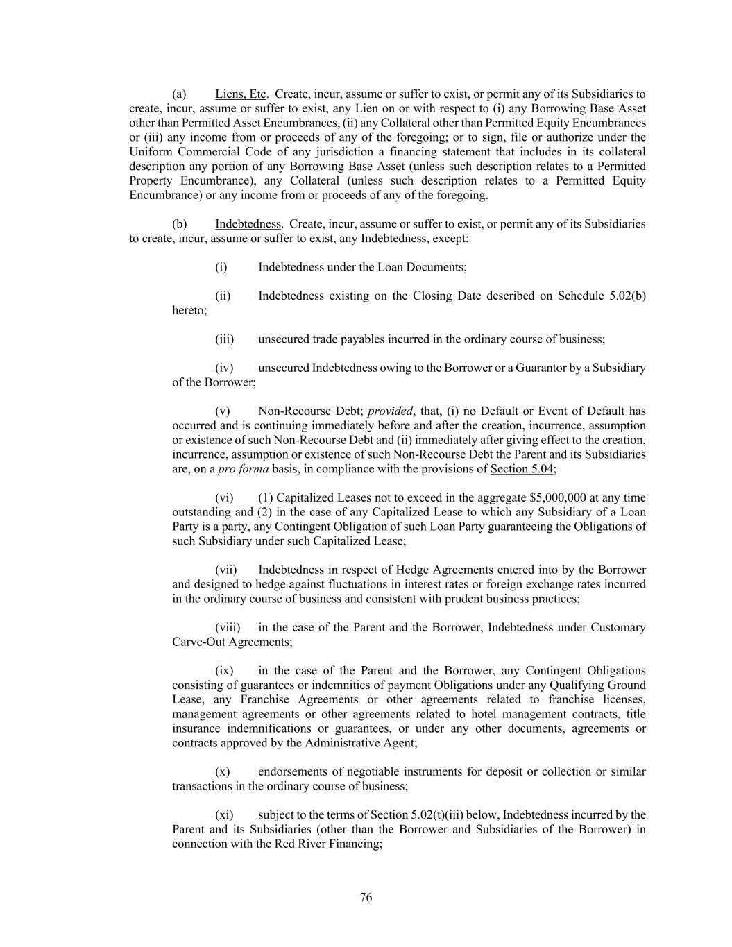 76 (a) Liens, Etc. Create, incur, assume or suffer to exist, or permit any of its Subsidiaries to create, incur, assume or suffer to exist, any Lien on or with respect to (i) any Borrowing Base Asset other than Permitted Asset Encumbrances, (ii) any Collateral other than Permitted Equity Encumbrances or (iii) any income from or proceeds of any of the foregoing; or to sign, file or authorize under the Uniform Commercial Code of any jurisdiction a financing statement that includes in its collateral description any portion of any Borrowing Base Asset (unless such description relates to a Permitted Property Encumbrance), any Collateral (unless such description relates to a Permitted Equity Encumbrance) or any income from or proceeds of any of the foregoing. (b) Indebtedness. Create, incur, assume or suffer to exist, or permit any of its Subsidiaries to create, incur, assume or suffer to exist, any Indebtedness, except: (i) Indebtedness under the Loan Documents; (ii) Indebtedness existing on the Closing Date described on Schedule 5.02(b) hereto; (iii) unsecured trade payables incurred in the ordinary course of business; (iv) unsecured Indebtedness owing to the Borrower or a Guarantor by a Subsidiary of the Borrower; (v) Non-Recourse Debt; provided, that, (i) no Default or Event of Default has occurred and is continuing immediately before and after the creation, incurrence, assumption or existence of such Non-Recourse Debt and (ii) immediately after giving effect to the creation, incurrence, assumption or existence of such Non-Recourse Debt the Parent and its Subsidiaries are, on a pro forma basis, in compliance with the provisions of Section 5.04; (vi) (1) Capitalized Leases not to exceed in the aggregate $5,000,000 at any time outstanding and (2) in the case of any Capitalized Lease to which any Subsidiary of a Loan Party is a party, any Contingent Obligation of such Loan Party guaranteeing the Obligations of such Subsidiary under such Capitalized Lease; (vii) Indebtedness in respect of Hedge Agreements entered into by the Borrower and designed to hedge against fluctuations in interest rates or foreign exchange rates incurred in the ordinary course of business and consistent with prudent business practices; (viii) in the case of the Parent and the Borrower, Indebtedness under Customary Carve-Out Agreements; (ix) in the case of the Parent and the Borrower, any Contingent Obligations consisting of guarantees or indemnities of payment Obligations under any Qualifying Ground Lease, any Franchise Agreements or other agreements related to franchise licenses, management agreements or other agreements related to hotel management contracts, title insurance indemnifications or guarantees, or under any other documents, agreements or contracts approved by the Administrative Agent; (x) endorsements of negotiable instruments for deposit or collection or similar transactions in the ordinary course of business; (xi) subject to the terms of Section 5.02(t)(iii) below, Indebtedness incurred by the Parent and its Subsidiaries (other than the Borrower and Subsidiaries of the Borrower) in connection with the Red River Financing;