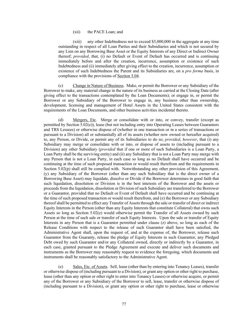 77 (xii) the PACE Loan; and (xiii) any other Indebtedness not to exceed $5,000,000 in the aggregate at any time outstanding in respect of all Loan Parties and their Subsidiaries and which is not secured by any Lien on any Borrowing Base Asset or the Equity Interests of any Direct or Indirect Owner thereof; provided, that, (i) no Default or Event of Default has occurred and is continuing immediately before and after the creation, incurrence, assumption or existence of such Indebtedness and (ii) immediately after giving effect to the creation, incurrence, assumption or existence of such Indebtedness the Parent and its Subsidiaries are, on a pro forma basis, in compliance with the provisions of Section 5.04. (c) Change in Nature of Business. Make, or permit the Borrower or any Subsidiary of the Borrower to make, any material change in the nature of its business as carried at the Closing Date (after giving effect to the transactions contemplated by the Loan Documents); or engage in, or permit the Borrower or any Subsidiary of the Borrower to engage in, any business other than ownership, development, licensing and management of Hotel Assets in the United States consistent with the requirements of the Loan Documents, and other business activities incidental thereto. (d) Mergers, Etc. Merge or consolidate with or into, or convey, transfer (except as permitted by Section 5.02(e)), lease (but not including entry into Operating Leases between Guarantors and TRS Lessees) or otherwise dispose of (whether in one transaction or in a series of transactions or pursuant to a Division) all or substantially all of its assets (whether now owned or hereafter acquired) to, any Person, or Divide, or permit any of its Subsidiaries to do so; provided, however, that (i) any Subsidiary may merge or consolidate with or into, or dispose of assets to (including pursuant to a Division) any other Subsidiary (provided that if one or more of such Subsidiaries is a Loan Party, a Loan Party shall be the surviving entity) and (ii) any Subsidiary that is not a Loan Party may merge with any Person that is not a Loan Party, in each case so long as no Default shall have occurred and be continuing at the time of such proposed transaction or would result therefrom and the requirements in Section 5.02(p) shall still be complied with. Notwithstanding any other provision of this Agreement, (y) any Subsidiary of the Borrower (other than any such Subsidiary that is the direct owner of a Borrowing Base Asset) may liquidate, dissolve or Divide if the Borrower determines in good faith that such liquidation, dissolution or Division is in the best interests of the Borrower and the assets or proceeds from the liquidation, dissolution or Division of such Subsidiary are transferred to the Borrower or a Guarantor, provided that no Default or Event of Default shall have occurred and be continuing at the time of such proposed transaction or would result therefrom, and (z) the Borrower or any Subsidiary thereof shall be permitted to effect any Transfer of Assets through the sale or transfer of direct or indirect Equity Interests in the Person (other than any Equity Interests that constitute Collateral) that owns such Assets so long as Section 5.02(e) would otherwise permit the Transfer of all Assets owned by such Person at the time of such sale or transfer of such Equity Interests. Upon the sale or transfer of Equity Interests in any Person that is a Guarantor permitted under clause (z) above, so long as each of the Release Conditions with respect to the release of such Guarantor shall have been satisfied, the Administrative Agent shall, upon the request of, and at the expense of, the Borrower, release such Guarantor from the Guaranty, release the pledge of Equity Interests in such Guarantor, any Pledged Debt owed by such Guarantor and/or any Collateral owned, directly or indirectly by a Guarantor, in each case, granted pursuant to the Pledge Agreement and execute and deliver such documents and instruments as the Borrower may reasonably request to evidence the foregoing, which documents and instruments shall be reasonably satisfactory to the Administrative Agent. (e) Sales, Etc. of Assets. Sell, lease (other than by entering into Tenancy Leases), transfer or otherwise dispose of (including pursuant to a Division), or grant any option or other right to purchase, lease (other than any option or other right to enter into Tenancy Leases) or otherwise acquire, or permit any of the Borrower or any Subsidiary of the Borrower to sell, lease, transfer or otherwise dispose of (including pursuant to a Division), or grant any option or other right to purchase, lease or otherwise