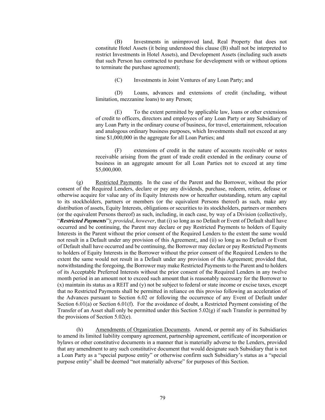 79 (B) Investments in unimproved land, Real Property that does not constitute Hotel Assets (it being understood this clause (B) shall not be interpreted to restrict Investments in Hotel Assets), and Development Assets (including such assets that such Person has contracted to purchase for development with or without options to terminate the purchase agreement); (C) Investments in Joint Ventures of any Loan Party; and (D) Loans, advances and extensions of credit (including, without limitation, mezzanine loans) to any Person; (E) To the extent permitted by applicable law, loans or other extensions of credit to officers, directors and employees of any Loan Party or any Subsidiary of any Loan Party in the ordinary course of business, for travel, entertainment, relocation and analogous ordinary business purposes, which Investments shall not exceed at any time $1,000,000 in the aggregate for all Loan Parties; and (F) extensions of credit in the nature of accounts receivable or notes receivable arising from the grant of trade credit extended in the ordinary course of business in an aggregate amount for all Loan Parties not to exceed at any time $5,000,000. (g) Restricted Payments. In the case of the Parent and the Borrower, without the prior consent of the Required Lenders, declare or pay any dividends, purchase, redeem, retire, defease or otherwise acquire for value any of its Equity Interests now or hereafter outstanding, return any capital to its stockholders, partners or members (or the equivalent Persons thereof) as such, make any distribution of assets, Equity Interests, obligations or securities to its stockholders, partners or members (or the equivalent Persons thereof) as such, including, in each case, by way of a Division (collectively, “Restricted Payments”); provided, however, that (i) so long as no Default or Event of Default shall have occurred and be continuing, the Parent may declare or pay Restricted Payments to holders of Equity Interests in the Parent without the prior consent of the Required Lenders to the extent the same would not result in a Default under any provision of this Agreement;, and (ii) so long as no Default or Event of Default shall have occurred and be continuing, the Borrower may declare or pay Restricted Payments to holders of Equity Interests in the Borrower without the prior consent of the Required Lenders to the extent the same would not result in a Default under any provision of this Agreement; provided that, notwithstanding the foregoing, the Borrower may make Restricted Payments to the Parent and to holders of its Acceptable Preferred Interests without the prior consent of the Required Lenders in any twelve month period in an amount not to exceed such amount that is reasonably necessary for the Borrower to (x) maintain its status as a REIT and (y) not be subject to federal or state income or excise taxes, except that no Restricted Payments shall be permitted in reliance on this proviso following an acceleration of the Advances pursuant to Section 6.02 or following the occurrence of any Event of Default under Section 6.01(a) or Section 6.01(f). For the avoidance of doubt, a Restricted Payment consisting of the Transfer of an Asset shall only be permitted under this Section 5.02(g) if such Transfer is permitted by the provisions of Section 5.02(e). (h) Amendments of Organization Documents. Amend, or permit any of its Subsidiaries to amend its limited liability company agreement, partnership agreement, certificate of incorporation or bylaws or other constitutive documents in a manner that is materially adverse to the Lenders, provided that any amendment to any such constitutive document that would designate such Subsidiary that is not a Loan Party as a “special purpose entity” or otherwise confirm such Subsidiary’s status as a “special purpose entity” shall be deemed “not materially adverse” for purposes of this Section.