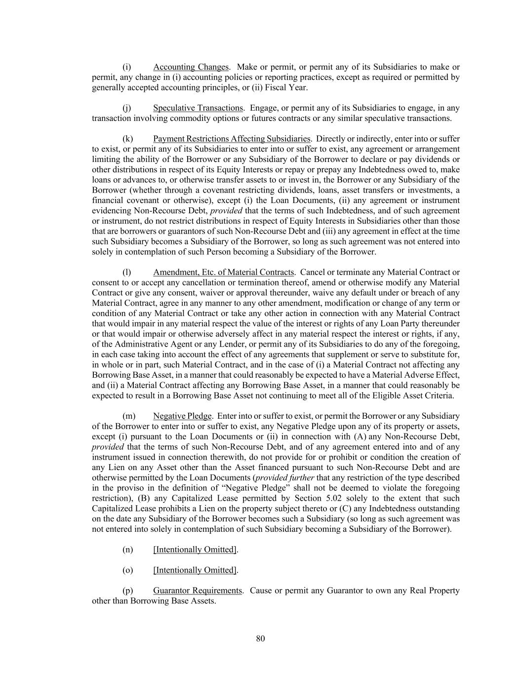 80 (i) Accounting Changes. Make or permit, or permit any of its Subsidiaries to make or permit, any change in (i) accounting policies or reporting practices, except as required or permitted by generally accepted accounting principles, or (ii) Fiscal Year. (j) Speculative Transactions. Engage, or permit any of its Subsidiaries to engage, in any transaction involving commodity options or futures contracts or any similar speculative transactions. (k) Payment Restrictions Affecting Subsidiaries. Directly or indirectly, enter into or suffer to exist, or permit any of its Subsidiaries to enter into or suffer to exist, any agreement or arrangement limiting the ability of the Borrower or any Subsidiary of the Borrower to declare or pay dividends or other distributions in respect of its Equity Interests or repay or prepay any Indebtedness owed to, make loans or advances to, or otherwise transfer assets to or invest in, the Borrower or any Subsidiary of the Borrower (whether through a covenant restricting dividends, loans, asset transfers or investments, a financial covenant or otherwise), except (i) the Loan Documents, (ii) any agreement or instrument evidencing Non-Recourse Debt, provided that the terms of such Indebtedness, and of such agreement or instrument, do not restrict distributions in respect of Equity Interests in Subsidiaries other than those that are borrowers or guarantors of such Non-Recourse Debt and (iii) any agreement in effect at the time such Subsidiary becomes a Subsidiary of the Borrower, so long as such agreement was not entered into solely in contemplation of such Person becoming a Subsidiary of the Borrower. (l) Amendment, Etc. of Material Contracts. Cancel or terminate any Material Contract or consent to or accept any cancellation or termination thereof, amend or otherwise modify any Material Contract or give any consent, waiver or approval thereunder, waive any default under or breach of any Material Contract, agree in any manner to any other amendment, modification or change of any term or condition of any Material Contract or take any other action in connection with any Material Contract that would impair in any material respect the value of the interest or rights of any Loan Party thereunder or that would impair or otherwise adversely affect in any material respect the interest or rights, if any, of the Administrative Agent or any Lender, or permit any of its Subsidiaries to do any of the foregoing, in each case taking into account the effect of any agreements that supplement or serve to substitute for, in whole or in part, such Material Contract, and in the case of (i) a Material Contract not affecting any Borrowing Base Asset, in a manner that could reasonably be expected to have a Material Adverse Effect, and (ii) a Material Contract affecting any Borrowing Base Asset, in a manner that could reasonably be expected to result in a Borrowing Base Asset not continuing to meet all of the Eligible Asset Criteria. (m) Negative Pledge. Enter into or suffer to exist, or permit the Borrower or any Subsidiary of the Borrower to enter into or suffer to exist, any Negative Pledge upon any of its property or assets, except (i) pursuant to the Loan Documents or (ii) in connection with (A) any Non-Recourse Debt, provided that the terms of such Non-Recourse Debt, and of any agreement entered into and of any instrument issued in connection therewith, do not provide for or prohibit or condition the creation of any Lien on any Asset other than the Asset financed pursuant to such Non-Recourse Debt and are otherwise permitted by the Loan Documents (provided further that any restriction of the type described in the proviso in the definition of “Negative Pledge” shall not be deemed to violate the foregoing restriction), (B) any Capitalized Lease permitted by Section 5.02 solely to the extent that such Capitalized Lease prohibits a Lien on the property subject thereto or (C) any Indebtedness outstanding on the date any Subsidiary of the Borrower becomes such a Subsidiary (so long as such agreement was not entered into solely in contemplation of such Subsidiary becoming a Subsidiary of the Borrower). (n) [Intentionally Omitted]. (o) [Intentionally Omitted]. (p) Guarantor Requirements. Cause or permit any Guarantor to own any Real Property other than Borrowing Base Assets.