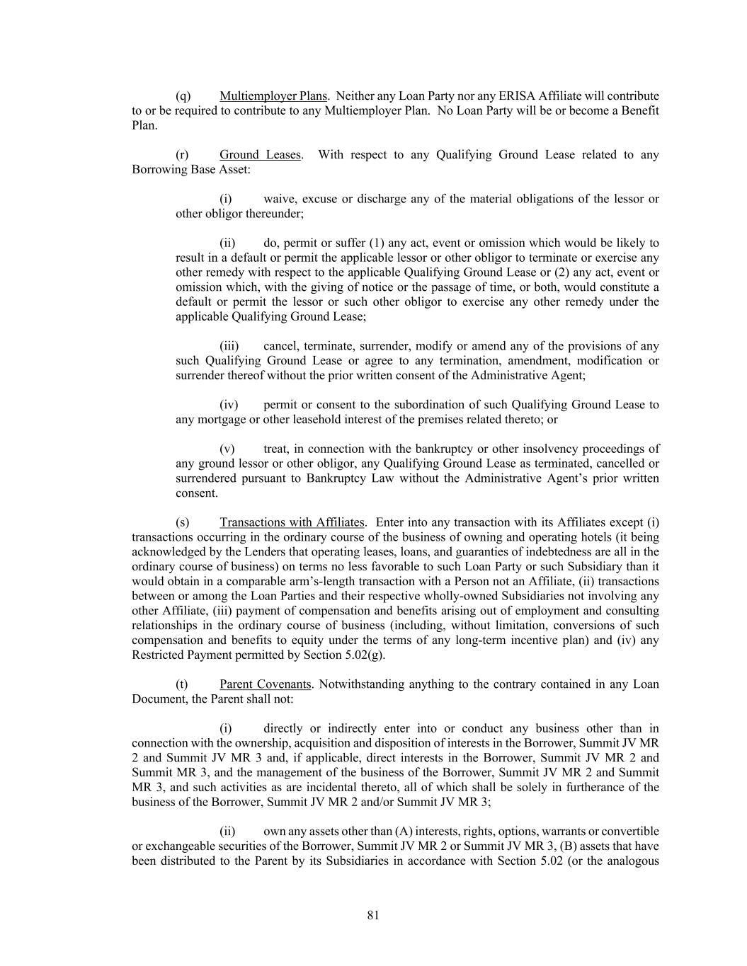 81 (q) Multiemployer Plans. Neither any Loan Party nor any ERISA Affiliate will contribute to or be required to contribute to any Multiemployer Plan. No Loan Party will be or become a Benefit Plan. (r) Ground Leases. With respect to any Qualifying Ground Lease related to any Borrowing Base Asset: (i) waive, excuse or discharge any of the material obligations of the lessor or other obligor thereunder; (ii) do, permit or suffer (1) any act, event or omission which would be likely to result in a default or permit the applicable lessor or other obligor to terminate or exercise any other remedy with respect to the applicable Qualifying Ground Lease or (2) any act, event or omission which, with the giving of notice or the passage of time, or both, would constitute a default or permit the lessor or such other obligor to exercise any other remedy under the applicable Qualifying Ground Lease; (iii) cancel, terminate, surrender, modify or amend any of the provisions of any such Qualifying Ground Lease or agree to any termination, amendment, modification or surrender thereof without the prior written consent of the Administrative Agent; (iv) permit or consent to the subordination of such Qualifying Ground Lease to any mortgage or other leasehold interest of the premises related thereto; or (v) treat, in connection with the bankruptcy or other insolvency proceedings of any ground lessor or other obligor, any Qualifying Ground Lease as terminated, cancelled or surrendered pursuant to Bankruptcy Law without the Administrative Agent’s prior written consent. (s) Transactions with Affiliates. Enter into any transaction with its Affiliates except (i) transactions occurring in the ordinary course of the business of owning and operating hotels (it being acknowledged by the Lenders that operating leases, loans, and guaranties of indebtedness are all in the ordinary course of business) on terms no less favorable to such Loan Party or such Subsidiary than it would obtain in a comparable arm’s-length transaction with a Person not an Affiliate, (ii) transactions between or among the Loan Parties and their respective wholly-owned Subsidiaries not involving any other Affiliate, (iii) payment of compensation and benefits arising out of employment and consulting relationships in the ordinary course of business (including, without limitation, conversions of such compensation and benefits to equity under the terms of any long-term incentive plan) and (iv) any Restricted Payment permitted by Section 5.02(g). (t) Parent Covenants. Notwithstanding anything to the contrary contained in any Loan Document, the Parent shall not: (i) directly or indirectly enter into or conduct any business other than in connection with the ownership, acquisition and disposition of interests in the Borrower, Summit JV MR 2 and Summit JV MR 3 and, if applicable, direct interests in the Borrower, Summit JV MR 2 and Summit MR 3, and the management of the business of the Borrower, Summit JV MR 2 and Summit MR 3, and such activities as are incidental thereto, all of which shall be solely in furtherance of the business of the Borrower, Summit JV MR 2 and/or Summit JV MR 3; (ii) own any assets other than (A) interests, rights, options, warrants or convertible or exchangeable securities of the Borrower, Summit JV MR 2 or Summit JV MR 3, (B) assets that have been distributed to the Parent by its Subsidiaries in accordance with Section 5.02 (or the analogous