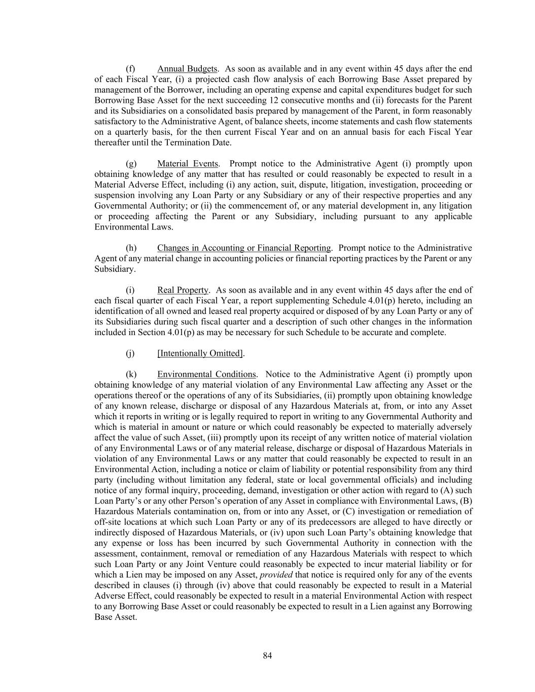 84 (f) Annual Budgets. As soon as available and in any event within 45 days after the end of each Fiscal Year, (i) a projected cash flow analysis of each Borrowing Base Asset prepared by management of the Borrower, including an operating expense and capital expenditures budget for such Borrowing Base Asset for the next succeeding 12 consecutive months and (ii) forecasts for the Parent and its Subsidiaries on a consolidated basis prepared by management of the Parent, in form reasonably satisfactory to the Administrative Agent, of balance sheets, income statements and cash flow statements on a quarterly basis, for the then current Fiscal Year and on an annual basis for each Fiscal Year thereafter until the Termination Date. (g) Material Events. Prompt notice to the Administrative Agent (i) promptly upon obtaining knowledge of any matter that has resulted or could reasonably be expected to result in a Material Adverse Effect, including (i) any action, suit, dispute, litigation, investigation, proceeding or suspension involving any Loan Party or any Subsidiary or any of their respective properties and any Governmental Authority; or (ii) the commencement of, or any material development in, any litigation or proceeding affecting the Parent or any Subsidiary, including pursuant to any applicable Environmental Laws. (h) Changes in Accounting or Financial Reporting. Prompt notice to the Administrative Agent of any material change in accounting policies or financial reporting practices by the Parent or any Subsidiary. (i) Real Property. As soon as available and in any event within 45 days after the end of each fiscal quarter of each Fiscal Year, a report supplementing Schedule 4.01(p) hereto, including an identification of all owned and leased real property acquired or disposed of by any Loan Party or any of its Subsidiaries during such fiscal quarter and a description of such other changes in the information included in Section 4.01(p) as may be necessary for such Schedule to be accurate and complete. (j) [Intentionally Omitted]. (k) Environmental Conditions. Notice to the Administrative Agent (i) promptly upon obtaining knowledge of any material violation of any Environmental Law affecting any Asset or the operations thereof or the operations of any of its Subsidiaries, (ii) promptly upon obtaining knowledge of any known release, discharge or disposal of any Hazardous Materials at, from, or into any Asset which it reports in writing or is legally required to report in writing to any Governmental Authority and which is material in amount or nature or which could reasonably be expected to materially adversely affect the value of such Asset, (iii) promptly upon its receipt of any written notice of material violation of any Environmental Laws or of any material release, discharge or disposal of Hazardous Materials in violation of any Environmental Laws or any matter that could reasonably be expected to result in an Environmental Action, including a notice or claim of liability or potential responsibility from any third party (including without limitation any federal, state or local governmental officials) and including notice of any formal inquiry, proceeding, demand, investigation or other action with regard to (A) such Loan Party’s or any other Person’s operation of any Asset in compliance with Environmental Laws, (B) Hazardous Materials contamination on, from or into any Asset, or (C) investigation or remediation of off-site locations at which such Loan Party or any of its predecessors are alleged to have directly or indirectly disposed of Hazardous Materials, or (iv) upon such Loan Party’s obtaining knowledge that any expense or loss has been incurred by such Governmental Authority in connection with the assessment, containment, removal or remediation of any Hazardous Materials with respect to which such Loan Party or any Joint Venture could reasonably be expected to incur material liability or for which a Lien may be imposed on any Asset, provided that notice is required only for any of the events described in clauses (i) through (iv) above that could reasonably be expected to result in a Material Adverse Effect, could reasonably be expected to result in a material Environmental Action with respect to any Borrowing Base Asset or could reasonably be expected to result in a Lien against any Borrowing Base Asset.