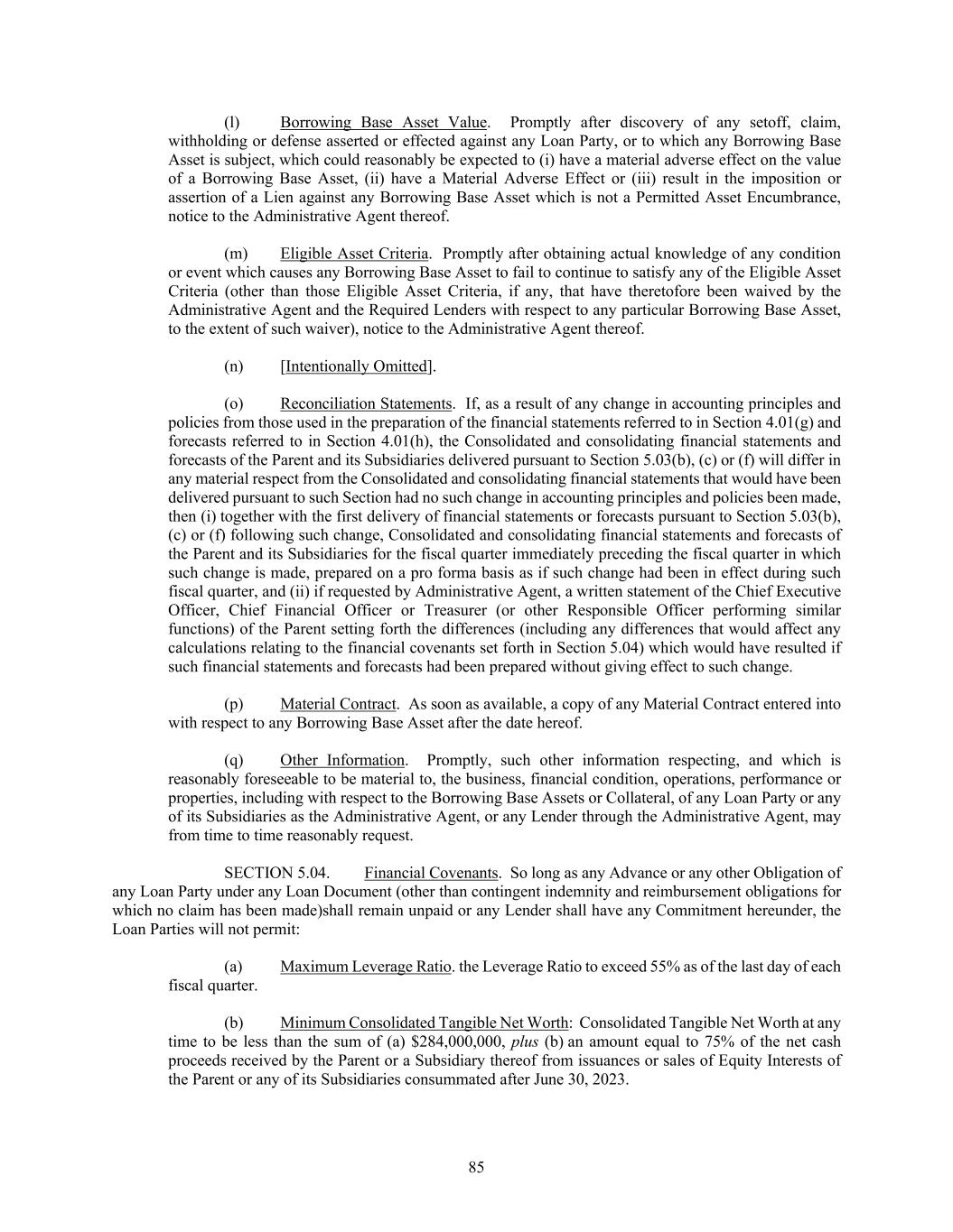 85 (l) Borrowing Base Asset Value. Promptly after discovery of any setoff, claim, withholding or defense asserted or effected against any Loan Party, or to which any Borrowing Base Asset is subject, which could reasonably be expected to (i) have a material adverse effect on the value of a Borrowing Base Asset, (ii) have a Material Adverse Effect or (iii) result in the imposition or assertion of a Lien against any Borrowing Base Asset which is not a Permitted Asset Encumbrance, notice to the Administrative Agent thereof. (m) Eligible Asset Criteria. Promptly after obtaining actual knowledge of any condition or event which causes any Borrowing Base Asset to fail to continue to satisfy any of the Eligible Asset Criteria (other than those Eligible Asset Criteria, if any, that have theretofore been waived by the Administrative Agent and the Required Lenders with respect to any particular Borrowing Base Asset, to the extent of such waiver), notice to the Administrative Agent thereof. (n) [Intentionally Omitted]. (o) Reconciliation Statements. If, as a result of any change in accounting principles and policies from those used in the preparation of the financial statements referred to in Section 4.01(g) and forecasts referred to in Section 4.01(h), the Consolidated and consolidating financial statements and forecasts of the Parent and its Subsidiaries delivered pursuant to Section 5.03(b), (c) or (f) will differ in any material respect from the Consolidated and consolidating financial statements that would have been delivered pursuant to such Section had no such change in accounting principles and policies been made, then (i) together with the first delivery of financial statements or forecasts pursuant to Section 5.03(b), (c) or (f) following such change, Consolidated and consolidating financial statements and forecasts of the Parent and its Subsidiaries for the fiscal quarter immediately preceding the fiscal quarter in which such change is made, prepared on a pro forma basis as if such change had been in effect during such fiscal quarter, and (ii) if requested by Administrative Agent, a written statement of the Chief Executive Officer, Chief Financial Officer or Treasurer (or other Responsible Officer performing similar functions) of the Parent setting forth the differences (including any differences that would affect any calculations relating to the financial covenants set forth in Section 5.04) which would have resulted if such financial statements and forecasts had been prepared without giving effect to such change. (p) Material Contract. As soon as available, a copy of any Material Contract entered into with respect to any Borrowing Base Asset after the date hereof. (q) Other Information. Promptly, such other information respecting, and which is reasonably foreseeable to be material to, the business, financial condition, operations, performance or properties, including with respect to the Borrowing Base Assets or Collateral, of any Loan Party or any of its Subsidiaries as the Administrative Agent, or any Lender through the Administrative Agent, may from time to time reasonably request. SECTION 5.04. Financial Covenants. So long as any Advance or any other Obligation of any Loan Party under any Loan Document (other than contingent indemnity and reimbursement obligations for which no claim has been made)shall remain unpaid or any Lender shall have any Commitment hereunder, the Loan Parties will not permit: (a) Maximum Leverage Ratio. the Leverage Ratio to exceed 55% as of the last day of each fiscal quarter. (b) Minimum Consolidated Tangible Net Worth: Consolidated Tangible Net Worth at any time to be less than the sum of (a) $284,000,000, plus (b) an amount equal to 75% of the net cash proceeds received by the Parent or a Subsidiary thereof from issuances or sales of Equity Interests of the Parent or any of its Subsidiaries consummated after June 30, 2023.