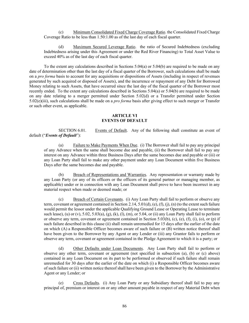 86 (c) Minimum Consolidated Fixed Charge Coverage Ratio. the Consolidated Fixed Charge Coverage Ratio to be less than 1.50:1.00 as of the last day of each fiscal quarter. (d) Maximum Secured Leverage Ratio. the ratio of Secured Indebtedness (excluding Indebtedness arising under this Agreement or under the Red River Financing) to Total Asset Value to exceed 40% as of the last day of each fiscal quarter. To the extent any calculations described in Sections 5.04(a) or 5.04(b) are required to be made on any date of determination other than the last day of a fiscal quarter of the Borrower, such calculations shall be made on a pro forma basis to account for any acquisitions or dispositions of Assets (including in respect of revenues generated by such acquired or disposed of Assets), and the incurrence or repayment of any Debt for Borrowed Money relating to such Assets, that have occurred since the last day of the fiscal quarter of the Borrower most recently ended. To the extent any calculations described in Sections 5.04(a) or 5.04(b) are required to be made on any date relating to a merger permitted under Section 5.02(d) or a Transfer permitted under Section 5.02(e)(iii), such calculations shall be made on a pro forma basis after giving effect to such merger or Transfer or such other event, as applicable. ARTICLE VI EVENTS OF DEFAULT SECTION 6.01. Events of Default. Any of the following shall constitute an event of default (“Events of Default”): (a) Failure to Make Payments When Due. (i) The Borrower shall fail to pay any principal of any Advance when the same shall become due and payable, (ii) the Borrower shall fail to pay any interest on any Advance within three Business Days after the same becomes due and payable or (iii) or any Loan Party shall fail to make any other payment under any Loan Document within five Business Days after the same becomes due and payable. (b) Breach of Representations and Warranties. Any representation or warranty made by any Loan Party (or any of its officers or the officers of its general partner or managing member, as applicable) under or in connection with any Loan Document shall prove to have been incorrect in any material respect when made or deemed made; or (c) Breach of Certain Covenants. (i) Any Loan Party shall fail to perform or observe any term, covenant or agreement contained in Section 2.14, 5.01(d), (e), (f), (j), (n) (to the extent such failure would permit the lessor under the applicable Qualifying Ground Lease or Operating Lease to terminate such lease), (u) or (v), 5.02, 5.03(a), (g), (k), (l), (m), or 5.04, or (ii) any Loan Party shall fail to perform or observe any term, covenant or agreement contained in Section 5.03(b), (c), (e), (f), (i), (o), or (p) if such failure described in this clause (ii) shall remain unremedied for 15 days after the earlier of the date on which (A) a Responsible Officer becomes aware of such failure or (B) written notice thereof shall have been given to the Borrower by any Agent or any Lender or (iii) any Grantor fails to perform or observe any term, covenant or agreement contained in the Pledge Agreement to which it is a party; or (d) Other Defaults under Loan Documents. Any Loan Party shall fail to perform or observe any other term, covenant or agreement (not specified in subsection (a), (b) or (c) above) contained in any Loan Document on its part to be performed or observed if such failure shall remain unremedied for 30 days after the earlier of the date on which (i) a Responsible Officer becomes aware of such failure or (ii) written notice thereof shall have been given to the Borrower by the Administrative Agent or any Lender; or (e) Cross Defaults. (i) Any Loan Party or any Subsidiary thereof shall fail to pay any principal of, premium or interest on or any other amount payable in respect of any Material Debt when