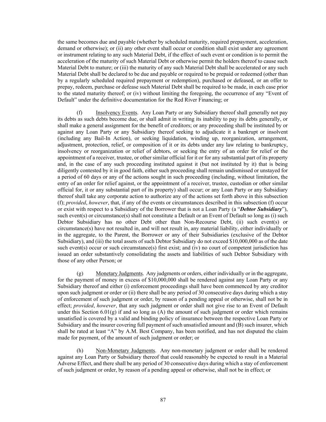 87 the same becomes due and payable (whether by scheduled maturity, required prepayment, acceleration, demand or otherwise); or (ii) any other event shall occur or condition shall exist under any agreement or instrument relating to any such Material Debt, if the effect of such event or condition is to permit the acceleration of the maturity of such Material Debt or otherwise permit the holders thereof to cause such Material Debt to mature; or (iii) the maturity of any such Material Debt shall be accelerated or any such Material Debt shall be declared to be due and payable or required to be prepaid or redeemed (other than by a regularly scheduled required prepayment or redemption), purchased or defeased, or an offer to prepay, redeem, purchase or defease such Material Debt shall be required to be made, in each case prior to the stated maturity thereof; or (iv) without limiting the foregoing, the occurrence of any “Event of Default” under the definitive documentation for the Red River Financing; or (f) Insolvency Events. Any Loan Party or any Subsidiary thereof shall generally not pay its debts as such debts become due, or shall admit in writing its inability to pay its debts generally, or shall make a general assignment for the benefit of creditors; or any proceeding shall be instituted by or against any Loan Party or any Subsidiary thereof seeking to adjudicate it a bankrupt or insolvent (including any Bail-In Action), or seeking liquidation, winding up, reorganization, arrangement, adjustment, protection, relief, or composition of it or its debts under any law relating to bankruptcy, insolvency or reorganization or relief of debtors, or seeking the entry of an order for relief or the appointment of a receiver, trustee, or other similar official for it or for any substantial part of its property and, in the case of any such proceeding instituted against it (but not instituted by it) that is being diligently contested by it in good faith, either such proceeding shall remain undismissed or unstayed for a period of 60 days or any of the actions sought in such proceeding (including, without limitation, the entry of an order for relief against, or the appointment of a receiver, trustee, custodian or other similar official for, it or any substantial part of its property) shall occur; or any Loan Party or any Subsidiary thereof shall take any corporate action to authorize any of the actions set forth above in this subsection (f); provided, however, that, if any of the events or circumstances described in this subsection (f) occur or exist with respect to a Subsidiary of the Borrower that is not a Loan Party (a “Debtor Subsidiary”), such event(s) or circumstance(s) shall not constitute a Default or an Event of Default so long as (i) such Debtor Subsidiary has no other Debt other than Non-Recourse Debt, (ii) such event(s) or circumstance(s) have not resulted in, and will not result in, any material liability, either individually or in the aggregate, to the Parent, the Borrower or any of their Subsidiaries (exclusive of the Debtor Subsidiary), and (iii) the total assets of such Debtor Subsidiary do not exceed $10,000,000 as of the date such event(s) occur or such circumstance(s) first exist; and (iv) no court of competent jurisdiction has issued an order substantively consolidating the assets and liabilities of such Debtor Subsidiary with those of any other Person; or (g) Monetary Judgments. Any judgments or orders, either individually or in the aggregate, for the payment of money in excess of $10,000,000 shall be rendered against any Loan Party or any Subsidiary thereof and either (i) enforcement proceedings shall have been commenced by any creditor upon such judgment or order or (ii) there shall be any period of 30 consecutive days during which a stay of enforcement of such judgment or order, by reason of a pending appeal or otherwise, shall not be in effect; provided, however, that any such judgment or order shall not give rise to an Event of Default under this Section 6.01(g) if and so long as (A) the amount of such judgment or order which remains unsatisfied is covered by a valid and binding policy of insurance between the respective Loan Party or Subsidiary and the insurer covering full payment of such unsatisfied amount and (B) such insurer, which shall be rated at least “A” by A.M. Best Company, has been notified, and has not disputed the claim made for payment, of the amount of such judgment or order; or (h) Non-Monetary Judgments. Any non-monetary judgment or order shall be rendered against any Loan Party or Subsidiary thereof that could reasonably be expected to result in a Material Adverse Effect, and there shall be any period of 30 consecutive days during which a stay of enforcement of such judgment or order, by reason of a pending appeal or otherwise, shall not be in effect; or