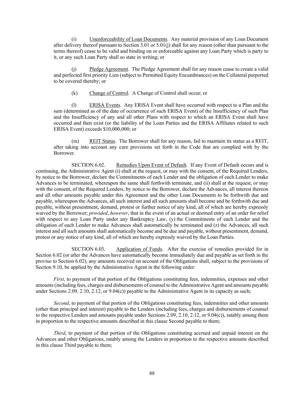 88 (i) Unenforceability of Loan Documents. Any material provision of any Loan Document after delivery thereof pursuant to Section 3.01 or 5.01(j) shall for any reason (other than pursuant to the terms thereof) cease to be valid and binding on or enforceable against any Loan Party which is party to it, or any such Loan Party shall so state in writing; or (j) Pledge Agreement. The Pledge Agreement shall for any reason cease to create a valid and perfected first priority Lien (subject to Permitted Equity Encumbrances) on the Collateral purported to be covered thereby; or (k) Change of Control. A Change of Control shall occur; or (l) ERISA Events. Any ERISA Event shall have occurred with respect to a Plan and the sum (determined as of the date of occurrence of such ERISA Event) of the Insufficiency of such Plan and the Insufficiency of any and all other Plans with respect to which an ERISA Event shall have occurred and then exist (or the liability of the Loan Parties and the ERISA Affiliates related to such ERISA Event) exceeds $10,000,000; or (m) REIT Status. The Borrower shall for any reason, fail to maintain its status as a REIT, after taking into account any cure provisions set forth in the Code that are complied with by the Borrower. SECTION 6.02. Remedies Upon Event of Default. If any Event of Default occurs and is continuing, the Administrative Agent (i) shall at the request, or may with the consent, of the Required Lenders, by notice to the Borrower, declare the Commitments of each Lender and the obligation of each Lender to make Advances to be terminated, whereupon the same shall forthwith terminate, and (ii) shall at the request, or may with the consent, of the Required Lenders, by notice to the Borrower, declare the Advances, all interest thereon and all other amounts payable under this Agreement and the other Loan Documents to be forthwith due and payable, whereupon the Advances, all such interest and all such amounts shall become and be forthwith due and payable, without presentment, demand, protest or further notice of any kind, all of which are hereby expressly waived by the Borrower; provided, however, that in the event of an actual or deemed entry of an order for relief with respect to any Loan Party under any Bankruptcy Law, (y) the Commitments of each Lender and the obligation of each Lender to make Advances shall automatically be terminated and (z) the Advances, all such interest and all such amounts shall automatically become and be due and payable, without presentment, demand, protest or any notice of any kind, all of which are hereby expressly waived by the Loan Parties. SECTION 6.03. Application of Funds. After the exercise of remedies provided for in Section 6.02 (or after the Advances have automatically become immediately due and payable as set forth in the proviso to Section 6.02), any amounts received on account of the Obligations shall, subject to the provisions of Section 9.10, be applied by the Administrative Agent in the following order: First, to payment of that portion of the Obligations constituting fees, indemnities, expenses and other amounts (including fees, charges and disbursements of counsel to the Administrative Agent and amounts payable under Sections 2.09, 2.10, 2.12, or 9.04(c)) payable to the Administrative Agent in its capacity as such; Second, to payment of that portion of the Obligations constituting fees, indemnities and other amounts (other than principal and interest) payable to the Lenders (including fees, charges and disbursements of counsel to the respective Lenders and amounts payable under Sections 2.09, 2.10, 2.12, or 9.04(c)), ratably among them in proportion to the respective amounts described in this clause Second payable to them; Third, to payment of that portion of the Obligations constituting accrued and unpaid interest on the Advances and other Obligations, ratably among the Lenders in proportion to the respective amounts described in this clause Third payable to them;