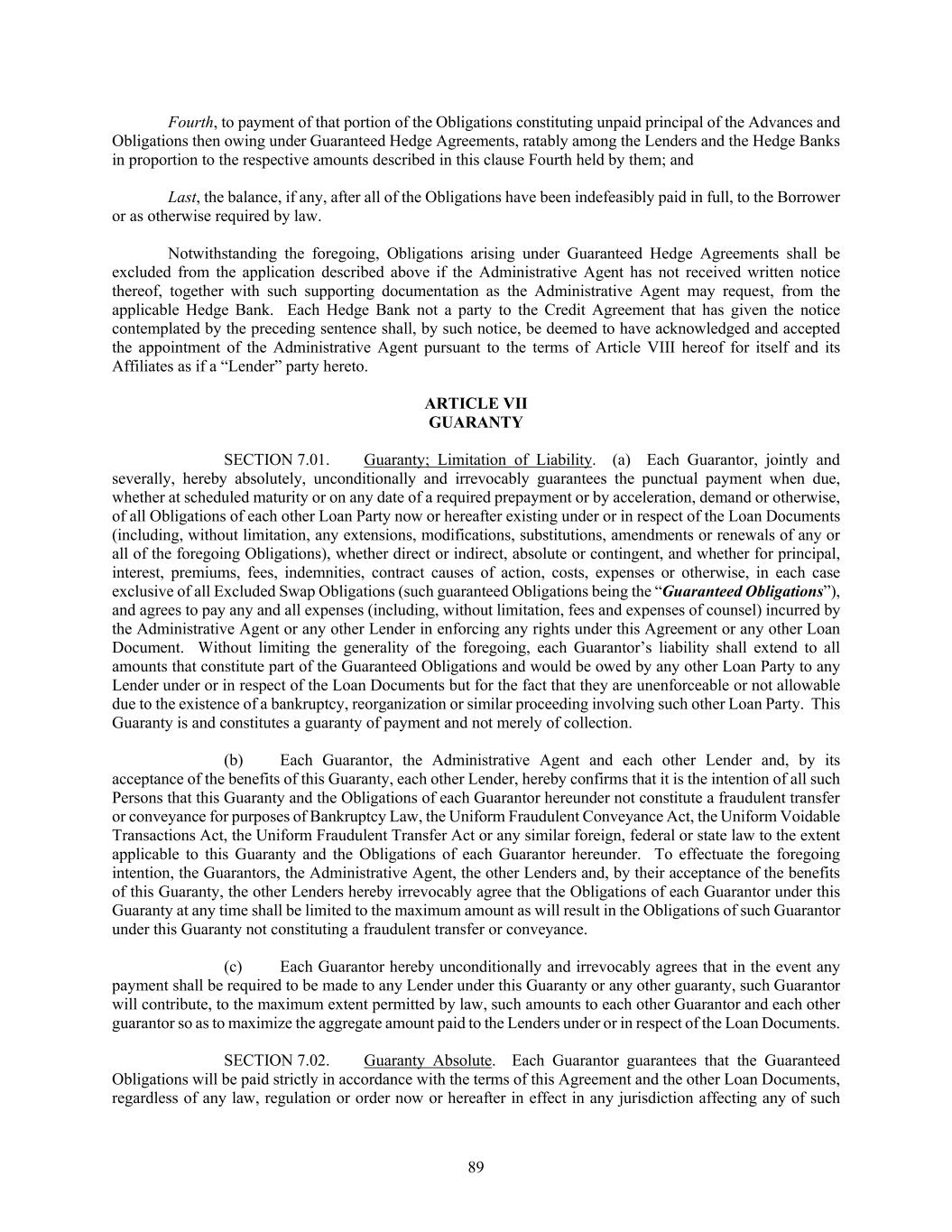 89 Fourth, to payment of that portion of the Obligations constituting unpaid principal of the Advances and Obligations then owing under Guaranteed Hedge Agreements, ratably among the Lenders and the Hedge Banks in proportion to the respective amounts described in this clause Fourth held by them; and Last, the balance, if any, after all of the Obligations have been indefeasibly paid in full, to the Borrower or as otherwise required by law. Notwithstanding the foregoing, Obligations arising under Guaranteed Hedge Agreements shall be excluded from the application described above if the Administrative Agent has not received written notice thereof, together with such supporting documentation as the Administrative Agent may request, from the applicable Hedge Bank. Each Hedge Bank not a party to the Credit Agreement that has given the notice contemplated by the preceding sentence shall, by such notice, be deemed to have acknowledged and accepted the appointment of the Administrative Agent pursuant to the terms of Article VIII hereof for itself and its Affiliates as if a “Lender” party hereto. ARTICLE VII GUARANTY SECTION 7.01. Guaranty; Limitation of Liability. (a) Each Guarantor, jointly and severally, hereby absolutely, unconditionally and irrevocably guarantees the punctual payment when due, whether at scheduled maturity or on any date of a required prepayment or by acceleration, demand or otherwise, of all Obligations of each other Loan Party now or hereafter existing under or in respect of the Loan Documents (including, without limitation, any extensions, modifications, substitutions, amendments or renewals of any or all of the foregoing Obligations), whether direct or indirect, absolute or contingent, and whether for principal, interest, premiums, fees, indemnities, contract causes of action, costs, expenses or otherwise, in each case exclusive of all Excluded Swap Obligations (such guaranteed Obligations being the “Guaranteed Obligations”), and agrees to pay any and all expenses (including, without limitation, fees and expenses of counsel) incurred by the Administrative Agent or any other Lender in enforcing any rights under this Agreement or any other Loan Document. Without limiting the generality of the foregoing, each Guarantor’s liability shall extend to all amounts that constitute part of the Guaranteed Obligations and would be owed by any other Loan Party to any Lender under or in respect of the Loan Documents but for the fact that they are unenforceable or not allowable due to the existence of a bankruptcy, reorganization or similar proceeding involving such other Loan Party. This Guaranty is and constitutes a guaranty of payment and not merely of collection. (b) Each Guarantor, the Administrative Agent and each other Lender and, by its acceptance of the benefits of this Guaranty, each other Lender, hereby confirms that it is the intention of all such Persons that this Guaranty and the Obligations of each Guarantor hereunder not constitute a fraudulent transfer or conveyance for purposes of Bankruptcy Law, the Uniform Fraudulent Conveyance Act, the Uniform Voidable Transactions Act, the Uniform Fraudulent Transfer Act or any similar foreign, federal or state law to the extent applicable to this Guaranty and the Obligations of each Guarantor hereunder. To effectuate the foregoing intention, the Guarantors, the Administrative Agent, the other Lenders and, by their acceptance of the benefits of this Guaranty, the other Lenders hereby irrevocably agree that the Obligations of each Guarantor under this Guaranty at any time shall be limited to the maximum amount as will result in the Obligations of such Guarantor under this Guaranty not constituting a fraudulent transfer or conveyance. (c) Each Guarantor hereby unconditionally and irrevocably agrees that in the event any payment shall be required to be made to any Lender under this Guaranty or any other guaranty, such Guarantor will contribute, to the maximum extent permitted by law, such amounts to each other Guarantor and each other guarantor so as to maximize the aggregate amount paid to the Lenders under or in respect of the Loan Documents. SECTION 7.02. Guaranty Absolute. Each Guarantor guarantees that the Guaranteed Obligations will be paid strictly in accordance with the terms of this Agreement and the other Loan Documents, regardless of any law, regulation or order now or hereafter in effect in any jurisdiction affecting any of such