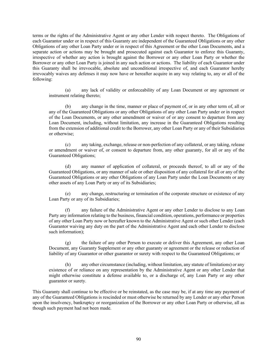 90 terms or the rights of the Administrative Agent or any other Lender with respect thereto. The Obligations of each Guarantor under or in respect of this Guaranty are independent of the Guaranteed Obligations or any other Obligations of any other Loan Party under or in respect of this Agreement or the other Loan Documents, and a separate action or actions may be brought and prosecuted against each Guarantor to enforce this Guaranty, irrespective of whether any action is brought against the Borrower or any other Loan Party or whether the Borrower or any other Loan Party is joined in any such action or actions. The liability of each Guarantor under this Guaranty shall be irrevocable, absolute and unconditional irrespective of, and each Guarantor hereby irrevocably waives any defenses it may now have or hereafter acquire in any way relating to, any or all of the following: (a) any lack of validity or enforceability of any Loan Document or any agreement or instrument relating thereto; (b) any change in the time, manner or place of payment of, or in any other term of, all or any of the Guaranteed Obligations or any other Obligations of any other Loan Party under or in respect of the Loan Documents, or any other amendment or waiver of or any consent to departure from any Loan Document, including, without limitation, any increase in the Guaranteed Obligations resulting from the extension of additional credit to the Borrower, any other Loan Party or any of their Subsidiaries or otherwise; (c) any taking, exchange, release or non-perfection of any collateral, or any taking, release or amendment or waiver of, or consent to departure from, any other guaranty, for all or any of the Guaranteed Obligations; (d) any manner of application of collateral, or proceeds thereof, to all or any of the Guaranteed Obligations, or any manner of sale or other disposition of any collateral for all or any of the Guaranteed Obligations or any other Obligations of any Loan Party under the Loan Documents or any other assets of any Loan Party or any of its Subsidiaries; (e) any change, restructuring or termination of the corporate structure or existence of any Loan Party or any of its Subsidiaries; (f) any failure of the Administrative Agent or any other Lender to disclose to any Loan Party any information relating to the business, financial condition, operations, performance or properties of any other Loan Party now or hereafter known to the Administrative Agent or such other Lender (each Guarantor waiving any duty on the part of the Administrative Agent and each other Lender to disclose such information); (g) the failure of any other Person to execute or deliver this Agreement, any other Loan Document, any Guaranty Supplement or any other guaranty or agreement or the release or reduction of liability of any Guarantor or other guarantor or surety with respect to the Guaranteed Obligations; or (h) any other circumstance (including, without limitation, any statute of limitations) or any existence of or reliance on any representation by the Administrative Agent or any other Lender that might otherwise constitute a defense available to, or a discharge of, any Loan Party or any other guarantor or surety. This Guaranty shall continue to be effective or be reinstated, as the case may be, if at any time any payment of any of the Guaranteed Obligations is rescinded or must otherwise be returned by any Lender or any other Person upon the insolvency, bankruptcy or reorganization of the Borrower or any other Loan Party or otherwise, all as though such payment had not been made.