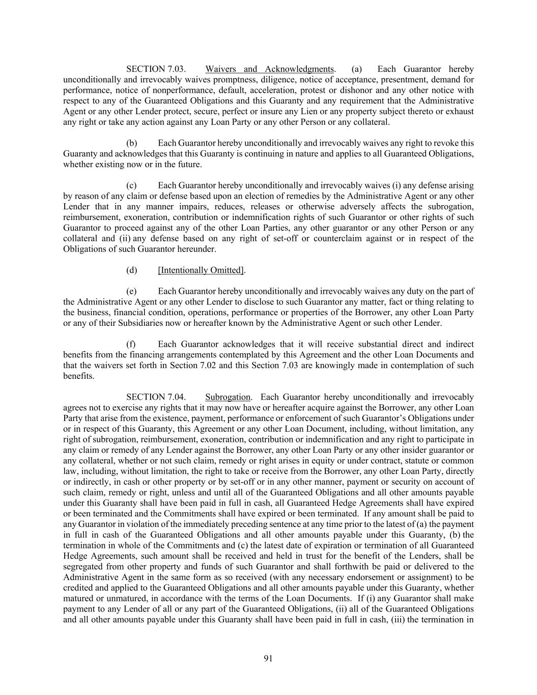91 SECTION 7.03. Waivers and Acknowledgments. (a) Each Guarantor hereby unconditionally and irrevocably waives promptness, diligence, notice of acceptance, presentment, demand for performance, notice of nonperformance, default, acceleration, protest or dishonor and any other notice with respect to any of the Guaranteed Obligations and this Guaranty and any requirement that the Administrative Agent or any other Lender protect, secure, perfect or insure any Lien or any property subject thereto or exhaust any right or take any action against any Loan Party or any other Person or any collateral. (b) Each Guarantor hereby unconditionally and irrevocably waives any right to revoke this Guaranty and acknowledges that this Guaranty is continuing in nature and applies to all Guaranteed Obligations, whether existing now or in the future. (c) Each Guarantor hereby unconditionally and irrevocably waives (i) any defense arising by reason of any claim or defense based upon an election of remedies by the Administrative Agent or any other Lender that in any manner impairs, reduces, releases or otherwise adversely affects the subrogation, reimbursement, exoneration, contribution or indemnification rights of such Guarantor or other rights of such Guarantor to proceed against any of the other Loan Parties, any other guarantor or any other Person or any collateral and (ii) any defense based on any right of set-off or counterclaim against or in respect of the Obligations of such Guarantor hereunder. (d) [Intentionally Omitted]. (e) Each Guarantor hereby unconditionally and irrevocably waives any duty on the part of the Administrative Agent or any other Lender to disclose to such Guarantor any matter, fact or thing relating to the business, financial condition, operations, performance or properties of the Borrower, any other Loan Party or any of their Subsidiaries now or hereafter known by the Administrative Agent or such other Lender. (f) Each Guarantor acknowledges that it will receive substantial direct and indirect benefits from the financing arrangements contemplated by this Agreement and the other Loan Documents and that the waivers set forth in Section 7.02 and this Section 7.03 are knowingly made in contemplation of such benefits. SECTION 7.04. Subrogation. Each Guarantor hereby unconditionally and irrevocably agrees not to exercise any rights that it may now have or hereafter acquire against the Borrower, any other Loan Party that arise from the existence, payment, performance or enforcement of such Guarantor’s Obligations under or in respect of this Guaranty, this Agreement or any other Loan Document, including, without limitation, any right of subrogation, reimbursement, exoneration, contribution or indemnification and any right to participate in any claim or remedy of any Lender against the Borrower, any other Loan Party or any other insider guarantor or any collateral, whether or not such claim, remedy or right arises in equity or under contract, statute or common law, including, without limitation, the right to take or receive from the Borrower, any other Loan Party, directly or indirectly, in cash or other property or by set-off or in any other manner, payment or security on account of such claim, remedy or right, unless and until all of the Guaranteed Obligations and all other amounts payable under this Guaranty shall have been paid in full in cash, all Guaranteed Hedge Agreements shall have expired or been terminated and the Commitments shall have expired or been terminated. If any amount shall be paid to any Guarantor in violation of the immediately preceding sentence at any time prior to the latest of (a) the payment in full in cash of the Guaranteed Obligations and all other amounts payable under this Guaranty, (b) the termination in whole of the Commitments and (c) the latest date of expiration or termination of all Guaranteed Hedge Agreements, such amount shall be received and held in trust for the benefit of the Lenders, shall be segregated from other property and funds of such Guarantor and shall forthwith be paid or delivered to the Administrative Agent in the same form as so received (with any necessary endorsement or assignment) to be credited and applied to the Guaranteed Obligations and all other amounts payable under this Guaranty, whether matured or unmatured, in accordance with the terms of the Loan Documents. If (i) any Guarantor shall make payment to any Lender of all or any part of the Guaranteed Obligations, (ii) all of the Guaranteed Obligations and all other amounts payable under this Guaranty shall have been paid in full in cash, (iii) the termination in