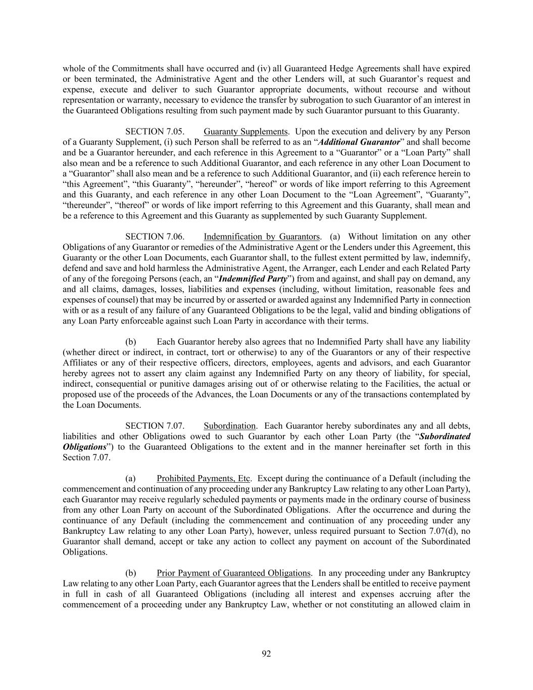 92 whole of the Commitments shall have occurred and (iv) all Guaranteed Hedge Agreements shall have expired or been terminated, the Administrative Agent and the other Lenders will, at such Guarantor’s request and expense, execute and deliver to such Guarantor appropriate documents, without recourse and without representation or warranty, necessary to evidence the transfer by subrogation to such Guarantor of an interest in the Guaranteed Obligations resulting from such payment made by such Guarantor pursuant to this Guaranty. SECTION 7.05. Guaranty Supplements. Upon the execution and delivery by any Person of a Guaranty Supplement, (i) such Person shall be referred to as an “Additional Guarantor” and shall become and be a Guarantor hereunder, and each reference in this Agreement to a “Guarantor” or a “Loan Party” shall also mean and be a reference to such Additional Guarantor, and each reference in any other Loan Document to a “Guarantor” shall also mean and be a reference to such Additional Guarantor, and (ii) each reference herein to “this Agreement”, “this Guaranty”, “hereunder”, “hereof” or words of like import referring to this Agreement and this Guaranty, and each reference in any other Loan Document to the “Loan Agreement”, “Guaranty”, “thereunder”, “thereof” or words of like import referring to this Agreement and this Guaranty, shall mean and be a reference to this Agreement and this Guaranty as supplemented by such Guaranty Supplement. SECTION 7.06. Indemnification by Guarantors. (a) Without limitation on any other Obligations of any Guarantor or remedies of the Administrative Agent or the Lenders under this Agreement, this Guaranty or the other Loan Documents, each Guarantor shall, to the fullest extent permitted by law, indemnify, defend and save and hold harmless the Administrative Agent, the Arranger, each Lender and each Related Party of any of the foregoing Persons (each, an “Indemnified Party”) from and against, and shall pay on demand, any and all claims, damages, losses, liabilities and expenses (including, without limitation, reasonable fees and expenses of counsel) that may be incurred by or asserted or awarded against any Indemnified Party in connection with or as a result of any failure of any Guaranteed Obligations to be the legal, valid and binding obligations of any Loan Party enforceable against such Loan Party in accordance with their terms. (b) Each Guarantor hereby also agrees that no Indemnified Party shall have any liability (whether direct or indirect, in contract, tort or otherwise) to any of the Guarantors or any of their respective Affiliates or any of their respective officers, directors, employees, agents and advisors, and each Guarantor hereby agrees not to assert any claim against any Indemnified Party on any theory of liability, for special, indirect, consequential or punitive damages arising out of or otherwise relating to the Facilities, the actual or proposed use of the proceeds of the Advances, the Loan Documents or any of the transactions contemplated by the Loan Documents. SECTION 7.07. Subordination. Each Guarantor hereby subordinates any and all debts, liabilities and other Obligations owed to such Guarantor by each other Loan Party (the “Subordinated Obligations”) to the Guaranteed Obligations to the extent and in the manner hereinafter set forth in this Section 7.07. (a) Prohibited Payments, Etc. Except during the continuance of a Default (including the commencement and continuation of any proceeding under any Bankruptcy Law relating to any other Loan Party), each Guarantor may receive regularly scheduled payments or payments made in the ordinary course of business from any other Loan Party on account of the Subordinated Obligations. After the occurrence and during the continuance of any Default (including the commencement and continuation of any proceeding under any Bankruptcy Law relating to any other Loan Party), however, unless required pursuant to Section 7.07(d), no Guarantor shall demand, accept or take any action to collect any payment on account of the Subordinated Obligations. (b) Prior Payment of Guaranteed Obligations. In any proceeding under any Bankruptcy Law relating to any other Loan Party, each Guarantor agrees that the Lenders shall be entitled to receive payment in full in cash of all Guaranteed Obligations (including all interest and expenses accruing after the commencement of a proceeding under any Bankruptcy Law, whether or not constituting an allowed claim in