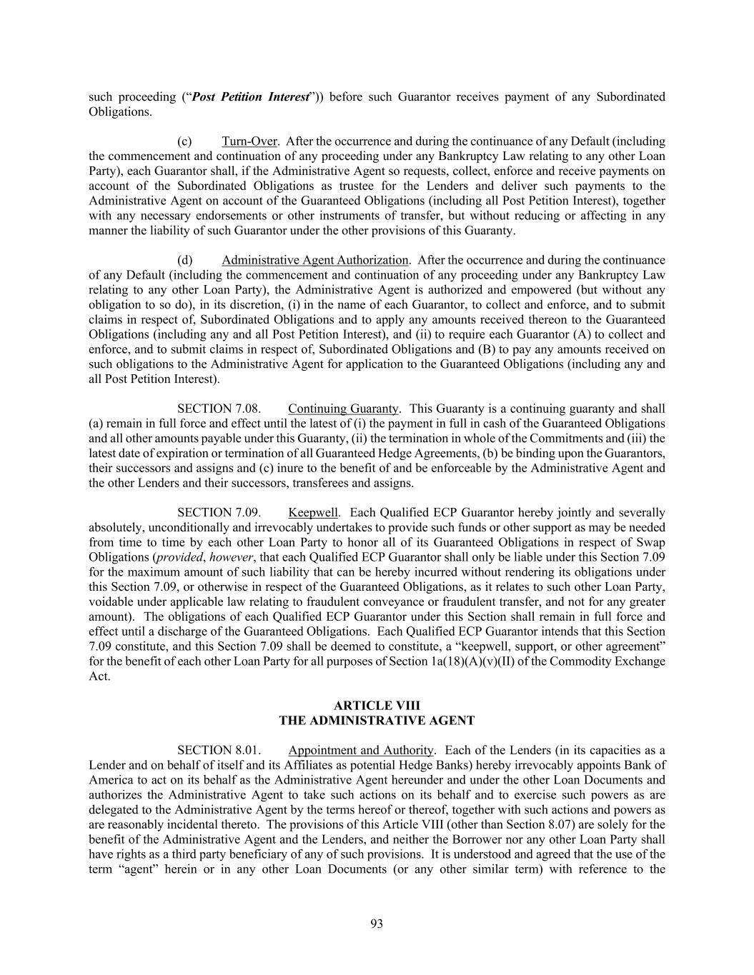 93 such proceeding (“Post Petition Interest”)) before such Guarantor receives payment of any Subordinated Obligations. (c) Turn-Over. After the occurrence and during the continuance of any Default (including the commencement and continuation of any proceeding under any Bankruptcy Law relating to any other Loan Party), each Guarantor shall, if the Administrative Agent so requests, collect, enforce and receive payments on account of the Subordinated Obligations as trustee for the Lenders and deliver such payments to the Administrative Agent on account of the Guaranteed Obligations (including all Post Petition Interest), together with any necessary endorsements or other instruments of transfer, but without reducing or affecting in any manner the liability of such Guarantor under the other provisions of this Guaranty. (d) Administrative Agent Authorization. After the occurrence and during the continuance of any Default (including the commencement and continuation of any proceeding under any Bankruptcy Law relating to any other Loan Party), the Administrative Agent is authorized and empowered (but without any obligation to so do), in its discretion, (i) in the name of each Guarantor, to collect and enforce, and to submit claims in respect of, Subordinated Obligations and to apply any amounts received thereon to the Guaranteed Obligations (including any and all Post Petition Interest), and (ii) to require each Guarantor (A) to collect and enforce, and to submit claims in respect of, Subordinated Obligations and (B) to pay any amounts received on such obligations to the Administrative Agent for application to the Guaranteed Obligations (including any and all Post Petition Interest). SECTION 7.08. Continuing Guaranty. This Guaranty is a continuing guaranty and shall (a) remain in full force and effect until the latest of (i) the payment in full in cash of the Guaranteed Obligations and all other amounts payable under this Guaranty, (ii) the termination in whole of the Commitments and (iii) the latest date of expiration or termination of all Guaranteed Hedge Agreements, (b) be binding upon the Guarantors, their successors and assigns and (c) inure to the benefit of and be enforceable by the Administrative Agent and the other Lenders and their successors, transferees and assigns. SECTION 7.09. Keepwell. Each Qualified ECP Guarantor hereby jointly and severally absolutely, unconditionally and irrevocably undertakes to provide such funds or other support as may be needed from time to time by each other Loan Party to honor all of its Guaranteed Obligations in respect of Swap Obligations (provided, however, that each Qualified ECP Guarantor shall only be liable under this Section 7.09 for the maximum amount of such liability that can be hereby incurred without rendering its obligations under this Section 7.09, or otherwise in respect of the Guaranteed Obligations, as it relates to such other Loan Party, voidable under applicable law relating to fraudulent conveyance or fraudulent transfer, and not for any greater amount). The obligations of each Qualified ECP Guarantor under this Section shall remain in full force and effect until a discharge of the Guaranteed Obligations. Each Qualified ECP Guarantor intends that this Section 7.09 constitute, and this Section 7.09 shall be deemed to constitute, a “keepwell, support, or other agreement” for the benefit of each other Loan Party for all purposes of Section 1a(18)(A)(v)(II) of the Commodity Exchange Act. ARTICLE VIII THE ADMINISTRATIVE AGENT SECTION 8.01. Appointment and Authority. Each of the Lenders (in its capacities as a Lender and on behalf of itself and its Affiliates as potential Hedge Banks) hereby irrevocably appoints Bank of America to act on its behalf as the Administrative Agent hereunder and under the other Loan Documents and authorizes the Administrative Agent to take such actions on its behalf and to exercise such powers as are delegated to the Administrative Agent by the terms hereof or thereof, together with such actions and powers as are reasonably incidental thereto. The provisions of this Article VIII (other than Section 8.07) are solely for the benefit of the Administrative Agent and the Lenders, and neither the Borrower nor any other Loan Party shall have rights as a third party beneficiary of any of such provisions. It is understood and agreed that the use of the term “agent” herein or in any other Loan Documents (or any other similar term) with reference to the
