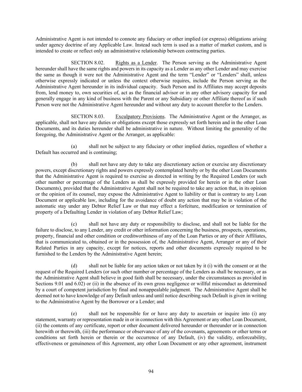 94 Administrative Agent is not intended to connote any fiduciary or other implied (or express) obligations arising under agency doctrine of any Applicable Law. Instead such term is used as a matter of market custom, and is intended to create or reflect only an administrative relationship between contracting parties. SECTION 8.02. Rights as a Lender. The Person serving as the Administrative Agent hereunder shall have the same rights and powers in its capacity as a Lender as any other Lender and may exercise the same as though it were not the Administrative Agent and the term “Lender” or “Lenders” shall, unless otherwise expressly indicated or unless the context otherwise requires, include the Person serving as the Administrative Agent hereunder in its individual capacity. Such Person and its Affiliates may accept deposits from, lend money to, own securities of, act as the financial advisor or in any other advisory capacity for and generally engage in any kind of business with the Parent or any Subsidiary or other Affiliate thereof as if such Person were not the Administrative Agent hereunder and without any duty to account therefor to the Lenders. SECTION 8.03. Exculpatory Provisions. The Administrative Agent or the Arranger, as applicable, shall not have any duties or obligations except those expressly set forth herein and in the other Loan Documents, and its duties hereunder shall be administrative in nature. Without limiting the generality of the foregoing, the Administrative Agent or the Arranger, as applicable: (a) shall not be subject to any fiduciary or other implied duties, regardless of whether a Default has occurred and is continuing; (b) shall not have any duty to take any discretionary action or exercise any discretionary powers, except discretionary rights and powers expressly contemplated hereby or by the other Loan Documents that the Administrative Agent is required to exercise as directed in writing by the Required Lenders (or such other number or percentage of the Lenders as shall be expressly provided for herein or in the other Loan Documents), provided that the Administrative Agent shall not be required to take any action that, in its opinion or the opinion of its counsel, may expose the Administrative Agent to liability or that is contrary to any Loan Document or applicable law, including for the avoidance of doubt any action that may be in violation of the automatic stay under any Debtor Relief Law or that may effect a forfeiture, modification or termination of property of a Defaulting Lender in violation of any Debtor Relief Law; (c) shall not have any duty or responsibility to disclose, and shall not be liable for the failure to disclose, to any Lender, any credit or other information concerning the business, prospects, operations, property, financial and other condition or creditworthiness of any of the Loan Parties or any of their Affiliates, that is communicated to, obtained or in the possession of, the Administrative Agent, Arranger or any of their Related Parties in any capacity, except for notices, reports and other documents expressly required to be furnished to the Lenders by the Administrative Agent herein; (d) shall not be liable for any action taken or not taken by it (i) with the consent or at the request of the Required Lenders (or such other number or percentage of the Lenders as shall be necessary, or as the Administrative Agent shall believe in good faith shall be necessary, under the circumstances as provided in Sections 9.01 and 6.02) or (ii) in the absence of its own gross negligence or willful misconduct as determined by a court of competent jurisdiction by final and nonappealable judgment. The Administrative Agent shall be deemed not to have knowledge of any Default unless and until notice describing such Default is given in writing to the Administrative Agent by the Borrower or a Lender; and (e) shall not be responsible for or have any duty to ascertain or inquire into (i) any statement, warranty or representation made in or in connection with this Agreement or any other Loan Document, (ii) the contents of any certificate, report or other document delivered hereunder or thereunder or in connection herewith or therewith, (iii) the performance or observance of any of the covenants, agreements or other terms or conditions set forth herein or therein or the occurrence of any Default, (iv) the validity, enforceability, effectiveness or genuineness of this Agreement, any other Loan Document or any other agreement, instrument